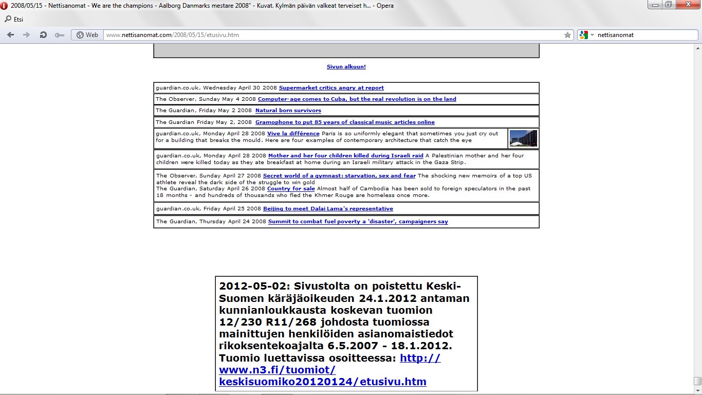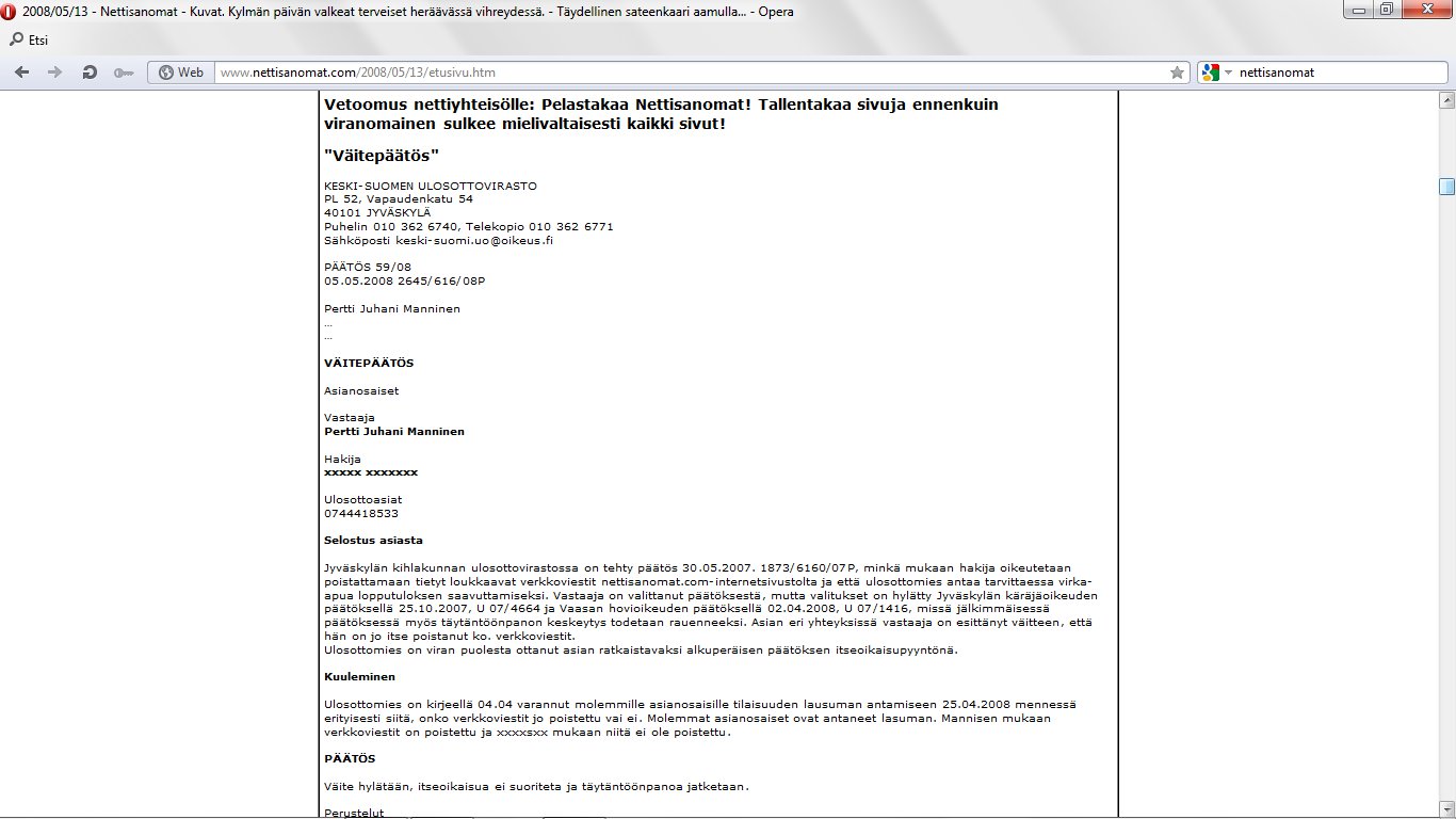 Nettisanomat 2012/07/01 - LIITE. Sivuja, joissa tuomio on pantu täytäntöön. Sivut 279-288/ 565 - VALITUSLUPAHAKEMUS KORKEIMMALLE OIKEUDELLE: Tuomio ja seuraamismääräys sellaisesta rikolliseksi väitetystä teosta, jota ei ole käsitelty oikeudessa ja oikeudessa rikolliseksi todettu, ei ole kansanvaltaisen oikeusvaltion oikeusjärjestyksen mukainen. - Kuva. Poika ja koira. - Kuva. Käden ojennus. Karuselli. - Sunnuntai 01.07.2012 - oikeussivu - Nettisanomat - Sanomanetti - Blogi: Viikkosanomat.fi - Kuvasanomat - Sanomatori - Viikkosanomat - Härkää sarvista - 12.fi - Korkein oikeus, sananvapaus, rajoittaminen, tuomio, käräjäoikeus, kansanvaltainen oikeusvaltio, oikeusjärjestys |