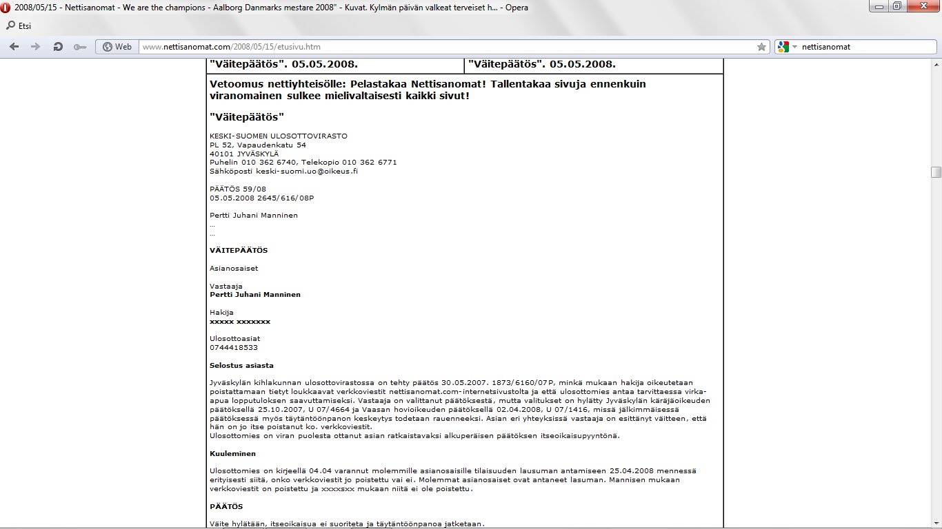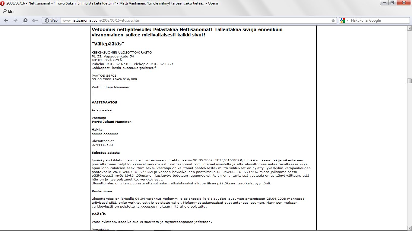 ASIA Valituslupahakemus ja valitus. MUUTOKSENHAUN KOHDE Vaasan hovioikeuden 20.4.2012 antama tuomio nro 438 kunnianloukkausasiassa R 12/275 HAKIJA Manninen, Pertti Juhani I VALITUSLUPAHAKEMUS PERUSTE Pyydän kunnioittavasti, että korkein oikeus myöntäisi minulle luvan hakea muutosta yllämainittuun hovioikeuden tuomioon, koska 1) siihen on erityistä aihetta asiassa tapahtuneen sellaisen oikeudenkäyntivirheen takia, jonka perusteella ratkaisu olisi purettava tai poistettava 2) siihen on erityistä aihetta asiassa tapahtuneen muun virheen takia, jonka perusteella ratkaisu olisi purettava tai poistettava 3) lain soveltamisen kannalta muissa samanlaisissa tapauksissa on tärkeätä saattaa asia Korkeimman oikeuden ratkaistavaksi PERUSTELUT 1. Hovioikeus on evännyt jatkokäsittelyluvan perustelunaan, ettei ole syytä epäillä käräjäoikeuden ratkaisun lopputuloksen oikeellisuutta. Ratkaisu on sananvapauslain vastainen, kun siinä vastoin lain määräystä rajoitetaan tarpeettomasti sananvapautta. 2. Hovioikeus on jättänyt voimaan sellaisen käräjäoikeuden tuomion, jossa käräjäoikeus on määrännyt rangaistuksen ja seuraamukset sellaisista asioista (kirjoituksista), joita ei ollenkaan käsitelty käräjäoikeudessa. Lisäksi käräjäoikeus on määrännyt poistettavaksi sellaisenaan (ilman minkäänlaista kommentointia) julkaistut oikeudenkäyntipöytäkirjat. II VALITUS VAATIMUKSET Kunnioittavasti pyydän, että korkein oikeus kumoaa käräjäoikeuden ja hovioikeuden tuomiot. PERUSTELUT Toistan kaikki tässä asiassa aikaisemmin suullisesti lausumani ja esille tuomani kirjallisen materiaalin. Tarkoitukseni ei ole ollut loukata asianomistajien kunniaa, vaan kirjoittaa ja selostaa asianomistajien toimintaa niin kuin se on oikeasti tapahtunut. Tällaisten asioiden esille tuominen ja siitä kirjoittaminen ei voi olla loukkaavaa eikä tällä mitenkään väitetä, että asianomistajat olisivat olleet mukana jossakin lainvastaisessa toiminnassa. Asianomistaja Lauri Kara on esittänyt kaksi kirjoitusta, jotka ovat mukana oikeudenkäyntiaineistossa ja lukuisan joukon hakutuloksia, jotka tulevat näistä kirjoituksista ja myös oikeudenkäyntipöytäkirjoista. Käräjäoikeus on määrännyt näistä kirjoituksista poistettavaksi asiaosaistiedot, jotka olivat edellä kerrotun mukaan jo poistettu ennen oikeudenkäyntiä, joista dokumentit esitettiin käräjäoikeuden istunnon aikana ja jotka ovat mukana oikeudenkäyntiaineistossa. Käräjäoikeus on vastoin lain selvää määräystä siitä, että sananvapautta ei pidä tarpeettomasti rajoittaa, menetellyt juuri näin. Näiden kirjoitusten lisäksi käräjäoikeus määräsi poistettavaksi asianosaistiedot myös sellaisista kirjoituksista ja oikeudenkäyntipöytäkirjoista, jotka eivät olleet kirjallisina todisteina tai joita ei muutenkaan käsitelty oikeudenkäynnissä. Oikeudenkäyntipöytäkirjojen osalta tosin käräjäoikeus totesi riittämättömin perustein, että niistä asianosaistiedot piti poistaa, koska pöytäkirjat oli julkaistu "kunnianloukkaustarkoituksessa". Muiden kirjoitusten osalta oikeus katsoi niitä siis mitenkään käsittelemättä, että ne loukkasivat asianomistajan kunniaa. Käräjäoikeus on vastoin lain selvää määräystä siitä, että sananvapautta ei pidä tarpeettomasti rajoittaa, menetellyt juuri näin. TÄYTÄNTÖÖNPANO ja "Vastaus kuulemiskirjeeseen 27/IJJ (Kihlakunnanvouti Iivari Järvinen) Oheisissa liitteissä on sivut siitä aineistosta, jotka käräjäoikeuden tuomion mukaan piti poistaa, mutta jota aineistoa ei ollenkaan käsitelty oikeudenistunnossa. Pyydän, että tämä aineisto otetaan huomioon kirjallisina todisteina, koska sitä ei ollut vielä silloin poistot tehtyinä, kun hovioikeus teki päätöksensä siitä, että se ei ota valitustani käsittelyyn. Nämä todisteet osoittavat sen, että käräjäoikeus on tarpeettomasti rajoittanut sananvapautta, koska niissä ei ole mitään asianomistajien kunniaa loukkaavaa. ASIANOMISTAJIEN ERILLISYYS Vaikka käräjäoikeuden tuomio on yhteinen molempien asianomistajien kanssa, niin tietenkään Lauri Karan esittämät kunniaansa loukkaavaksi väittämänsä kirjoitukset eivät loukkaa Pekka Monosen kunniaa, jollei tämä asianomistaja näin väitä. Näin hän ei oikeudenkäynnissä missään yhteydessä väittänyt, joten asianosaistietojen poistovaatimus voi koskea vain Lauri Karaa näissä kirjoituksissa. Käräjäoikeus ei ole tätä rajannut ja on siis tältäkin osin rajoittanut tarpeettomasti sananvapautta tässä asiassa. Mikäli korkein oikeus kuitenkin katsoo minun syyllistyneen kunnianloukkausrikokseen ja määrää siitä rangaistuksen pyydän kunnioittavasti seuraavaa: 1) Rangaistusseuraamus Pyydän lieventämään rangaistusta. 2) Korvausvelvollisuus Pyydän lieventämään korvausvelvollisuutta hovioikeuteen jättämäni pyynnön mukaisesti koskien Pekka Monosen ja Lauri Karan vaatimuksia.. 3) Verkkoviestin jakelun keskeyttäminen Lähtökohtana mainittua lakia sovellettaessa on lain 1 §:n 2 momentin mukaan, että viestintään ei saa puuttua enempää kuin on välttämätöntä ottaen huomioon sananvapauden merkitys kansanvaltaisessa oikeusvaltiossa. Asianomistajien vaatimus ja käräjäoikeuden tuomio on edellä esitettyjen lainkohtien mukaan liian laaja. Poistamisvaatimus voi näin ollen kohdistua vain siihen aineistoon, joka oikeudessa esiteltiin ja käsiteltiin ja joka todettiin rikolliseksi, kunniaa loukkaavaksi. Tuomio ja seuraamismääräys sellaisesta rikolliseksi väitetystä teosta, jota ei ole käsitelty oikeudessa ja oikeudessa rikolliseksi todettu, ei ole kansanvaltaisen oikeusvaltion oikeusjärjestyksen mukainen. LIITTEET Kunnioittavasti PÄIVÄYS Laukaassa kesäkuun 18. päivänä 2012 Pertti Manninen |