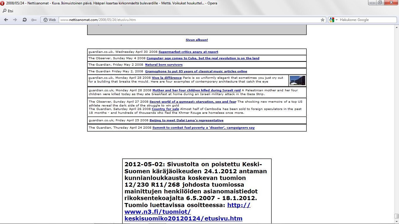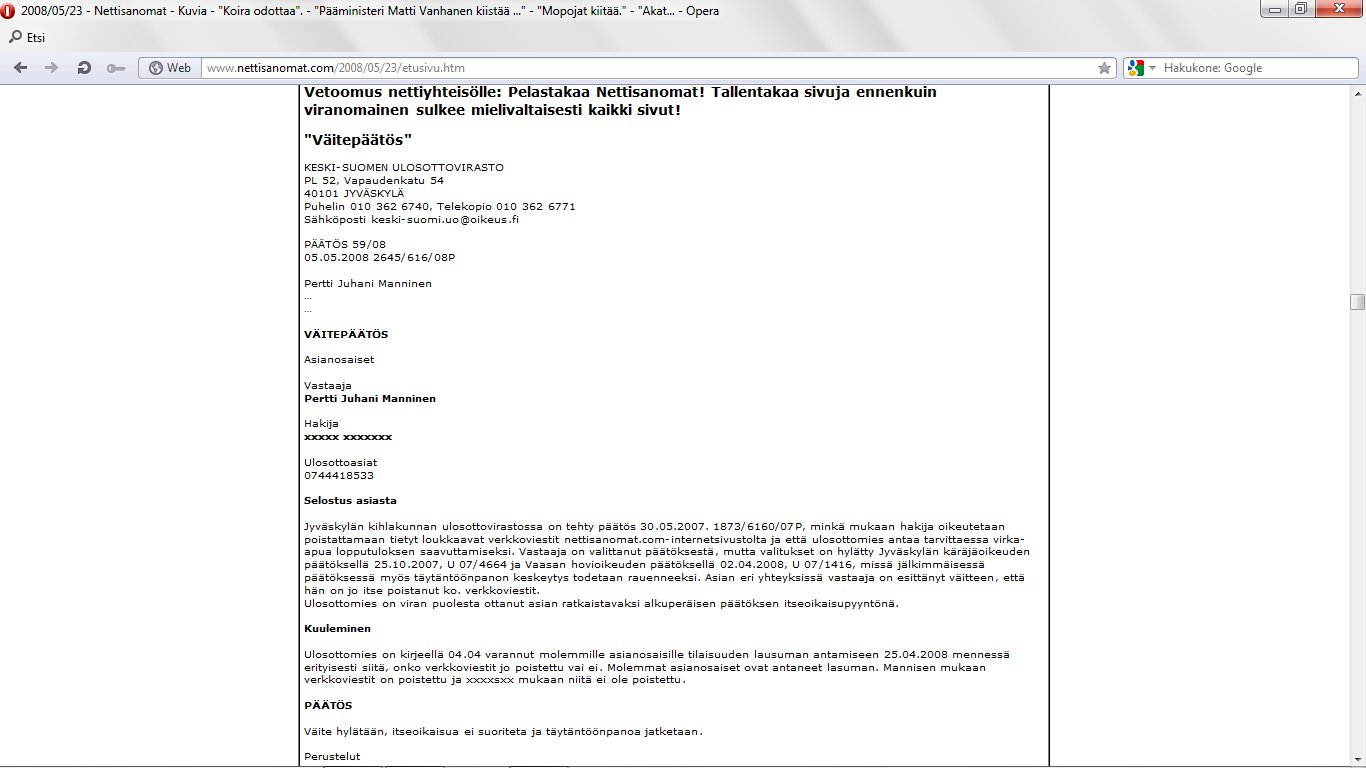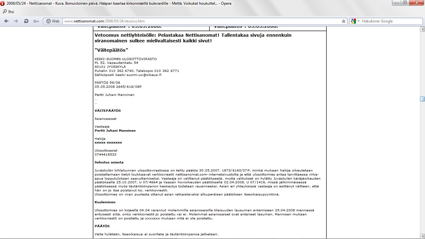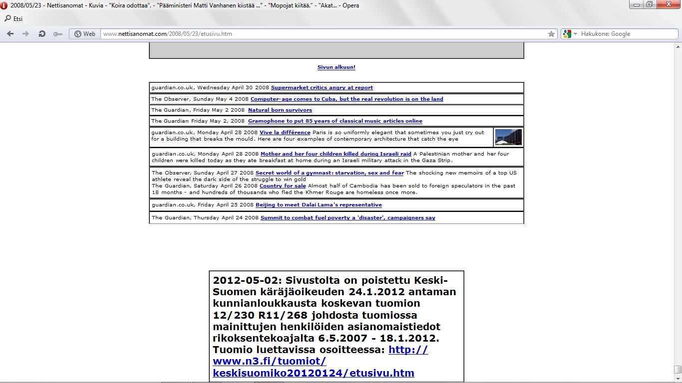 Nettisanomat 2012/07/02 - LIITE. Sivuja, joissa tuomio on pantu täytäntöön. Sivut 299-308/ 565 - VALITUSLUPAHAKEMUS KORKEIMMALLE OIKEUDELLE: Tuomio ja seuraamismääräys sellaisesta rikolliseksi väitetystä teosta, jota ei ole käsitelty oikeudessa ja oikeudessa rikolliseksi todettu, ei ole kansanvaltaisen oikeusvaltion oikeusjärjestyksen mukainen. - Kuva. Poika ja koira. - Kuva. Käden ojennus. Karuselli. - Maanantai 02.07.2012 - oikeussivu - Nettisanomat - Sanomanetti - Blogi: Viikkosanomat.fi - Kuvasanomat - Sanomatori - Viikkosanomat - Härkää sarvista - 12.fi - Korkein oikeus, sananvapaus, rajoittaminen, tuomio, käräjäoikeus, kansanvaltainen oikeusvaltio, oikeusjärjestys |