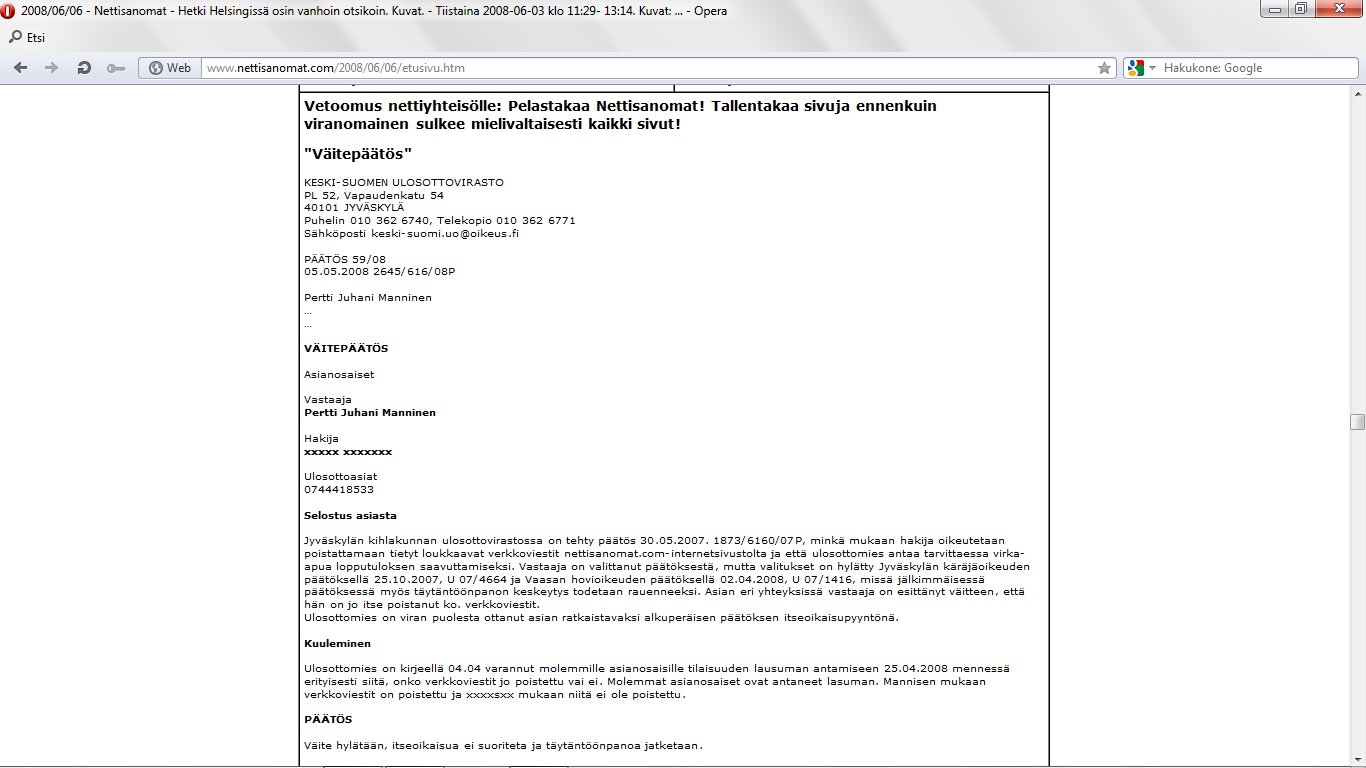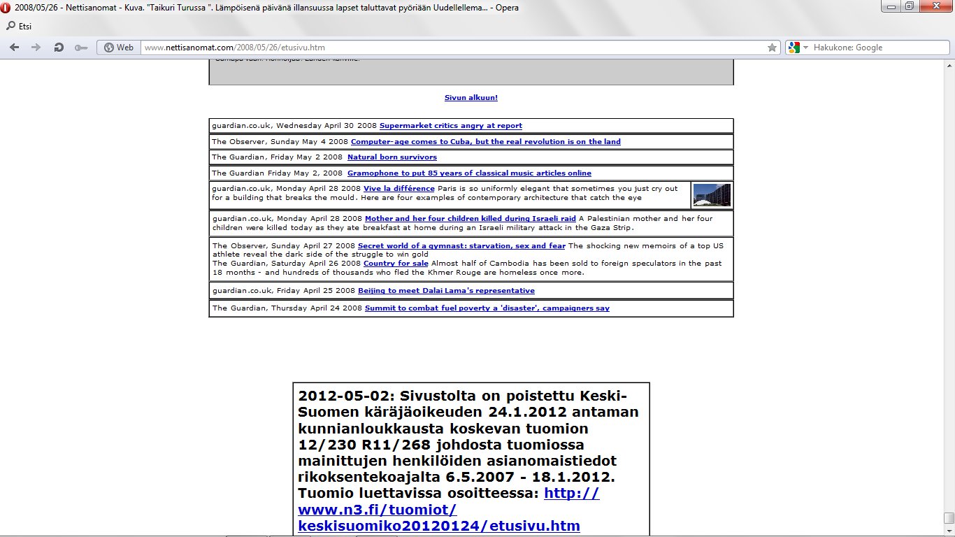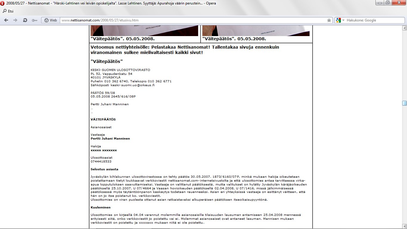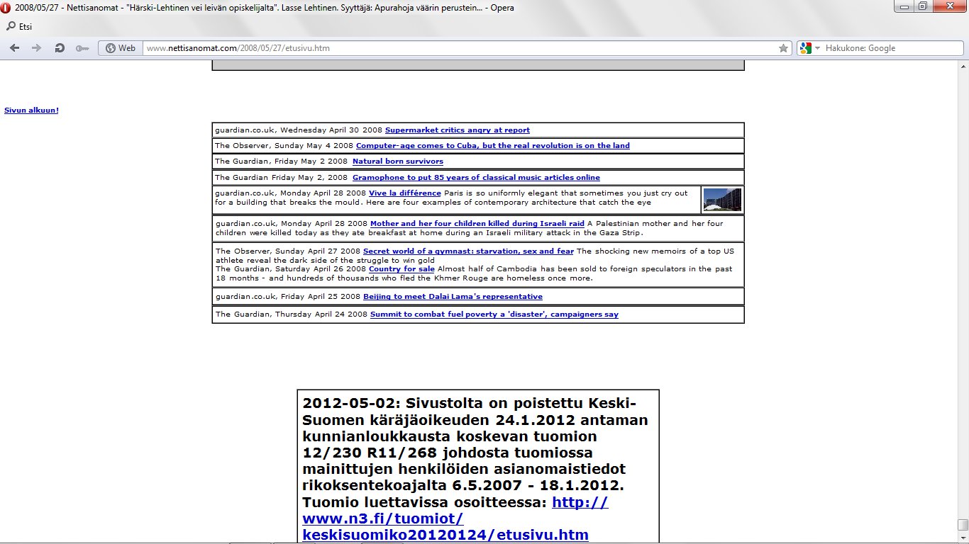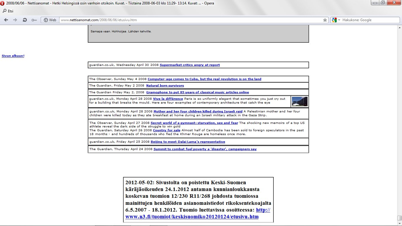 Nettisanomat 2012/07/02 - LIITE. Sivuja, joissa tuomio on pantu täytäntöön. Sivut 309-318/ 565 - VALITUSLUPAHAKEMUS KORKEIMMALLE OIKEUDELLE: Tuomio ja seuraamismääräys sellaisesta rikolliseksi väitetystä teosta, jota ei ole käsitelty oikeudessa ja oikeudessa rikolliseksi todettu, ei ole kansanvaltaisen oikeusvaltion oikeusjärjestyksen mukainen. - Kuva. Poika ja koira. - Kuva. Käden ojennus. Karuselli. - Maanantai 02.07.2012 - oikeussivu - Nettisanomat - Sanomanetti - Blogi: Viikkosanomat.fi - Kuvasanomat - Sanomatori - Viikkosanomat - Härkää sarvista - 12.fi - Korkein oikeus, sananvapaus, rajoittaminen, tuomio, käräjäoikeus, kansanvaltainen oikeusvaltio, oikeusjärjestys |
