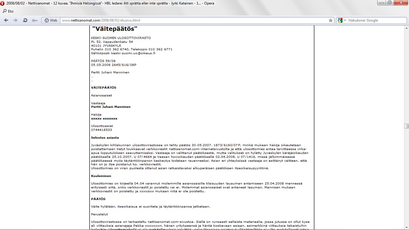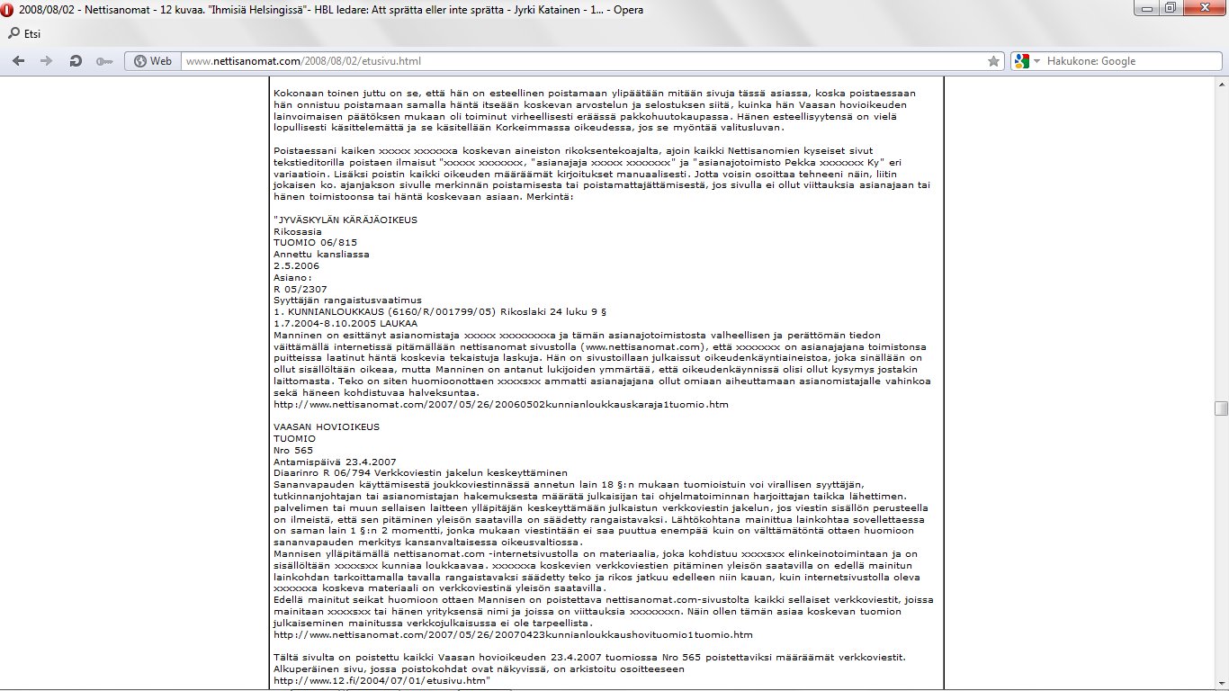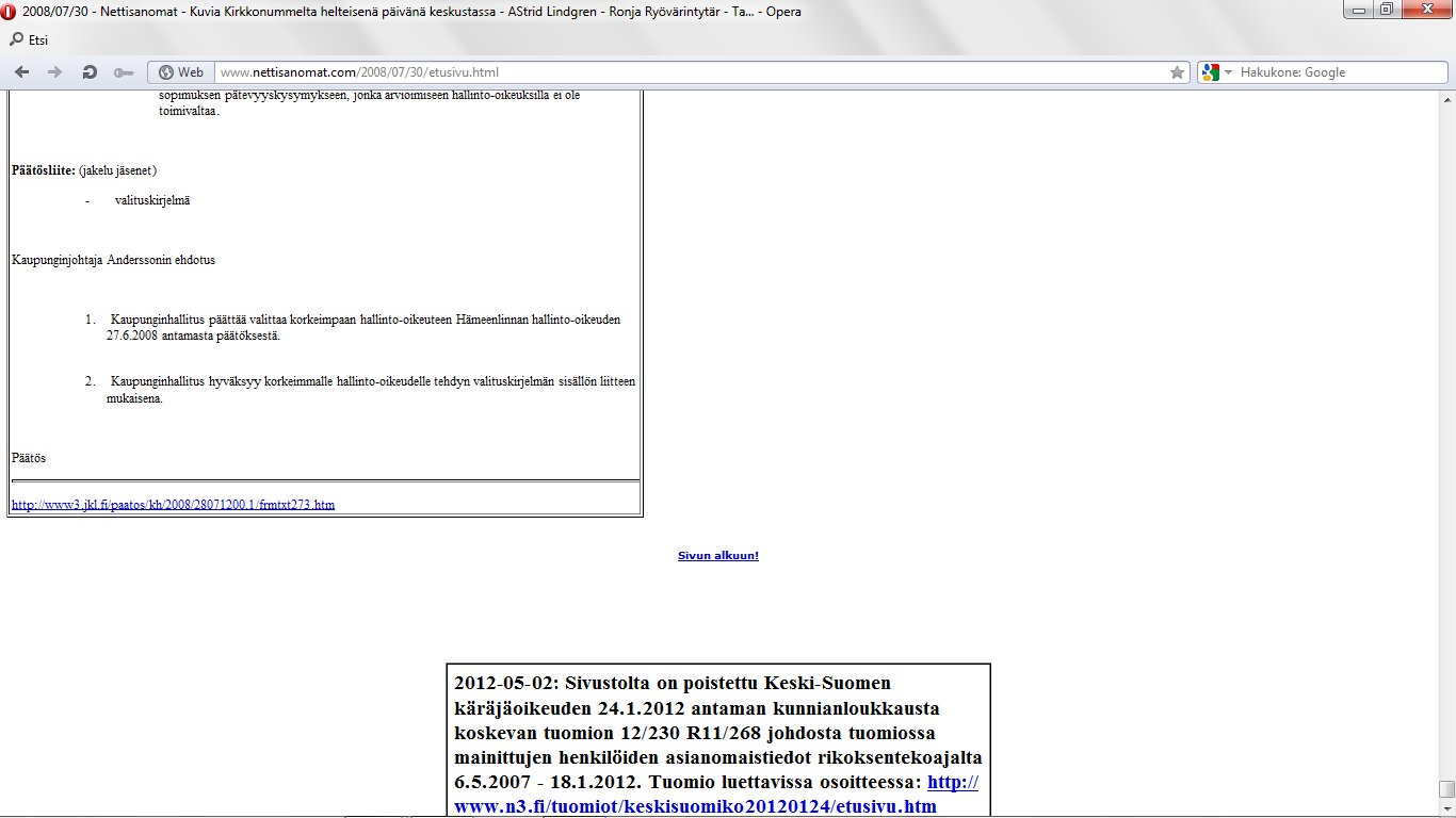 Nettisanomat 2012/07/03 - LIITE. Sivuja, joissa tuomio on pantu täytäntöön. Sivut 329-338/ 565 - VALITUSLUPAHAKEMUS KORKEIMMALLE OIKEUDELLE: Tuomio ja seuraamismääräys sellaisesta rikolliseksi väitetystä teosta, jota ei ole käsitelty oikeudessa ja oikeudessa rikolliseksi todettu, ei ole kansanvaltaisen oikeusvaltion oikeusjärjestyksen mukainen. - Kuva. Poika ja koira. - Kuva. Käden ojennus. Karuselli. - Tiistai 03.07.2012 - oikeussivu - Nettisanomat - Sanomanetti - Blogi: Viikkosanomat.fi - Kuvasanomat - Sanomatori - Viikkosanomat - Härkää sarvista - 12.fi - Korkein oikeus, sananvapaus, rajoittaminen, tuomio, käräjäoikeus, kansanvaltainen oikeusvaltio, oikeusjärjestys |