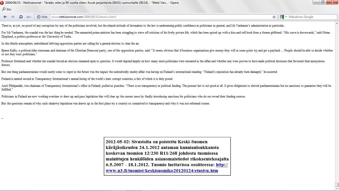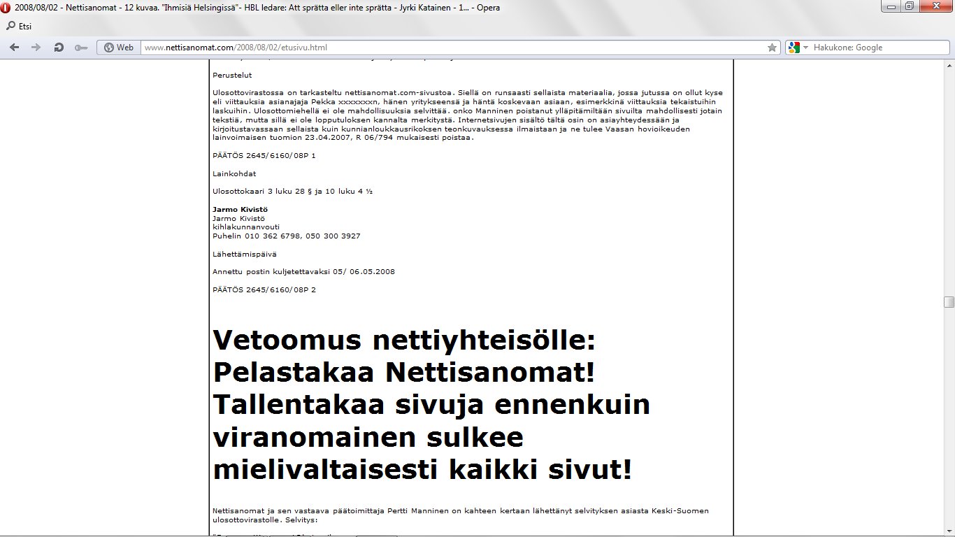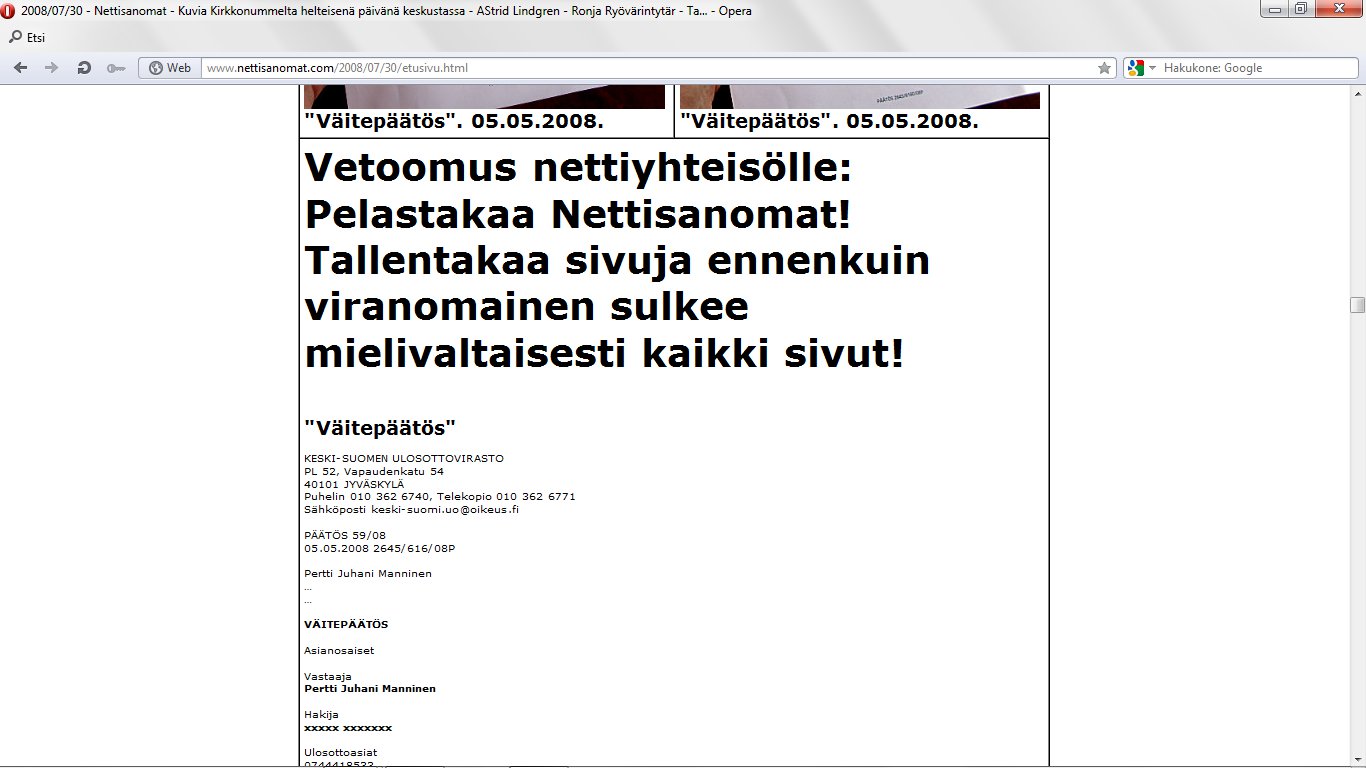 Nettisanomat 2012/07/03 - LIITE. Sivuja, joissa tuomio on pantu täytäntöön. Sivut 329-338/ 565 - VALITUSLUPAHAKEMUS KORKEIMMALLE OIKEUDELLE: Tuomio ja seuraamismääräys sellaisesta rikolliseksi väitetystä teosta, jota ei ole käsitelty oikeudessa ja oikeudessa rikolliseksi todettu, ei ole kansanvaltaisen oikeusvaltion oikeusjärjestyksen mukainen. - Kuva. Poika ja koira. - Kuva. Käden ojennus. Karuselli. - Tiistai 03.07.2012 - oikeussivu - Nettisanomat - Sanomanetti - Blogi: Viikkosanomat.fi - Kuvasanomat - Sanomatori - Viikkosanomat - Härkää sarvista - 12.fi - Korkein oikeus, sananvapaus, rajoittaminen, tuomio, käräjäoikeus, kansanvaltainen oikeusvaltio, oikeusjärjestys |