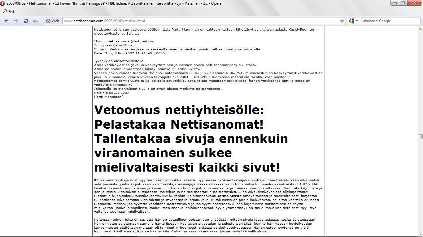 ASIA Valituslupahakemus ja valitus. MUUTOKSENHAUN KOHDE Vaasan hovioikeuden 20.4.2012 antama tuomio nro 438 kunnianloukkausasiassa R 12/275 HAKIJA Manninen, Pertti Juhani I VALITUSLUPAHAKEMUS PERUSTE Pyydän kunnioittavasti, että korkein oikeus myöntäisi minulle luvan hakea muutosta yllämainittuun hovioikeuden tuomioon, koska 1) siihen on erityistä aihetta asiassa tapahtuneen sellaisen oikeudenkäyntivirheen takia, jonka perusteella ratkaisu olisi purettava tai poistettava 2) siihen on erityistä aihetta asiassa tapahtuneen muun virheen takia, jonka perusteella ratkaisu olisi purettava tai poistettava 3) lain soveltamisen kannalta muissa samanlaisissa tapauksissa on tärkeätä saattaa asia Korkeimman oikeuden ratkaistavaksi PERUSTELUT 1. Hovioikeus on evännyt jatkokäsittelyluvan perustelunaan, ettei ole syytä epäillä käräjäoikeuden ratkaisun lopputuloksen oikeellisuutta. Ratkaisu on sananvapauslain vastainen, kun siinä vastoin lain määräystä rajoitetaan tarpeettomasti sananvapautta. 2. Hovioikeus on jättänyt voimaan sellaisen käräjäoikeuden tuomion, jossa käräjäoikeus on määrännyt rangaistuksen ja seuraamukset sellaisista asioista (kirjoituksista), joita ei ollenkaan käsitelty käräjäoikeudessa. Lisäksi käräjäoikeus on määrännyt poistettavaksi sellaisenaan (ilman minkäänlaista kommentointia) julkaistut oikeudenkäyntipöytäkirjat. II VALITUS VAATIMUKSET Kunnioittavasti pyydän, että korkein oikeus kumoaa käräjäoikeuden ja hovioikeuden tuomiot. PERUSTELUT Toistan kaikki tässä asiassa aikaisemmin suullisesti lausumani ja esille tuomani kirjallisen materiaalin. Tarkoitukseni ei ole ollut loukata asianomistajien kunniaa, vaan kirjoittaa ja selostaa asianomistajien toimintaa niin kuin se on oikeasti tapahtunut. Tällaisten asioiden esille tuominen ja siitä kirjoittaminen ei voi olla loukkaavaa eikä tällä mitenkään väitetä, että asianomistajat olisivat olleet mukana jossakin lainvastaisessa toiminnassa. Asianomistaja Lauri Kara on esittänyt kaksi kirjoitusta, jotka ovat mukana oikeudenkäyntiaineistossa ja lukuisan joukon hakutuloksia, jotka tulevat näistä kirjoituksista ja myös oikeudenkäyntipöytäkirjoista. Käräjäoikeus on määrännyt näistä kirjoituksista poistettavaksi asiaosaistiedot, jotka olivat edellä kerrotun mukaan jo poistettu ennen oikeudenkäyntiä, joista dokumentit esitettiin käräjäoikeuden istunnon aikana ja jotka ovat mukana oikeudenkäyntiaineistossa. Käräjäoikeus on vastoin lain selvää määräystä siitä, että sananvapautta ei pidä tarpeettomasti rajoittaa, menetellyt juuri näin. Näiden kirjoitusten lisäksi käräjäoikeus määräsi poistettavaksi asianosaistiedot myös sellaisista kirjoituksista ja oikeudenkäyntipöytäkirjoista, jotka eivät olleet kirjallisina todisteina tai joita ei muutenkaan käsitelty oikeudenkäynnissä. Oikeudenkäyntipöytäkirjojen osalta tosin käräjäoikeus totesi riittämättömin perustein, että niistä asianosaistiedot piti poistaa, koska pöytäkirjat oli julkaistu "kunnianloukkaustarkoituksessa". Muiden kirjoitusten osalta oikeus katsoi niitä siis mitenkään käsittelemättä, että ne loukkasivat asianomistajan kunniaa. Käräjäoikeus on vastoin lain selvää määräystä siitä, että sananvapautta ei pidä tarpeettomasti rajoittaa, menetellyt juuri näin. TÄYTÄNTÖÖNPANO ja "Vastaus kuulemiskirjeeseen 27/IJJ (Kihlakunnanvouti Iivari Järvinen) Oheisissa liitteissä on sivut siitä aineistosta, jotka käräjäoikeuden tuomion mukaan piti poistaa, mutta jota aineistoa ei ollenkaan käsitelty oikeudenistunnossa. Pyydän, että tämä aineisto otetaan huomioon kirjallisina todisteina, koska sitä ei ollut vielä silloin poistot tehtyinä, kun hovioikeus teki päätöksensä siitä, että se ei ota valitustani käsittelyyn. Nämä todisteet osoittavat sen, että käräjäoikeus on tarpeettomasti rajoittanut sananvapautta, koska niissä ei ole mitään asianomistajien kunniaa loukkaavaa. ASIANOMISTAJIEN ERILLISYYS Vaikka käräjäoikeuden tuomio on yhteinen molempien asianomistajien kanssa, niin tietenkään Lauri Karan esittämät kunniaansa loukkaavaksi väittämänsä kirjoitukset eivät loukkaa Pekka Monosen kunniaa, jollei tämä asianomistaja näin väitä. Näin hän ei oikeudenkäynnissä missään yhteydessä väittänyt, joten asianosaistietojen poistovaatimus voi koskea vain Lauri Karaa näissä kirjoituksissa. Käräjäoikeus ei ole tätä rajannut ja on siis tältäkin osin rajoittanut tarpeettomasti sananvapautta tässä asiassa. Mikäli korkein oikeus kuitenkin katsoo minun syyllistyneen kunnianloukkausrikokseen ja määrää siitä rangaistuksen pyydän kunnioittavasti seuraavaa: 1) Rangaistusseuraamus Pyydän lieventämään rangaistusta. 2) Korvausvelvollisuus Pyydän lieventämään korvausvelvollisuutta hovioikeuteen jättämäni pyynnön mukaisesti koskien Pekka Monosen ja Lauri Karan vaatimuksia.. 3) Verkkoviestin jakelun keskeyttäminen Lähtökohtana mainittua lakia sovellettaessa on lain 1 §:n 2 momentin mukaan, että viestintään ei saa puuttua enempää kuin on välttämätöntä ottaen huomioon sananvapauden merkitys kansanvaltaisessa oikeusvaltiossa. Asianomistajien vaatimus ja käräjäoikeuden tuomio on edellä esitettyjen lainkohtien mukaan liian laaja. Poistamisvaatimus voi näin ollen kohdistua vain siihen aineistoon, joka oikeudessa esiteltiin ja käsiteltiin ja joka todettiin rikolliseksi, kunniaa loukkaavaksi. Tuomio ja seuraamismääräys sellaisesta rikolliseksi väitetystä teosta, jota ei ole käsitelty oikeudessa ja oikeudessa rikolliseksi todettu, ei ole kansanvaltaisen oikeusvaltion oikeusjärjestyksen mukainen. LIITTEET Kunnioittavasti PÄIVÄYS Laukaassa kesäkuun 18. päivänä 2012 Pertti Manninen |