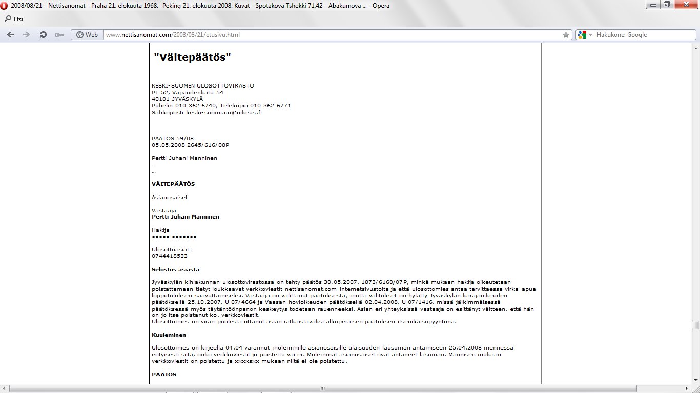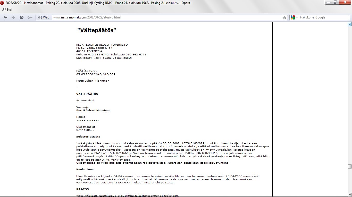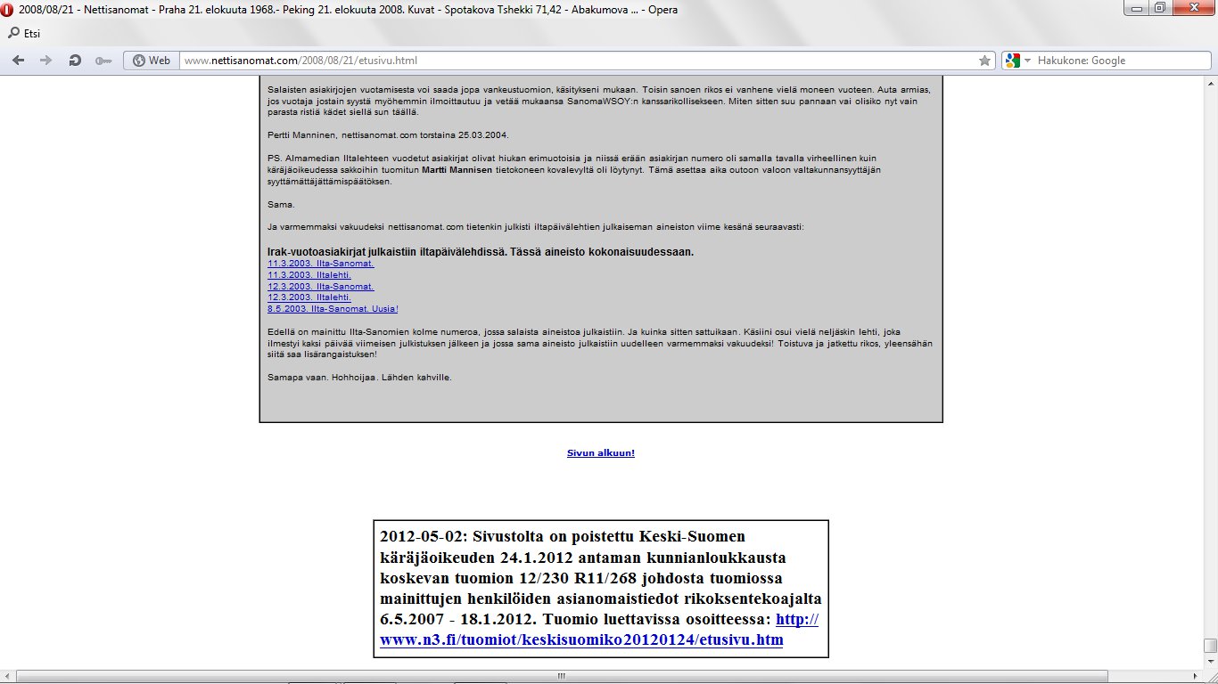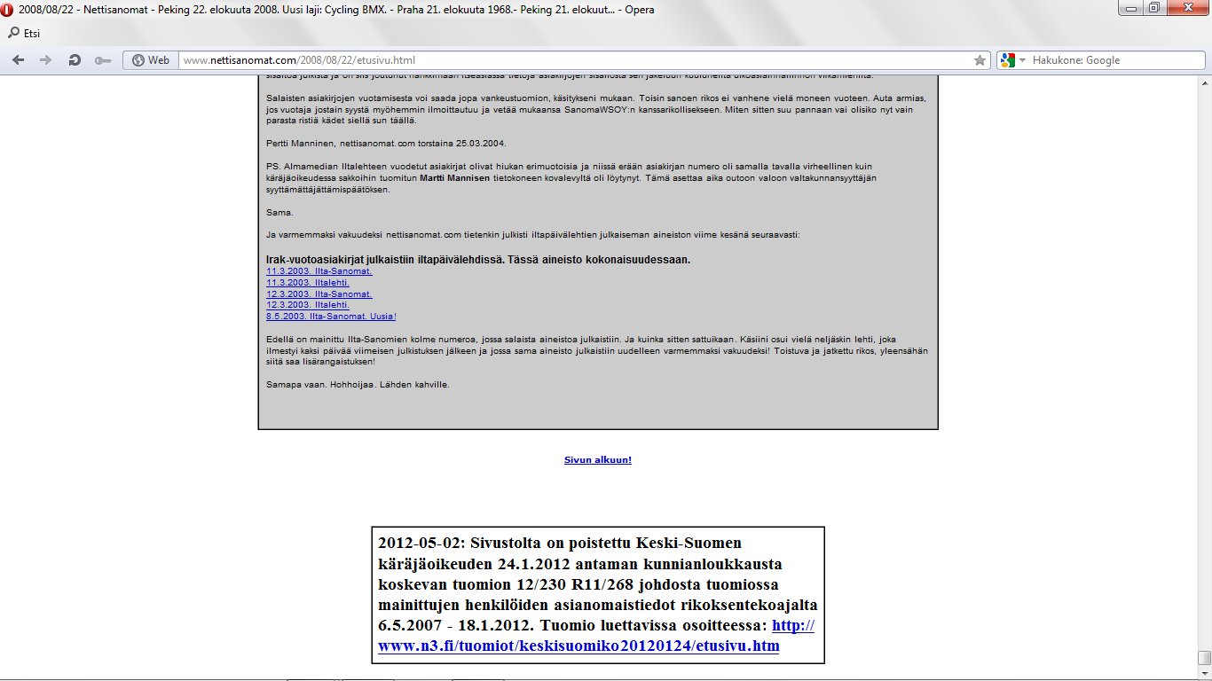 Nettisanomat 2012/07/04 - LIITE. Sivuja, joissa tuomio on pantu täytäntöön. 359-368/ 565. - VALITUSLUPAHAKEMUS KORKEIMMALLE OIKEUDELLE: Tuomio ja seuraamismääräys sellaisesta rikolliseksi väitetystä teosta, jota ei ole käsitelty oikeudessa ja oikeudessa rikolliseksi todettu, ei ole kansanvaltaisen oikeusvaltion oikeusjärjestyksen mukainen. - Kuva. Poika ja koira. - Kuva. Käden ojennus. Karuselli. - Keskiviikko 04.07.2012 - oikeussivu - Nettisanomat - Sanomanetti - Blogi: Viikkosanomat.fi - Kuvasanomat - Sanomatori - Viikkosanomat - Härkää sarvista - 12.fi - Korkein oikeus, sananvapaus, rajoittaminen, tuomio, käräjäoikeus, kansanvaltainen oikeusvaltio, oikeusjärjestys |