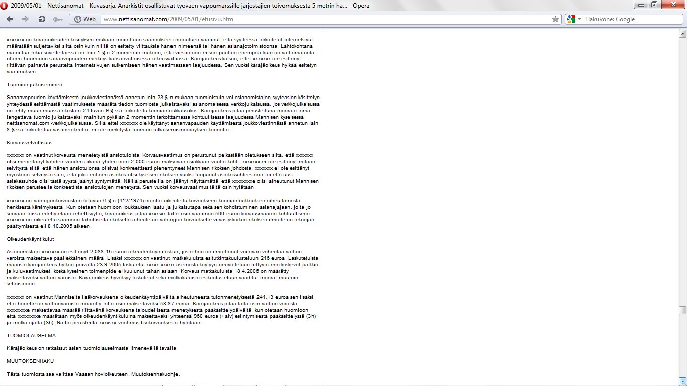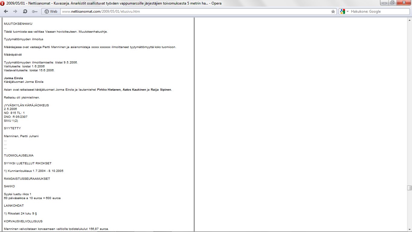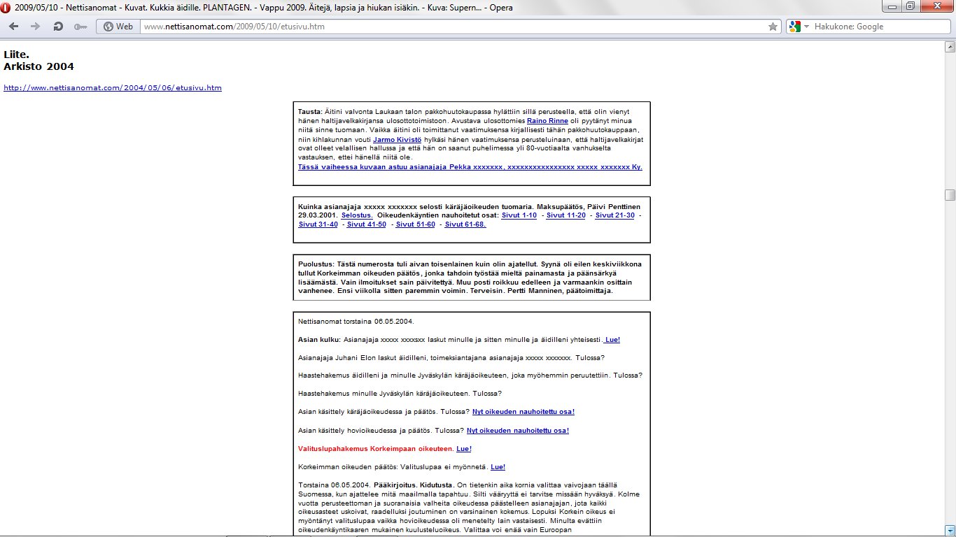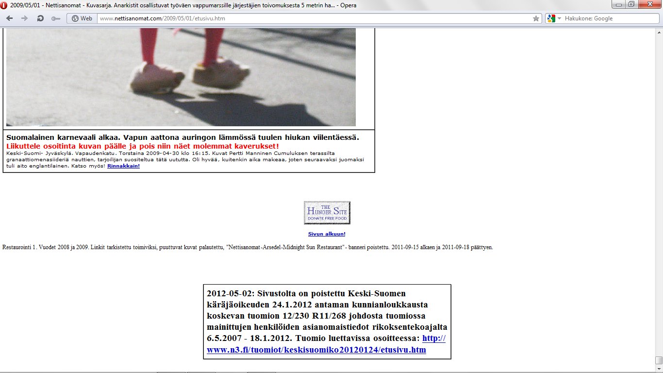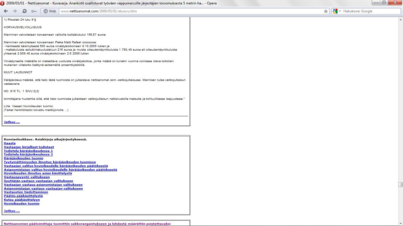 Nettisanomat 2012/07/05 - LIITE. Sivuja, joissa tuomio on pantu täytäntöön. Sivut 389-398/ 565.. - VALITUSLUPAHAKEMUS KORKEIMMALLE OIKEUDELLE: Tuomio ja seuraamismääräys sellaisesta rikolliseksi väitetystä teosta, jota ei ole käsitelty oikeudessa ja oikeudessa rikolliseksi todettu, ei ole kansanvaltaisen oikeusvaltion oikeusjärjestyksen mukainen. - Kuva. Poika ja koira. - Kuva. Käden ojennus. Karuselli. - Torstai 05.07.2012 - oikeussivu - Nettisanomat - Sanomanetti - Blogi: Viikkosanomat.fi - Kuvasanomat - Sanomatori - Viikkosanomat - Härkää sarvista - 12.fi - Korkein oikeus, sananvapaus, rajoittaminen, tuomio, käräjäoikeus, kansanvaltainen oikeusvaltio, oikeusjärjestys |
