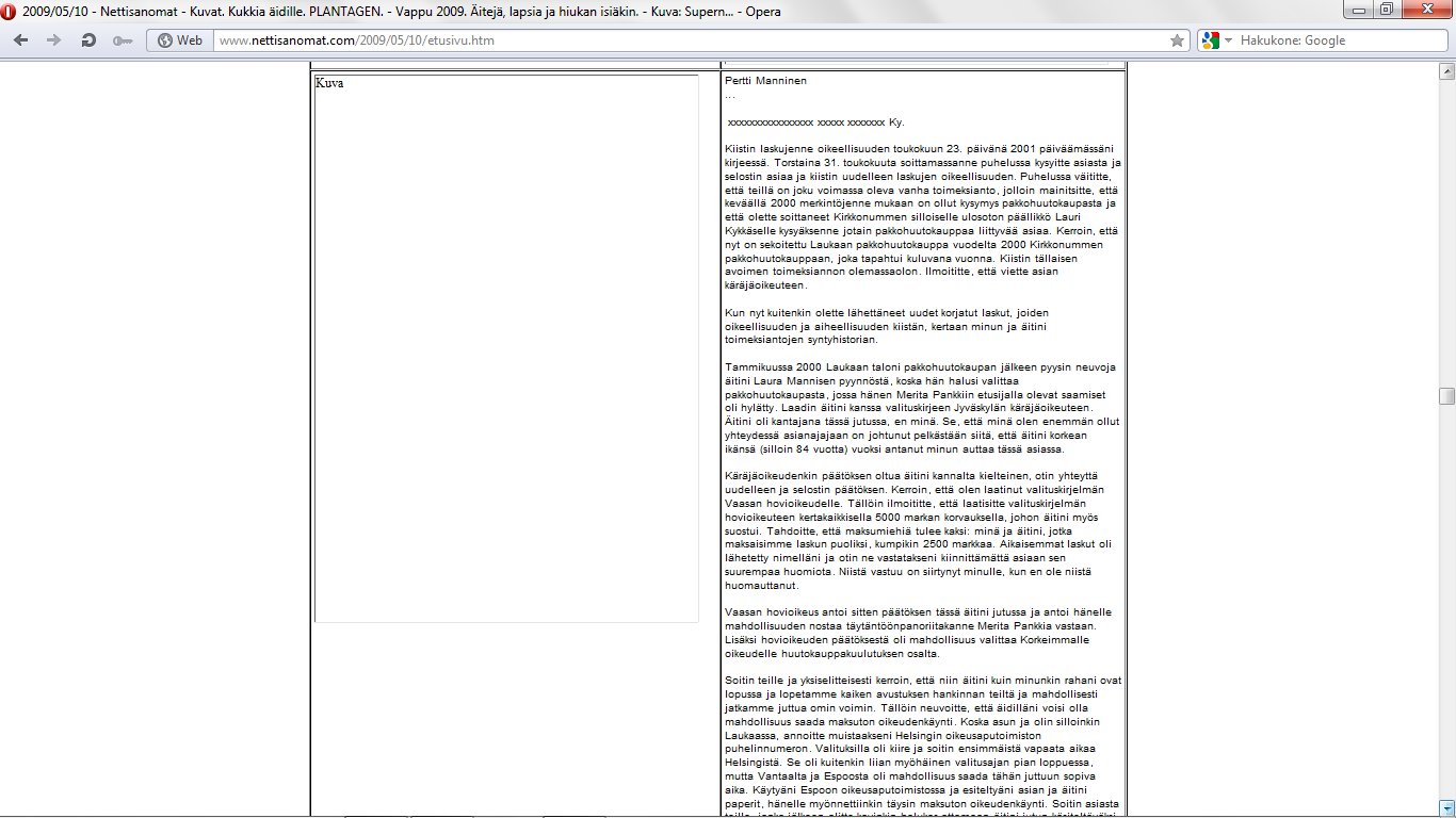 ASIA Valituslupahakemus ja valitus. MUUTOKSENHAUN KOHDE Vaasan hovioikeuden 20.4.2012 antama tuomio nro 438 kunnianloukkausasiassa R 12/275 HAKIJA Manninen, Pertti Juhani I VALITUSLUPAHAKEMUS PERUSTE Pyydän kunnioittavasti, että korkein oikeus myöntäisi minulle luvan hakea muutosta yllämainittuun hovioikeuden tuomioon, koska 1) siihen on erityistä aihetta asiassa tapahtuneen sellaisen oikeudenkäyntivirheen takia, jonka perusteella ratkaisu olisi purettava tai poistettava 2) siihen on erityistä aihetta asiassa tapahtuneen muun virheen takia, jonka perusteella ratkaisu olisi purettava tai poistettava 3) lain soveltamisen kannalta muissa samanlaisissa tapauksissa on tärkeätä saattaa asia Korkeimman oikeuden ratkaistavaksi PERUSTELUT 1. Hovioikeus on evännyt jatkokäsittelyluvan perustelunaan, ettei ole syytä epäillä käräjäoikeuden ratkaisun lopputuloksen oikeellisuutta. Ratkaisu on sananvapauslain vastainen, kun siinä vastoin lain määräystä rajoitetaan tarpeettomasti sananvapautta. 2. Hovioikeus on jättänyt voimaan sellaisen käräjäoikeuden tuomion, jossa käräjäoikeus on määrännyt rangaistuksen ja seuraamukset sellaisista asioista (kirjoituksista), joita ei ollenkaan käsitelty käräjäoikeudessa. Lisäksi käräjäoikeus on määrännyt poistettavaksi sellaisenaan (ilman minkäänlaista kommentointia) julkaistut oikeudenkäyntipöytäkirjat. II VALITUS VAATIMUKSET Kunnioittavasti pyydän, että korkein oikeus kumoaa käräjäoikeuden ja hovioikeuden tuomiot. PERUSTELUT Toistan kaikki tässä asiassa aikaisemmin suullisesti lausumani ja esille tuomani kirjallisen materiaalin. Tarkoitukseni ei ole ollut loukata asianomistajien kunniaa, vaan kirjoittaa ja selostaa asianomistajien toimintaa niin kuin se on oikeasti tapahtunut. Tällaisten asioiden esille tuominen ja siitä kirjoittaminen ei voi olla loukkaavaa eikä tällä mitenkään väitetä, että asianomistajat olisivat olleet mukana jossakin lainvastaisessa toiminnassa. Asianomistaja Lauri Kara on esittänyt kaksi kirjoitusta, jotka ovat mukana oikeudenkäyntiaineistossa ja lukuisan joukon hakutuloksia, jotka tulevat näistä kirjoituksista ja myös oikeudenkäyntipöytäkirjoista. Käräjäoikeus on määrännyt näistä kirjoituksista poistettavaksi asiaosaistiedot, jotka olivat edellä kerrotun mukaan jo poistettu ennen oikeudenkäyntiä, joista dokumentit esitettiin käräjäoikeuden istunnon aikana ja jotka ovat mukana oikeudenkäyntiaineistossa. Käräjäoikeus on vastoin lain selvää määräystä siitä, että sananvapautta ei pidä tarpeettomasti rajoittaa, menetellyt juuri näin. Näiden kirjoitusten lisäksi käräjäoikeus määräsi poistettavaksi asianosaistiedot myös sellaisista kirjoituksista ja oikeudenkäyntipöytäkirjoista, jotka eivät olleet kirjallisina todisteina tai joita ei muutenkaan käsitelty oikeudenkäynnissä. Oikeudenkäyntipöytäkirjojen osalta tosin käräjäoikeus totesi riittämättömin perustein, että niistä asianosaistiedot piti poistaa, koska pöytäkirjat oli julkaistu "kunnianloukkaustarkoituksessa". Muiden kirjoitusten osalta oikeus katsoi niitä siis mitenkään käsittelemättä, että ne loukkasivat asianomistajan kunniaa. Käräjäoikeus on vastoin lain selvää määräystä siitä, että sananvapautta ei pidä tarpeettomasti rajoittaa, menetellyt juuri näin. TÄYTÄNTÖÖNPANO ja "Vastaus kuulemiskirjeeseen 27/IJJ (Kihlakunnanvouti Iivari Järvinen) Oheisissa liitteissä on sivut siitä aineistosta, jotka käräjäoikeuden tuomion mukaan piti poistaa, mutta jota aineistoa ei ollenkaan käsitelty oikeudenistunnossa. Pyydän, että tämä aineisto otetaan huomioon kirjallisina todisteina, koska sitä ei ollut vielä silloin poistot tehtyinä, kun hovioikeus teki päätöksensä siitä, että se ei ota valitustani käsittelyyn. Nämä todisteet osoittavat sen, että käräjäoikeus on tarpeettomasti rajoittanut sananvapautta, koska niissä ei ole mitään asianomistajien kunniaa loukkaavaa. ASIANOMISTAJIEN ERILLISYYS Vaikka käräjäoikeuden tuomio on yhteinen molempien asianomistajien kanssa, niin tietenkään Lauri Karan esittämät kunniaansa loukkaavaksi väittämänsä kirjoitukset eivät loukkaa Pekka Monosen kunniaa, jollei tämä asianomistaja näin väitä. Näin hän ei oikeudenkäynnissä missään yhteydessä väittänyt, joten asianosaistietojen poistovaatimus voi koskea vain Lauri Karaa näissä kirjoituksissa. Käräjäoikeus ei ole tätä rajannut ja on siis tältäkin osin rajoittanut tarpeettomasti sananvapautta tässä asiassa. Mikäli korkein oikeus kuitenkin katsoo minun syyllistyneen kunnianloukkausrikokseen ja määrää siitä rangaistuksen pyydän kunnioittavasti seuraavaa: 1) Rangaistusseuraamus Pyydän lieventämään rangaistusta. 2) Korvausvelvollisuus Pyydän lieventämään korvausvelvollisuutta hovioikeuteen jättämäni pyynnön mukaisesti koskien Pekka Monosen ja Lauri Karan vaatimuksia.. 3) Verkkoviestin jakelun keskeyttäminen Lähtökohtana mainittua lakia sovellettaessa on lain 1 §:n 2 momentin mukaan, että viestintään ei saa puuttua enempää kuin on välttämätöntä ottaen huomioon sananvapauden merkitys kansanvaltaisessa oikeusvaltiossa. Asianomistajien vaatimus ja käräjäoikeuden tuomio on edellä esitettyjen lainkohtien mukaan liian laaja. Poistamisvaatimus voi näin ollen kohdistua vain siihen aineistoon, joka oikeudessa esiteltiin ja käsiteltiin ja joka todettiin rikolliseksi, kunniaa loukkaavaksi. Tuomio ja seuraamismääräys sellaisesta rikolliseksi väitetystä teosta, jota ei ole käsitelty oikeudessa ja oikeudessa rikolliseksi todettu, ei ole kansanvaltaisen oikeusvaltion oikeusjärjestyksen mukainen. LIITTEET Kunnioittavasti PÄIVÄYS Laukaassa kesäkuun 18. päivänä 2012 Pertti Manninen |