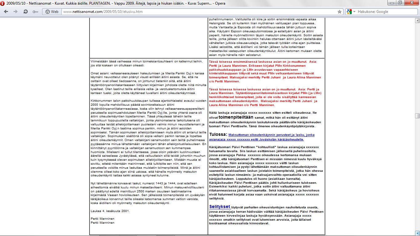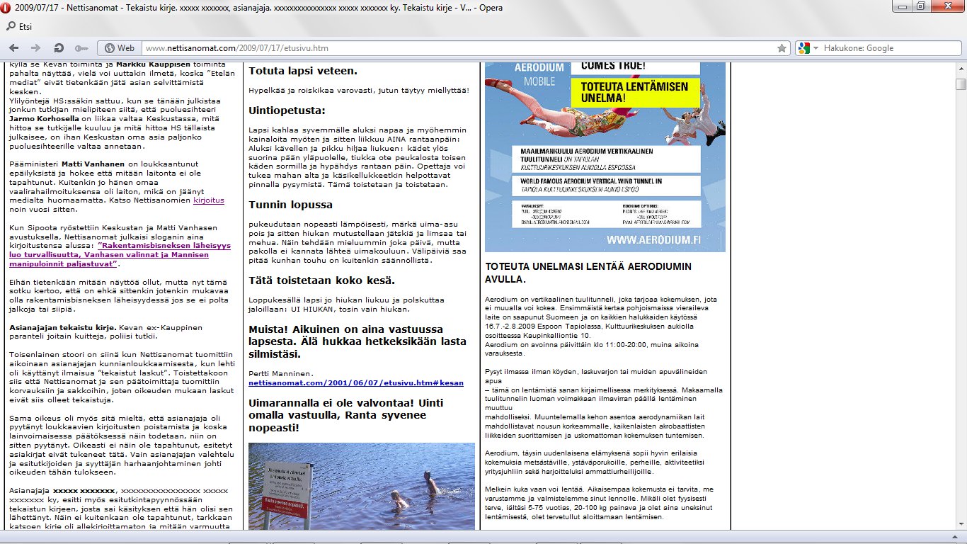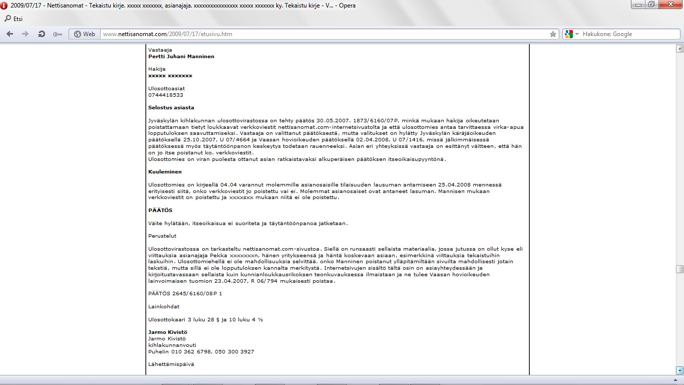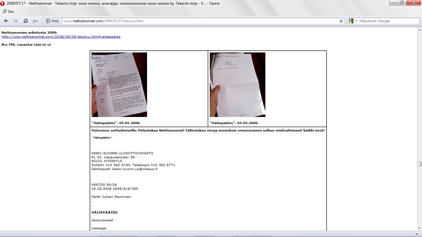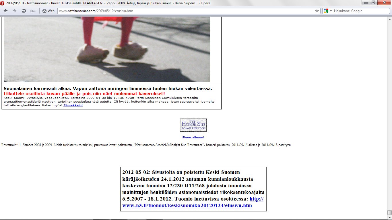 Nettisanomat 2012/07/05 - LIITE. Sivuja, joissa tuomio on pantu täytäntöön. Sivut 409-418/ 565. - VALITUSLUPAHAKEMUS KORKEIMMALLE OIKEUDELLE: Tuomio ja seuraamismääräys sellaisesta rikolliseksi väitetystä teosta, jota ei ole käsitelty oikeudessa ja oikeudessa rikolliseksi todettu, ei ole kansanvaltaisen oikeusvaltion oikeusjärjestyksen mukainen. - Kuva. Poika ja koira. - Kuva. Käden ojennus. Karuselli. - Torstai 05.07.2012 - oikeussivu - Nettisanomat - Sanomanetti - Blogi: Viikkosanomat.fi - Kuvasanomat - Sanomatori - Viikkosanomat - Härkää sarvista - 12.fi - Korkein oikeus, sananvapaus, rajoittaminen, tuomio, käräjäoikeus, kansanvaltainen oikeusvaltio, oikeusjärjestys |