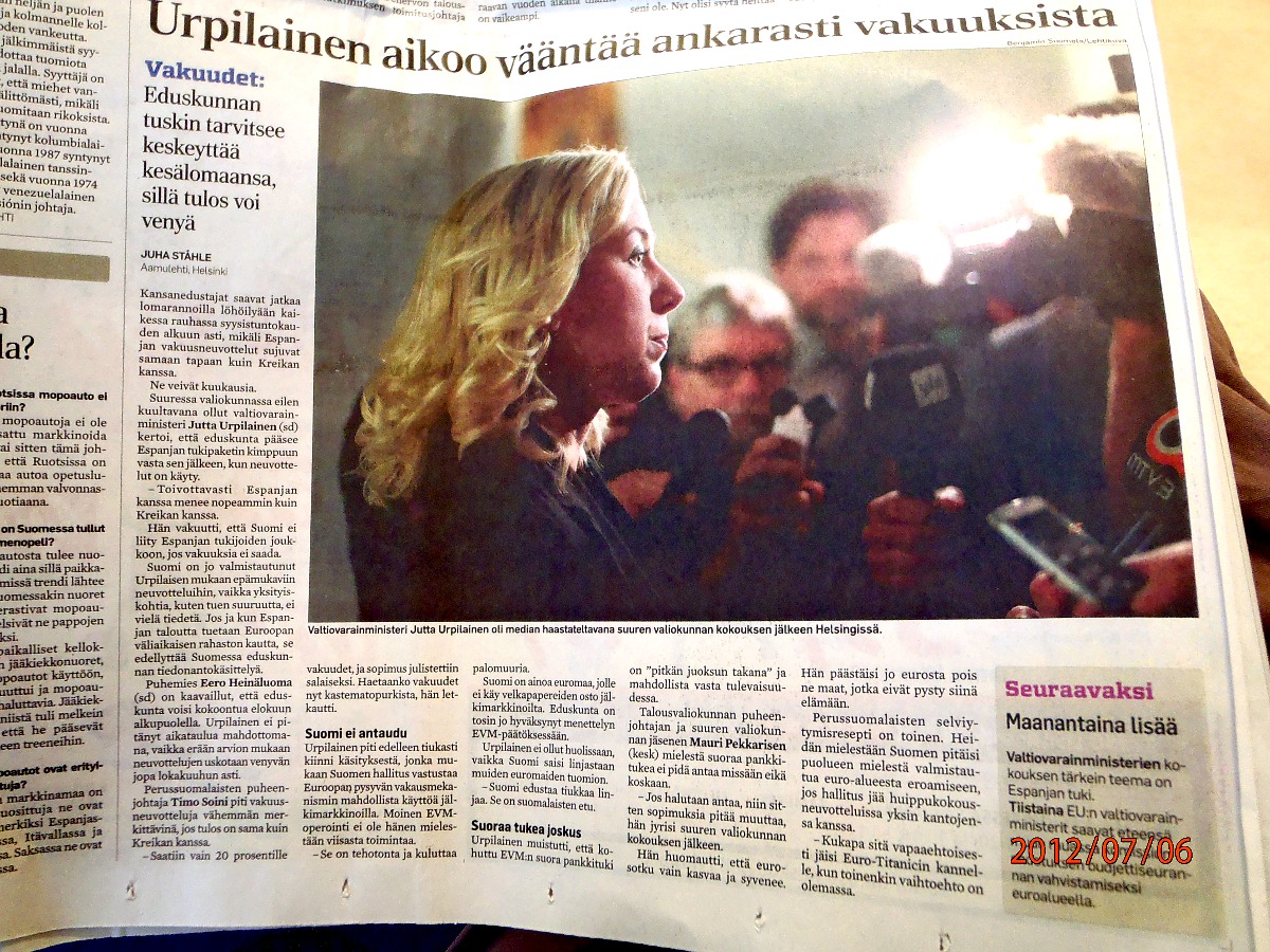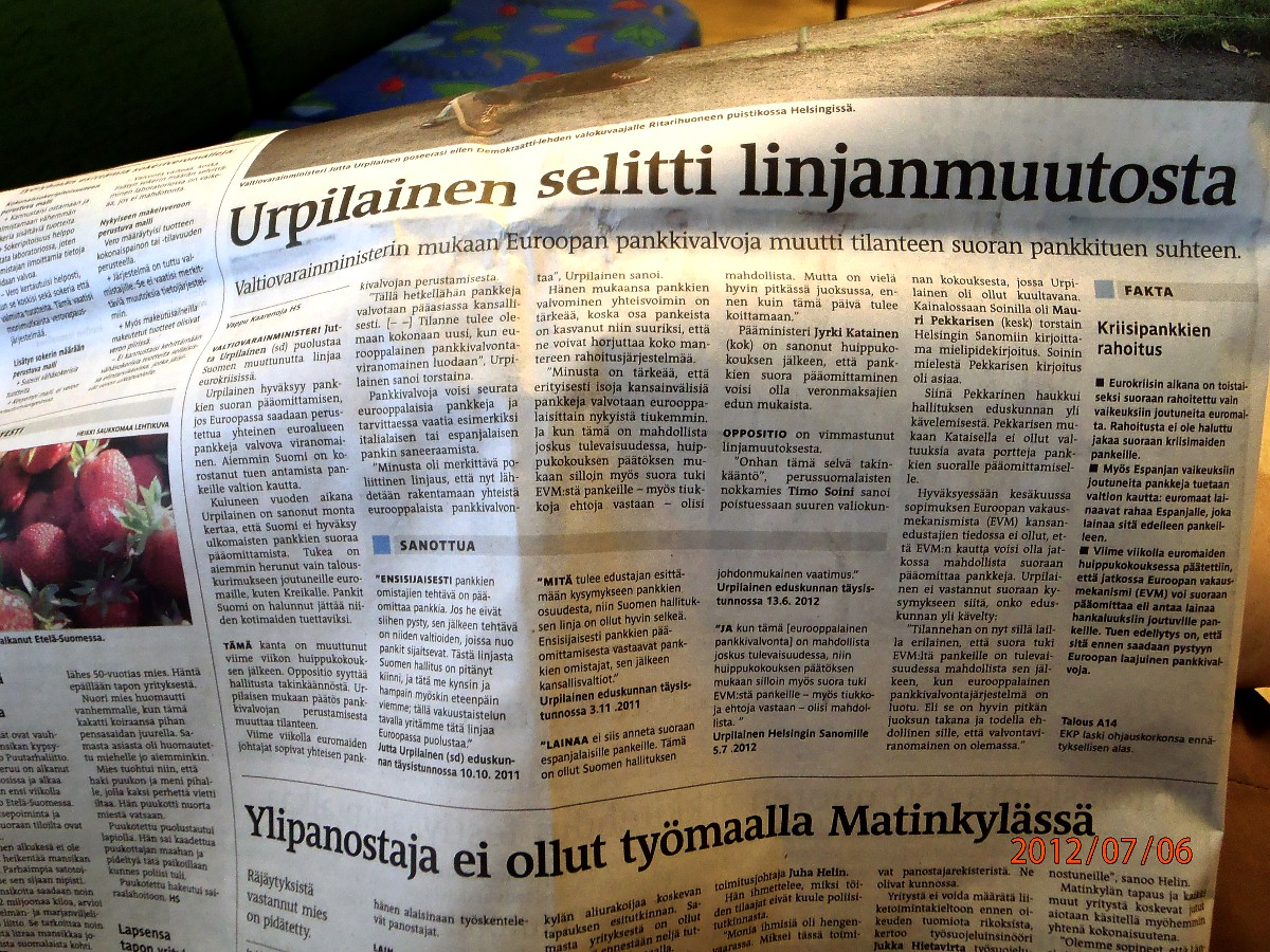 "Urpilainen aikoo vääntää ankarasti vakuuksista (Aamulehti)". - Urpilainen selitti linjamuutosta (Helsingin Sanomat)". Perjantai 2012-07-06. |