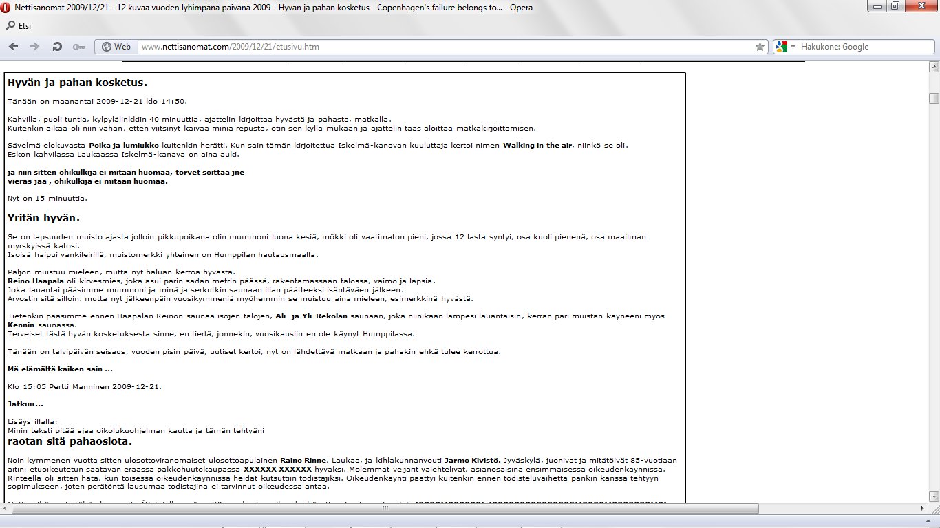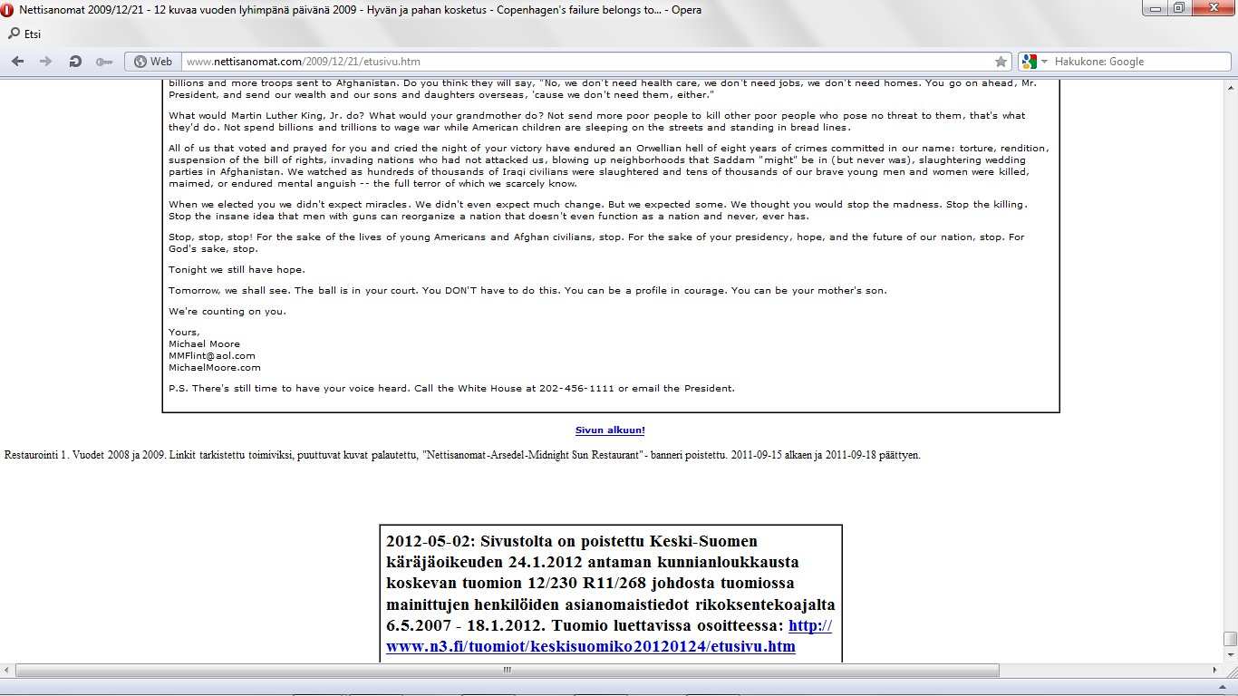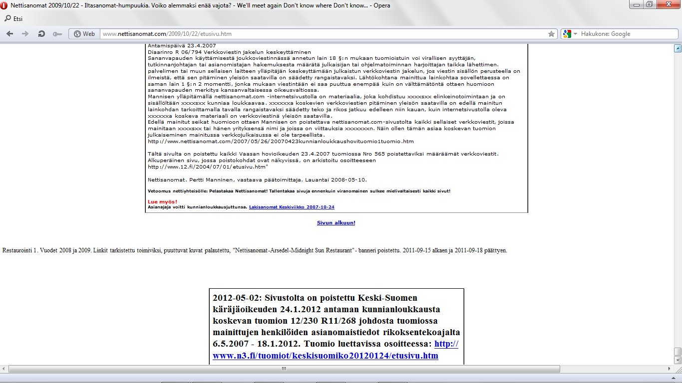 Nettisanomat 2012/07/06 - LIITE. Sivuja, joissa tuomio on pantu täytäntöön. Sivut429-438/ 565. - VALITUSLUPAHAKEMUS KORKEIMMALLE OIKEUDELLE: Tuomio ja seuraamismääräys sellaisesta rikolliseksi väitetystä teosta, jota ei ole käsitelty oikeudessa ja oikeudessa rikolliseksi todettu, ei ole kansanvaltaisen oikeusvaltion oikeusjärjestyksen mukainen. - Kuva. Poika ja koira. - Kuva. Käden ojennus. Karuselli. - Perjantai 06.07.2012 - oikeussivu - Nettisanomat - Sanomanetti - Blogi: Viikkosanomat.fi - Kuvasanomat - Sanomatori - Viikkosanomat - Härkää sarvista - 12.fi - Korkein oikeus, sananvapaus, rajoittaminen, tuomio, käräjäoikeus, kansanvaltainen oikeusvaltio, oikeusjärjestys |