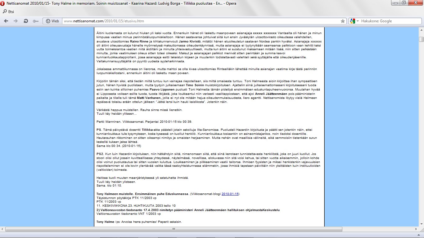 ASIA Valituslupahakemus ja valitus. MUUTOKSENHAUN KOHDE Vaasan hovioikeuden 20.4.2012 antama tuomio nro 438 kunnianloukkausasiassa R 12/275 HAKIJA Manninen, Pertti Juhani I VALITUSLUPAHAKEMUS PERUSTE Pyydän kunnioittavasti, että korkein oikeus myöntäisi minulle luvan hakea muutosta yllämainittuun hovioikeuden tuomioon, koska 1) siihen on erityistä aihetta asiassa tapahtuneen sellaisen oikeudenkäyntivirheen takia, jonka perusteella ratkaisu olisi purettava tai poistettava 2) siihen on erityistä aihetta asiassa tapahtuneen muun virheen takia, jonka perusteella ratkaisu olisi purettava tai poistettava 3) lain soveltamisen kannalta muissa samanlaisissa tapauksissa on tärkeätä saattaa asia Korkeimman oikeuden ratkaistavaksi PERUSTELUT 1. Hovioikeus on evännyt jatkokäsittelyluvan perustelunaan, ettei ole syytä epäillä käräjäoikeuden ratkaisun lopputuloksen oikeellisuutta. Ratkaisu on sananvapauslain vastainen, kun siinä vastoin lain määräystä rajoitetaan tarpeettomasti sananvapautta. 2. Hovioikeus on jättänyt voimaan sellaisen käräjäoikeuden tuomion, jossa käräjäoikeus on määrännyt rangaistuksen ja seuraamukset sellaisista asioista (kirjoituksista), joita ei ollenkaan käsitelty käräjäoikeudessa. Lisäksi käräjäoikeus on määrännyt poistettavaksi sellaisenaan (ilman minkäänlaista kommentointia) julkaistut oikeudenkäyntipöytäkirjat. II VALITUS VAATIMUKSET Kunnioittavasti pyydän, että korkein oikeus kumoaa käräjäoikeuden ja hovioikeuden tuomiot. PERUSTELUT Toistan kaikki tässä asiassa aikaisemmin suullisesti lausumani ja esille tuomani kirjallisen materiaalin. Tarkoitukseni ei ole ollut loukata asianomistajien kunniaa, vaan kirjoittaa ja selostaa asianomistajien toimintaa niin kuin se on oikeasti tapahtunut. Tällaisten asioiden esille tuominen ja siitä kirjoittaminen ei voi olla loukkaavaa eikä tällä mitenkään väitetä, että asianomistajat olisivat olleet mukana jossakin lainvastaisessa toiminnassa. Asianomistaja Lauri Kara on esittänyt kaksi kirjoitusta, jotka ovat mukana oikeudenkäyntiaineistossa ja lukuisan joukon hakutuloksia, jotka tulevat näistä kirjoituksista ja myös oikeudenkäyntipöytäkirjoista. Käräjäoikeus on määrännyt näistä kirjoituksista poistettavaksi asiaosaistiedot, jotka olivat edellä kerrotun mukaan jo poistettu ennen oikeudenkäyntiä, joista dokumentit esitettiin käräjäoikeuden istunnon aikana ja jotka ovat mukana oikeudenkäyntiaineistossa. Käräjäoikeus on vastoin lain selvää määräystä siitä, että sananvapautta ei pidä tarpeettomasti rajoittaa, menetellyt juuri näin. Näiden kirjoitusten lisäksi käräjäoikeus määräsi poistettavaksi asianosaistiedot myös sellaisista kirjoituksista ja oikeudenkäyntipöytäkirjoista, jotka eivät olleet kirjallisina todisteina tai joita ei muutenkaan käsitelty oikeudenkäynnissä. Oikeudenkäyntipöytäkirjojen osalta tosin käräjäoikeus totesi riittämättömin perustein, että niistä asianosaistiedot piti poistaa, koska pöytäkirjat oli julkaistu "kunnianloukkaustarkoituksessa". Muiden kirjoitusten osalta oikeus katsoi niitä siis mitenkään käsittelemättä, että ne loukkasivat asianomistajan kunniaa. Käräjäoikeus on vastoin lain selvää määräystä siitä, että sananvapautta ei pidä tarpeettomasti rajoittaa, menetellyt juuri näin. TÄYTÄNTÖÖNPANO ja "Vastaus kuulemiskirjeeseen 27/IJJ (Kihlakunnanvouti Iivari Järvinen) Oheisissa liitteissä on sivut siitä aineistosta, jotka käräjäoikeuden tuomion mukaan piti poistaa, mutta jota aineistoa ei ollenkaan käsitelty oikeudenistunnossa. Pyydän, että tämä aineisto otetaan huomioon kirjallisina todisteina, koska sitä ei ollut vielä silloin poistot tehtyinä, kun hovioikeus teki päätöksensä siitä, että se ei ota valitustani käsittelyyn. Nämä todisteet osoittavat sen, että käräjäoikeus on tarpeettomasti rajoittanut sananvapautta, koska niissä ei ole mitään asianomistajien kunniaa loukkaavaa. ASIANOMISTAJIEN ERILLISYYS Vaikka käräjäoikeuden tuomio on yhteinen molempien asianomistajien kanssa, niin tietenkään Lauri Karan esittämät kunniaansa loukkaavaksi väittämänsä kirjoitukset eivät loukkaa Pekka Monosen kunniaa, jollei tämä asianomistaja näin väitä. Näin hän ei oikeudenkäynnissä missään yhteydessä väittänyt, joten asianosaistietojen poistovaatimus voi koskea vain Lauri Karaa näissä kirjoituksissa. Käräjäoikeus ei ole tätä rajannut ja on siis tältäkin osin rajoittanut tarpeettomasti sananvapautta tässä asiassa. Mikäli korkein oikeus kuitenkin katsoo minun syyllistyneen kunnianloukkausrikokseen ja määrää siitä rangaistuksen pyydän kunnioittavasti seuraavaa: 1) Rangaistusseuraamus Pyydän lieventämään rangaistusta. 2) Korvausvelvollisuus Pyydän lieventämään korvausvelvollisuutta hovioikeuteen jättämäni pyynnön mukaisesti koskien Pekka Monosen ja Lauri Karan vaatimuksia.. 3) Verkkoviestin jakelun keskeyttäminen Lähtökohtana mainittua lakia sovellettaessa on lain 1 §:n 2 momentin mukaan, että viestintään ei saa puuttua enempää kuin on välttämätöntä ottaen huomioon sananvapauden merkitys kansanvaltaisessa oikeusvaltiossa. Asianomistajien vaatimus ja käräjäoikeuden tuomio on edellä esitettyjen lainkohtien mukaan liian laaja. Poistamisvaatimus voi näin ollen kohdistua vain siihen aineistoon, joka oikeudessa esiteltiin ja käsiteltiin ja joka todettiin rikolliseksi, kunniaa loukkaavaksi. Tuomio ja seuraamismääräys sellaisesta rikolliseksi väitetystä teosta, jota ei ole käsitelty oikeudessa ja oikeudessa rikolliseksi todettu, ei ole kansanvaltaisen oikeusvaltion oikeusjärjestyksen mukainen. LIITTEET Kunnioittavasti PÄIVÄYS Laukaassa kesäkuun 18. päivänä 2012 Pertti Manninen |