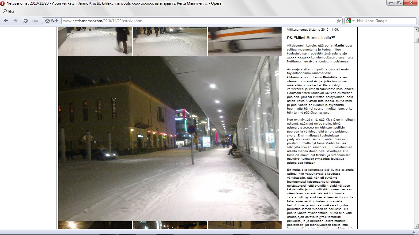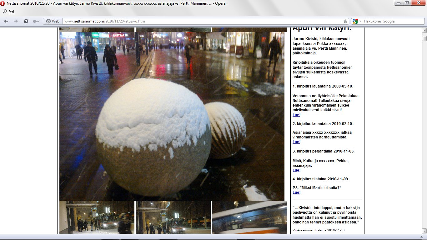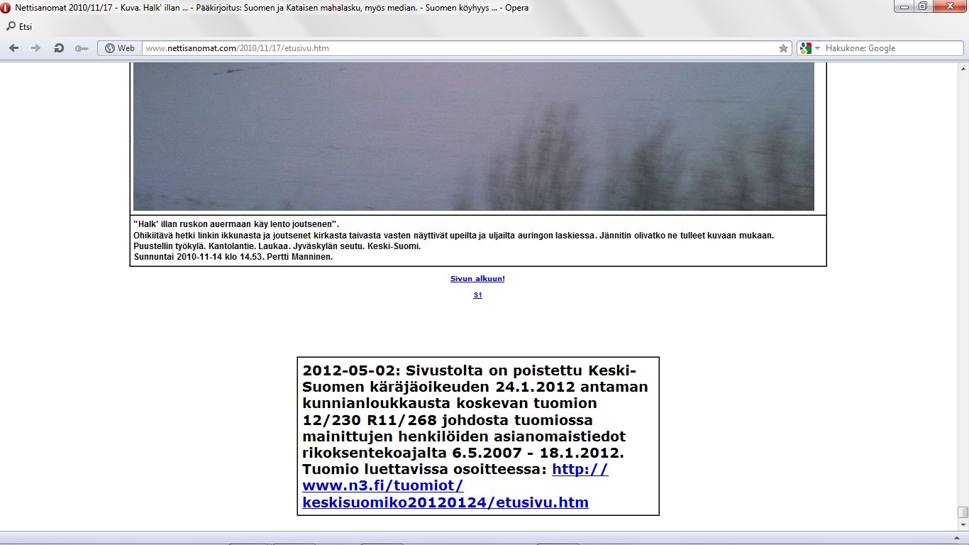 Jokaisella ko. ajanjakson sivun lopussa on seuraava merkintä poistamisesta: Päivämäärä ja teksti: "Sivustolta on poistettu Keski-Suomen käräjäoikeuden 24.1.2012 antaman kunnianloukkausta koskevan tuomion 12/230 R11/268 johdosta tuomiossa mainittujen henkilöiden asianosaistiedot rikoksentekoajalta 6.5.2007- 18.1.2012. Tuomio luettavissa osoitteessa: