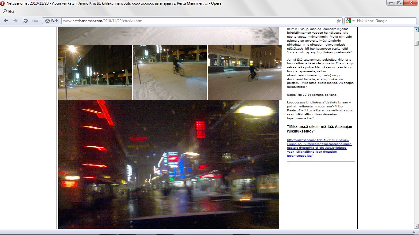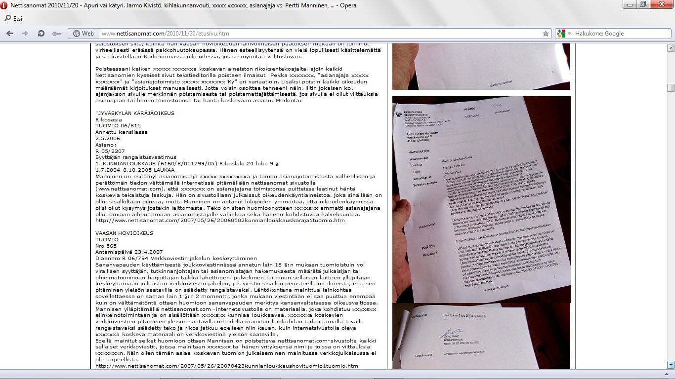 Oheisissa liitteissä on sivut siitä aineistosta, jotka käräjäoikeuden tuomion mukaan piti poistaa, mutta jota aineistoa ei ollenkaan käsitelty oikeudenistunnossa. Pyydän, että tämä aineisto otetaan huomioon kirjallisina todisteina, koska sitä ei ollut vielä silloin poistot tehtyinä, kun hovioikeus teki päätöksensä siitä, että se ei ota valitustani käsittelyyn. Nämä todisteet osoittavat sen, että käräjäoikeus on tarpeettomasti rajoittanut sananvapautta, koska niissä ei ole mitään asianomistajien kunniaa loukkaavaa.