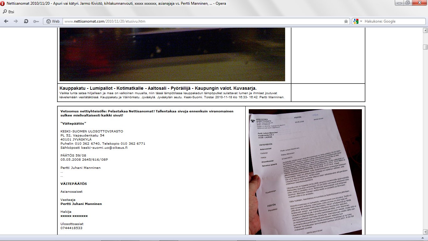 Keski-Suomen ulosottoviraston kihlakunnanvouti Iivari Järvinen lähetti 18.05.2012 kuulemiskirjeen asianajaja Pekka Monosen vaatimasta kirjoitusten poistamista koskevasta täytäntöönpanovaatimuksesta. Olin jo ennen kirjeen perilletuloa poistanut käräjäoikeuden vaatimat poistot, joista ilmoitin kihlakunnanvoudille kahdessa sähköpostissa seuraavasti: