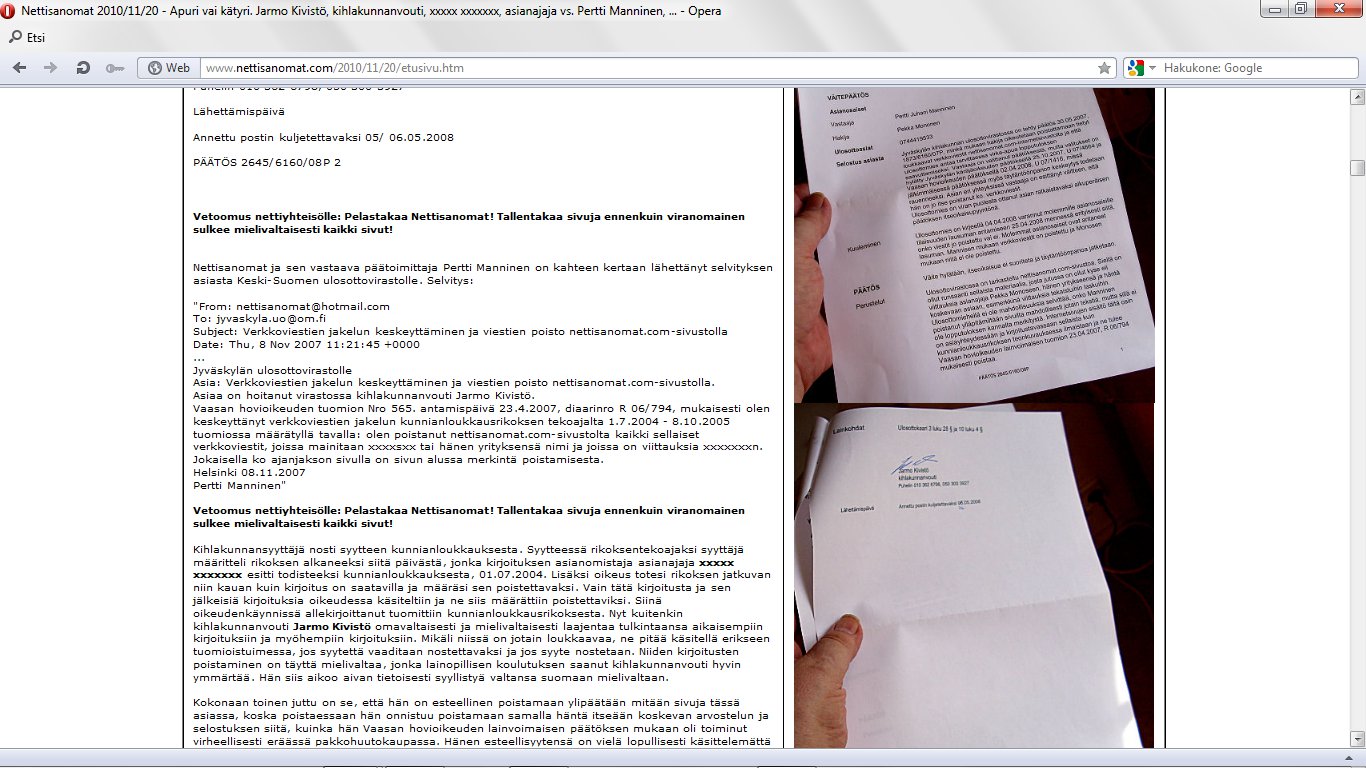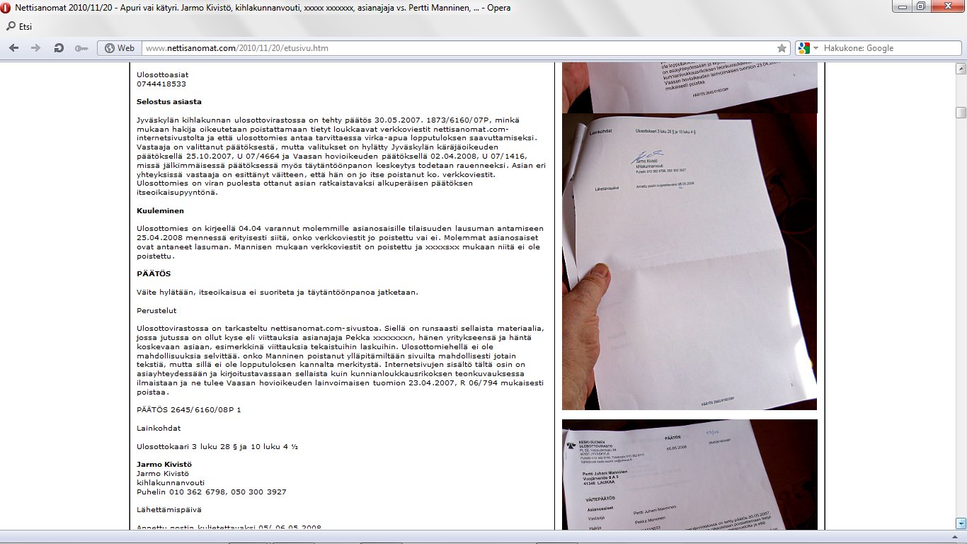 Viitaten puhelimessa käytyyn keskusteluumme, joka koski Keski-Suomen käräjäoikeuden 24.1.2012 antaman kunnianloukkausta koskevan tuomion 12/230 R11/268 täytäntöönpanoa, ilmoitan, että olen tehnyt poistot kaikilta hallinnassani olevilta sivustoilta käräjäoikeudessa käsitellyllä ja sen määräämällä tavalla rikoksentekoajalta ajanjaksolla 6.5.2007 - 18.1.2012.