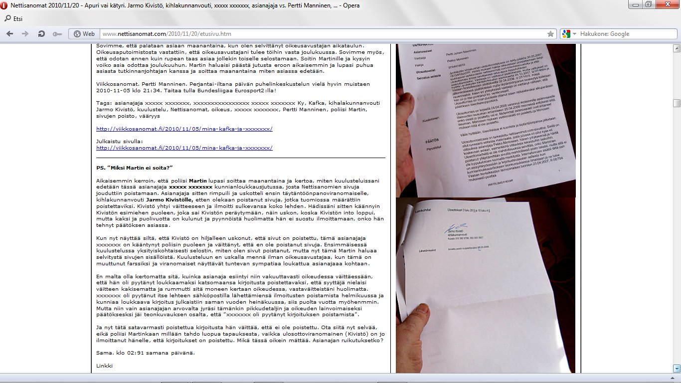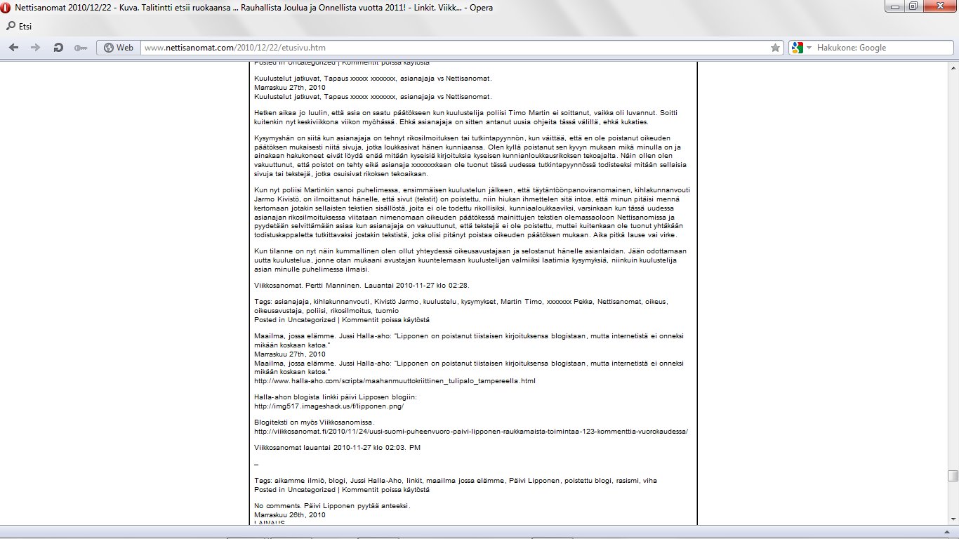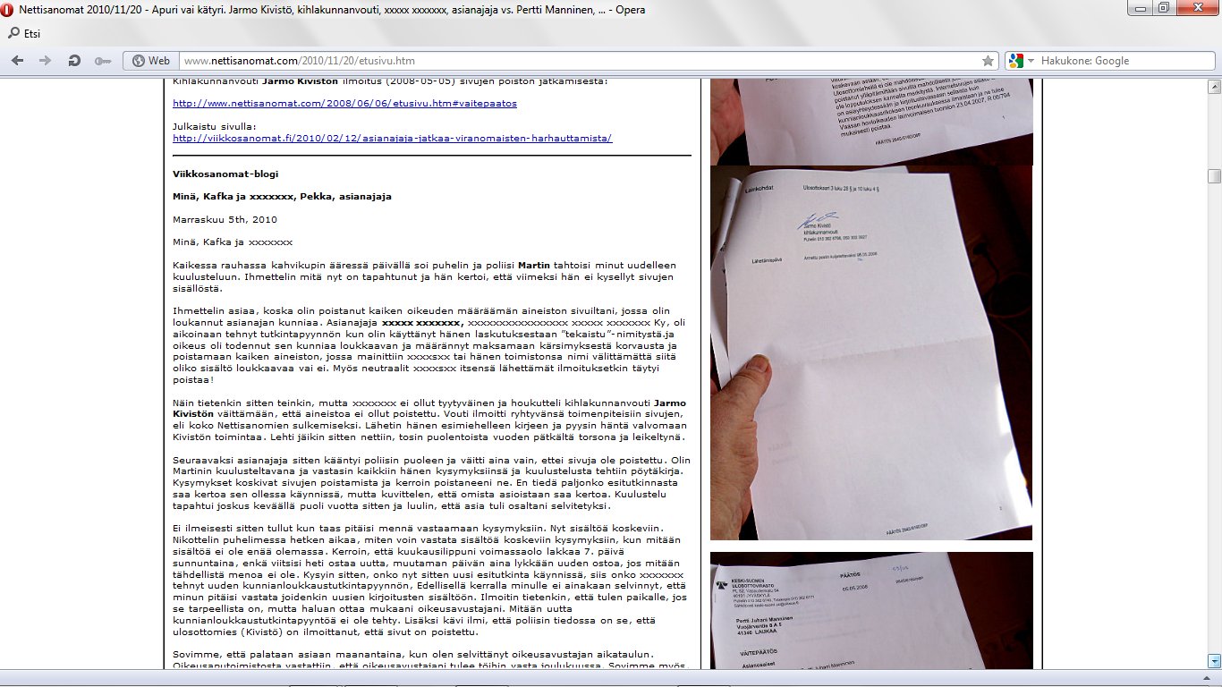 Oheisissa liitteissä on sivut siitä aineistosta, jotka käräjäoikeuden tuomion mukaan piti poistaa, mutta jota aineistoa ei ollenkaan käsitelty oikeudenistunnossa. Pyydän, että tämä aineisto otetaan huomioon kirjallisina todisteina, koska sitä ei ollut vielä silloin poistot tehtyinä, kun hovioikeus teki päätöksensä siitä, että se ei ota valitustani käsittelyyn. Nämä todisteet osoittavat sen, että käräjäoikeus on tarpeettomasti rajoittanut sananvapautta, koska niissä ei ole mitään asianomistajien kunniaa loukkaavaa.