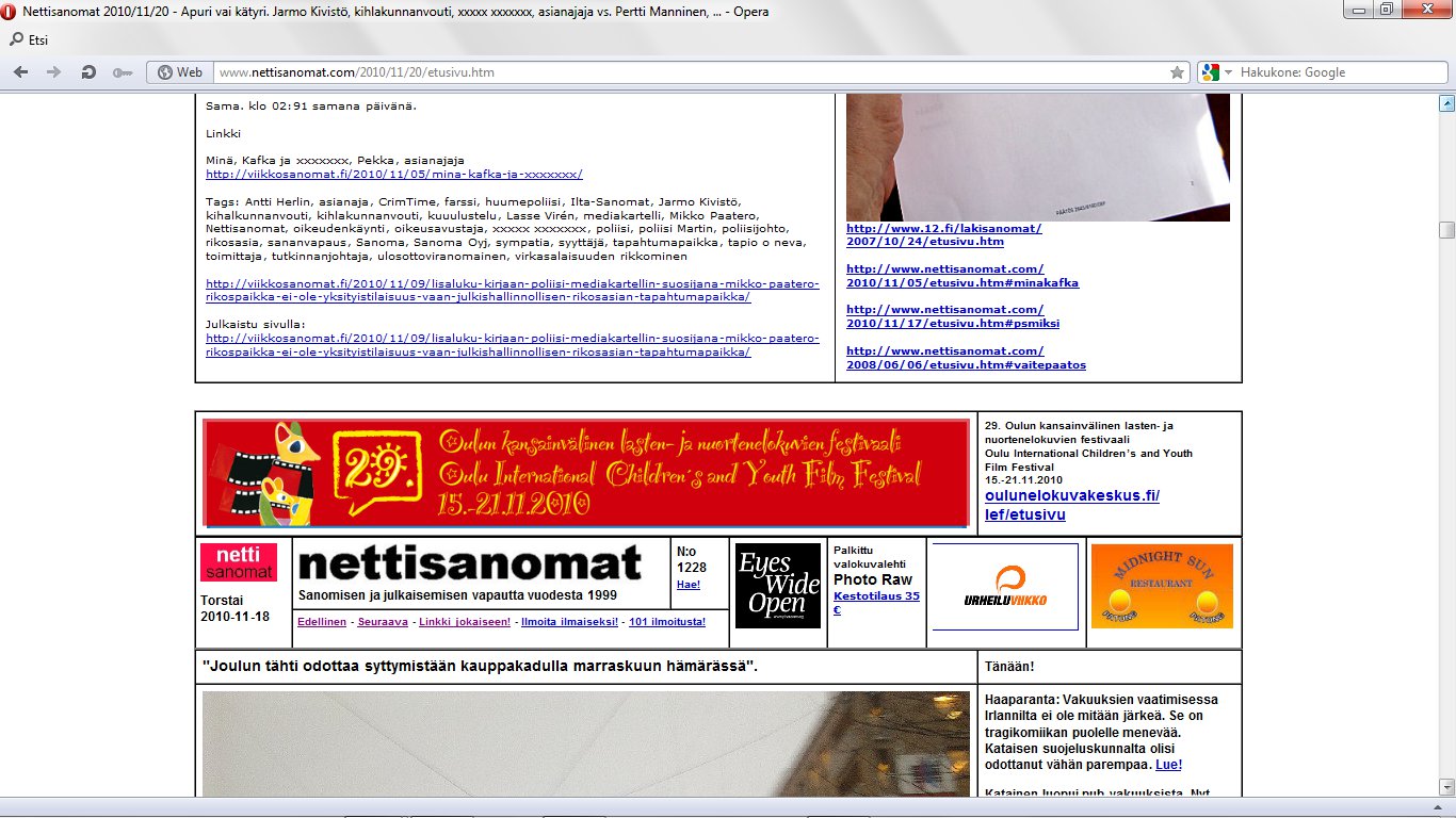 2. Hovioikeus on jättänyt voimaan sellaisen käräjäoikeuden tuomion, jossa käräjäoikeus on määrännyt rangaistuksen ja seuraamukset sellaisista asioista (kirjoituksista), joita ei ollenkaan käsitelty käräjäoikeudessa. Lisäksi käräjäoikeus on määrännyt poistettavaksi sellaisenaan (ilman minkäänlaista kommentointia) julkaistut oikeudenkäyntipöytäkirjat.