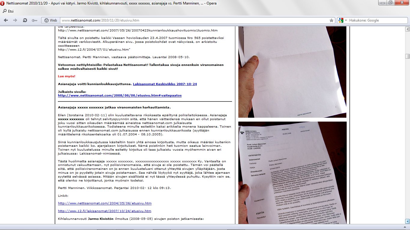 Viitaten puhelimessa käytyyn keskusteluumme, joka koski Keski-Suomen käräjäoikeuden 24.1.2012 antaman kunnianloukkausta koskevan tuomion 12/230 R11/268 täytäntöönpanoa, ilmoitan, että olen tehnyt poistot kaikilta hallinnassani olevilta sivustoilta käräjäoikeudessa käsitellyllä ja sen määräämällä tavalla rikoksentekoajalta ajanjaksolla 6.5.2007 - 18.1.2012.
