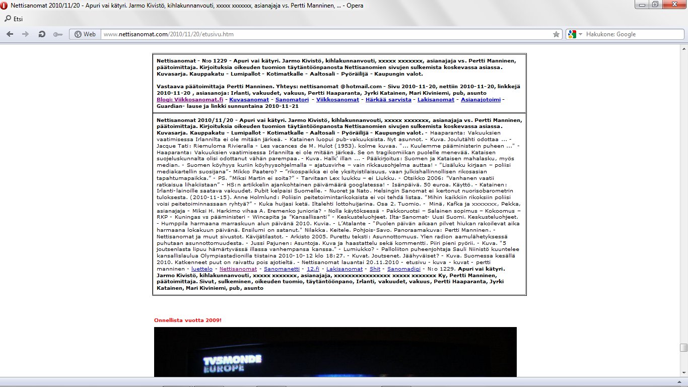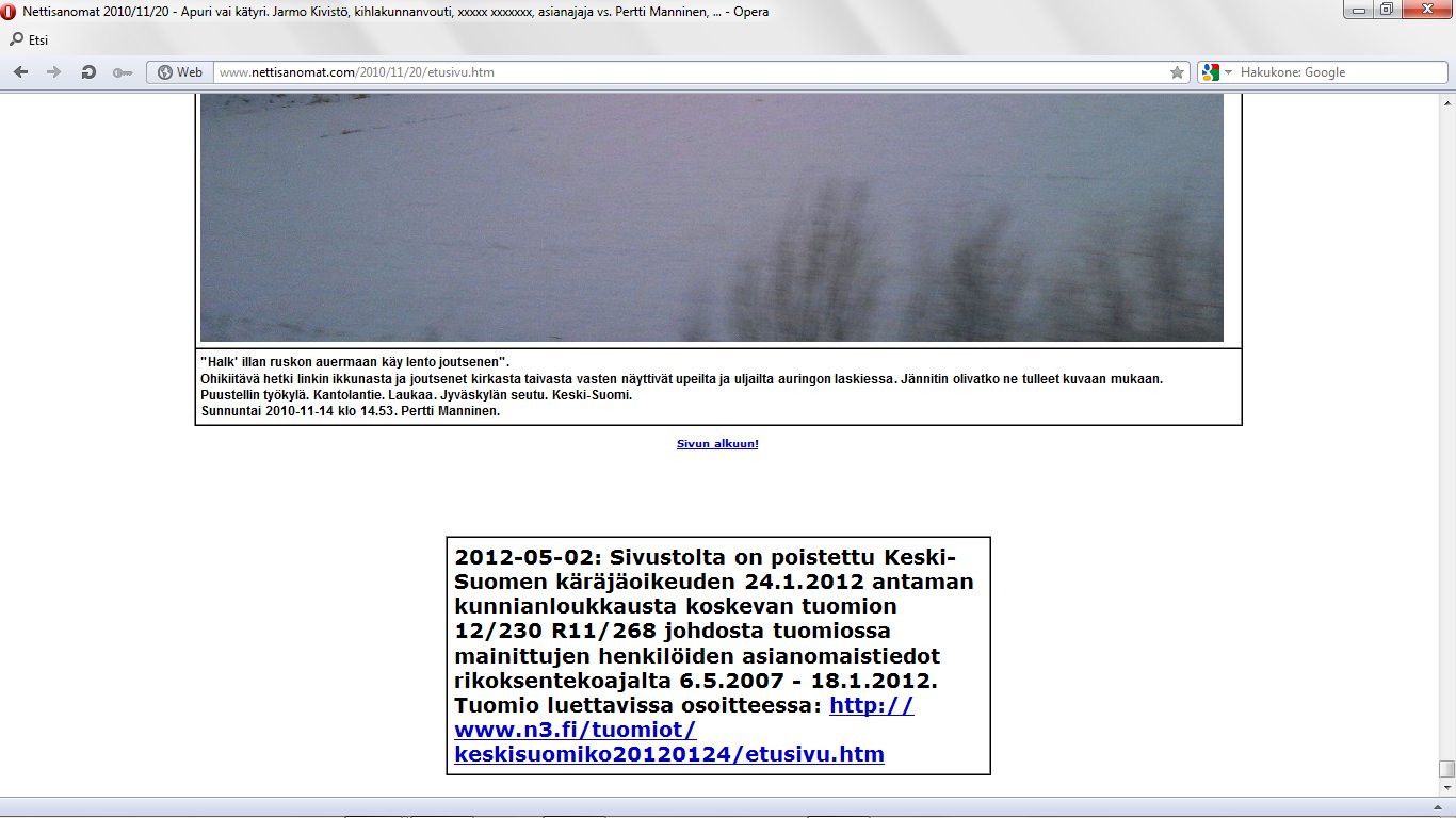 Jokaisella ko. ajanjakson sivun lopussa on seuraava merkintä poistamisesta: Päivämäärä ja teksti: "Sivustolta on poistettu Keski-Suomen käräjäoikeuden 24.1.2012 antaman kunnianloukkausta koskevan tuomion 12/230 R11/268 johdosta tuomiossa mainittujen henkilöiden asianosaistiedot rikoksentekoajalta 6.5.2007- 18.1.2012. Tuomio luettavissa osoitteessa:
