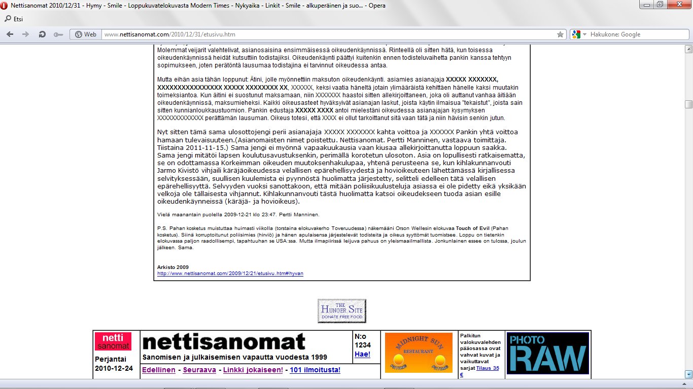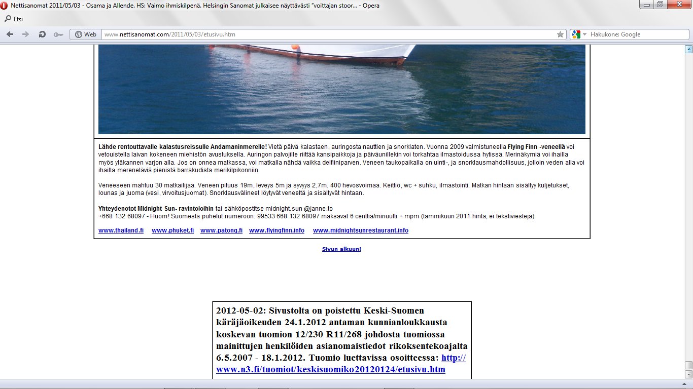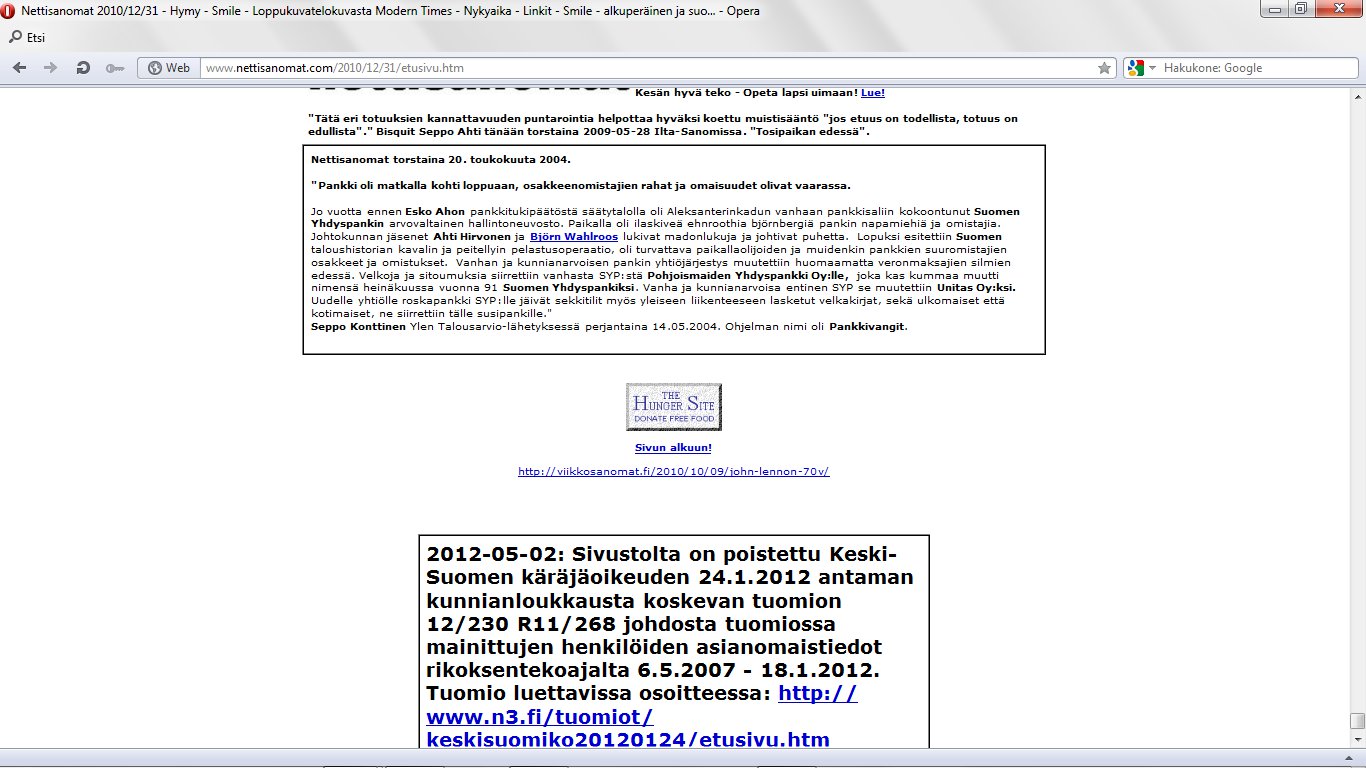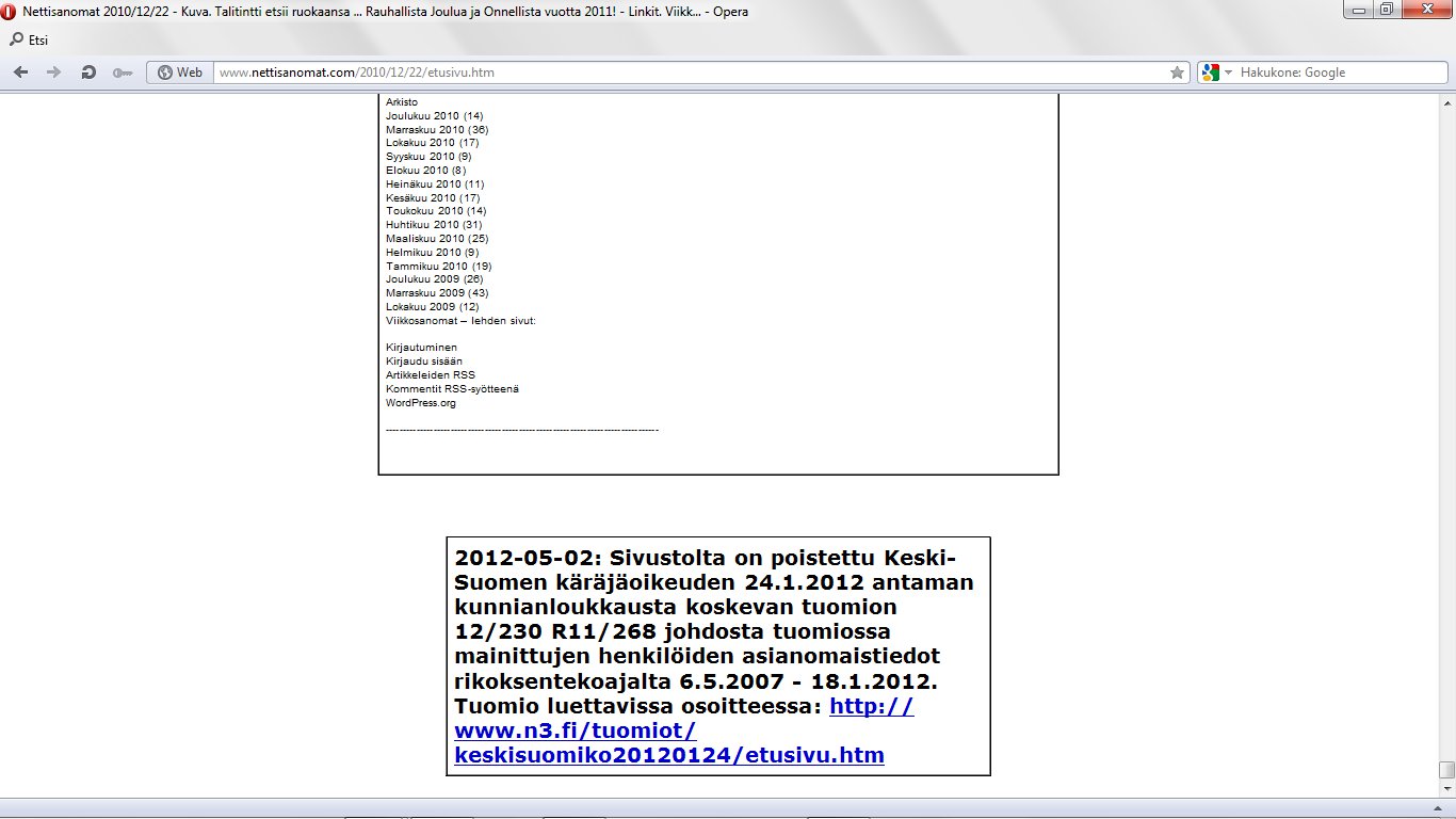 Nettisanomat 2012/07/08 - LIITE. Sivuja, joissa tuomio on pantu täytäntöön. Sivut 499-508/ 565. - VALITUSLUPAHAKEMUS KORKEIMMALLE OIKEUDELLE: Tuomio ja seuraamismääräys sellaisesta rikolliseksi väitetystä teosta, jota ei ole käsitelty oikeudessa ja oikeudessa rikolliseksi todettu, ei ole kansanvaltaisen oikeusvaltion oikeusjärjestyksen mukainen. - Kuva. Poika ja koira. - Kuva. Käden ojennus. Karuselli. - Sunnuntai 08.07.2012 - oikeussivu - Nettisanomat - Sanomanetti - Blogi: Viikkosanomat.fi - Kuvasanomat - Sanomatori - Viikkosanomat - Härkää sarvista - 12.fi - Korkein oikeus, sananvapaus, rajoittaminen, tuomio, käräjäoikeus, kansanvaltainen oikeusvaltio, oikeusjärjestys |