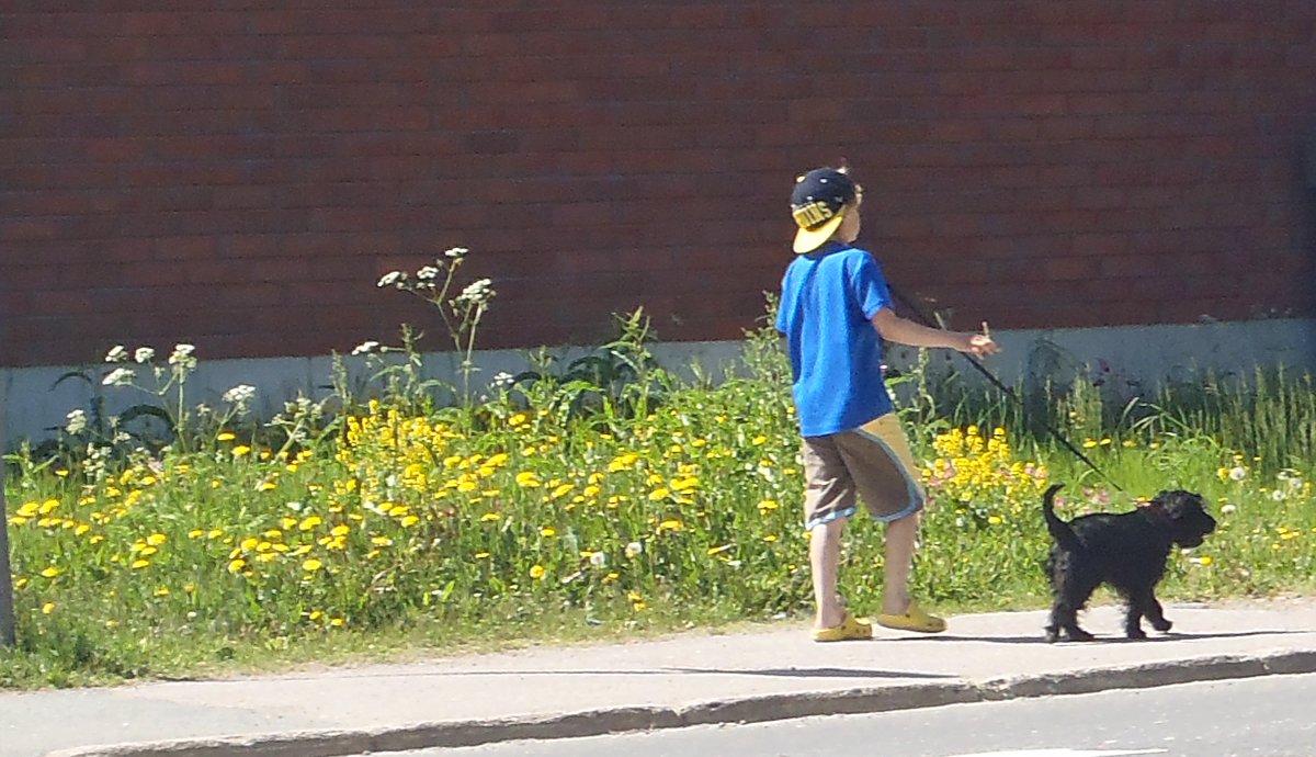 "Astelua asfaltilla". "Poika ja koira". "Sävyt". Keski-Suomi. Jyväskylä. Vaajakoski. Urheilutie maanantaina 2012-06-11 klo 12:49. Kuva Pertti Manninen. |