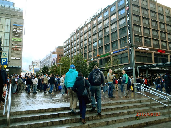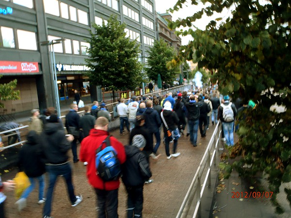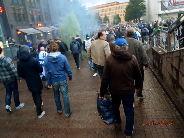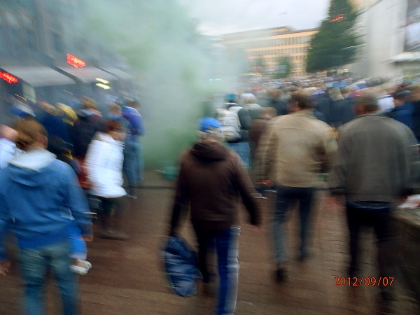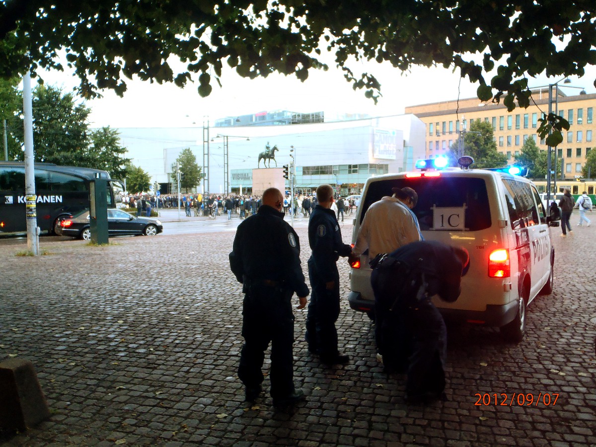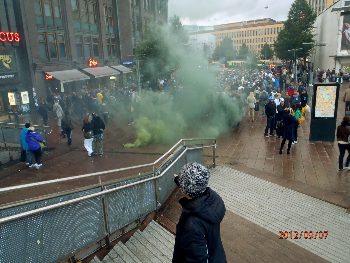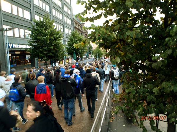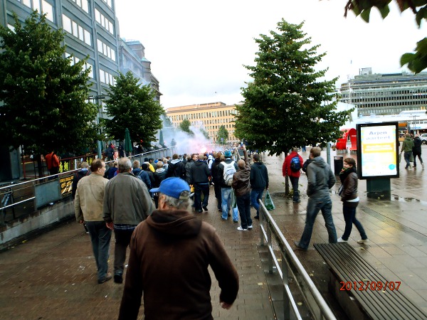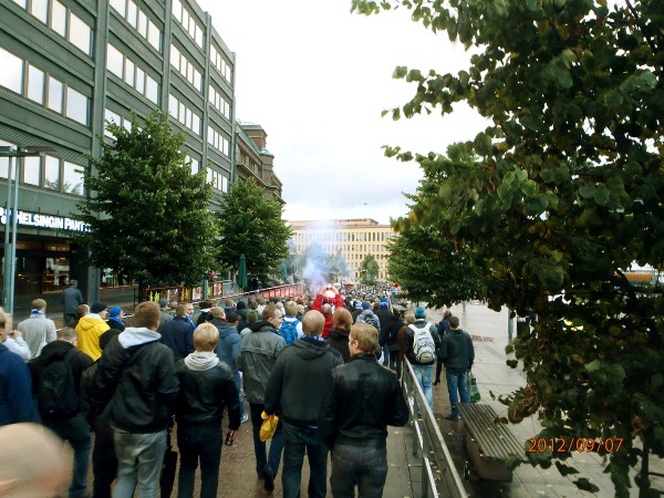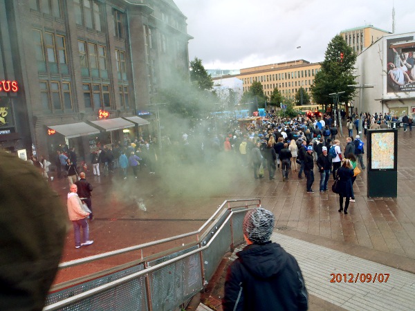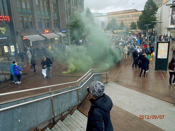 Helsinki. Mauno Koiviston aukio! Futis Forumin marssilta Suomi- Ranska maaotteluun Mannnerheimintietä pitkin. Lähtötummelmia. Perjantai 2012-09-07 19:36 ja 19:38. Kuvat: Pertti Manninen. |