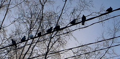 2013 Tammikuu. Kyyhkyset telakoituvat langalle välttääkseen turhan energiankulutuksen pakkasessa.