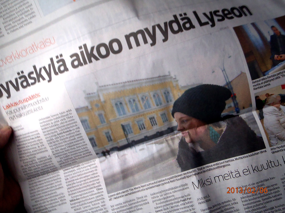 2013 Helmikuu. LYSEO LIHOIKSI!Jyväskylän kaupunginhallitus päätti eilen maanantaina 2013-02-04 äänestyksen jälkeen, 7-6, lopettaa Suomen vanhimman suomenkielisen oppikoulun lyseorakennuksessa ja siirtää toiminnan parinsadan metrin päähän Harjun kouluun, johon muodostetaan 1200 oppilaan mammuttikoulu.Päätöstä on nyt jahkailtu vuosikausia ja päätöstä on lähtenyt ajat sitten karkuun mm. kansanedustaja Sinuhe Wallinheimo (kok), joka tarmokkaasti aikanaan kannatti koulutoiminnan lakkauttamista tässä rakennuksessa. Nyt hänen ei sitä siis tarvinnut tehdä, kun asiaa ei tarvitse tuoda enää valtuuston käsiteltäväksi ja päätettäväksi. Päätösvalta on siirretty kuntien koulutusyhtymälle tai jollekin sellaiselle.Kaupunginjohtaja Markku Andersonin vilpitön ehdotus oli se, että kaupunki kunnostaa rakennuksen ja vuokraa sen sitten koulukäyttöön tälle kuntayhtymälle.Hylkäämisen taakse löytyi sitten tämä niukka enemmistö, joka oli sitä mieltä, että kaupungin pahassa, todella pahassa, taloustilanteessa ei voida ruveta rakennusta kunnostamaan. Kustannusarvioksi oli saatu 20 miljoonaa euroa. Nyt kaupunki lunastaa rakennuksen itselleen tasearvolla , 1 miljoonalla eurolla.Tulevaisuus sitten näyttää lahjoittaako kaupunki rakennuksen ja tontin ilmaiseksi, 1 eurolla, jollekin rakennusliikkeelle. Tällaisesta on kokemusta Valtiontalon ja vanhan funkishuoltoaseman, ns. Reimarin tontin lahjoittamisesta SRV-yhtiölle. Asia on KHO:ssa ratkaistavana.Nyt tehty ratkaisu on sillä tavalla perusteltu, että säästetään 20 miljoonaan euroa, tosin rakennus menetetään ja mahdollinen imago, mutta sitähän ei voida mitata rahassa silloin kun ei haluta mitata.Bisnesmiehet nauravat partaansa sillä hyväntekijöitä hekään eivät ole. Ehkä parinsadan asunnon, lukumäärä arvioitu, tuotoilla jo jotain kunnostaakin, Onhan sillä tontilla 100 metriä Harjulle avautuvaa pihaa ja ehkä 50 metriä toiselle kadulle Kauppahallin yli torille avautuvaa rakentamismahdollisuutta lukion lisärakennuksen tultua puretuksi. Eiköhän siellä kulmassa oleva temppelikin lähde alta pois, kun tilalle saadaan kaava 6-9 -kerroksiselle asuinrakennukselle.Eikä tämä ole ensimmäinen kerta kun kouluja puretaan keskustasta asuinrakennusten tieltä ja uusiakin suunnitelmia on vaikka kuinka paljon varastossa!Nettisanomat. Pääkirjoitus. Pertti Manninen. Tiistaina 2013-02-05 23:40.Kuva: Lyseo Asemakadun yläpäässä Yliopiston kadulla kuvattuna vauhdissa Vapaudenkadulla kulkevan bussin ikkunasta tätä kirjoitusta varten tänään tiistaina 2013-02-05 16:15. Pertti Manninen. |