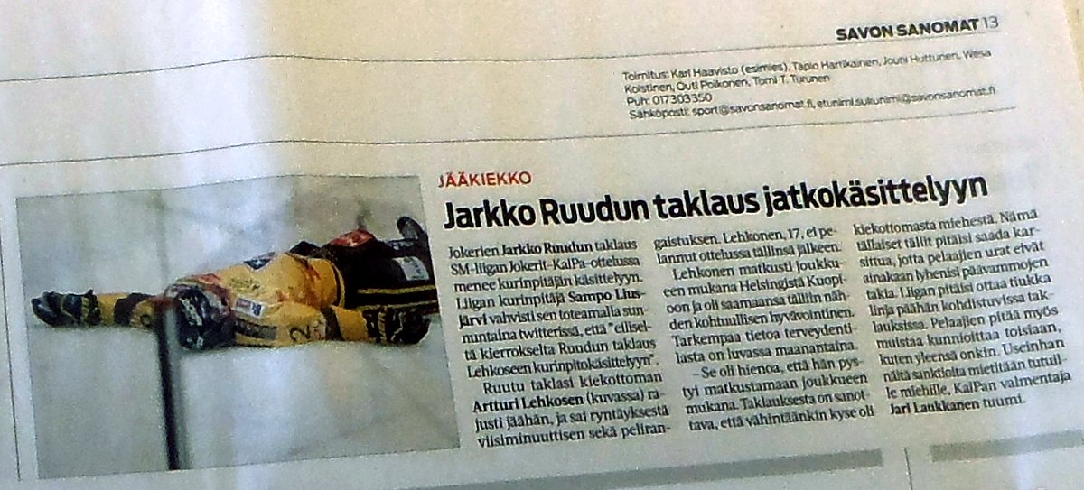 Nettisanomat 2013/02/20 - Urheilu. Harry Harkimon Jokerien Jarkko Ruutu teloo ... - Savon Sanomat: Sunnuntaina 17.02.2013: Jokerien Jarkko Ruutu teloi tylysti KalPan Artturi Lehkosen - Maanantaina 18.02.2013: Jääkiekko. Jarkko Ruudun taklaus jatkokäsittelyyn. - Tiistaina 19.02.2013: Jääkiekon SM-liiga. "Valot sammuvat tänään". Jarkko Ruutu uhkaili ja jahtasi Artturi Leinosta koko ajan lauantai-illan pelissä. - Kommentti. Wesa Koistinen: Ruumiitako tässä odotellaan? - "Piittaamattomuudesta annettava tuntuvat sanktiot". SM-liiga: Toimitusjohtaja Jukka-Pekka Vuorinen on valmis koviin rangaistuksiin, kun vastustajan kunnioittaminen unohtuu. - Keskiviikkona 20.02.2013: Kaukaloväkivalta. Syyttäjä hämmästelee vaikenemista. -Kaukaloväkivalta. "Kukaan ei tiedä yhtään mitään". Helsingin kihlakunnansyyttäjä Eija Velitski hämmästelee jääkiekkopiirien sisäistä vaikenemisen lakia. - "Aivotärähdyksistä kovemmat sanktiot" - Kommentti. Jouni Huttunen: Valtio valtiossa. - Jokerien yhteistyökumppani Isku ei tykännyt Ruudun niitistä. - Savon Sanomat sunnuntaista keskiviikkoon 17.02.2013- 20.02.2013. - Kuva. Maailmassa monta on ihmeellistä asiaa. - YL Raportti: Paskoimme housuun bussissa Turkuun - Ylioppilaslehti - Toiset kahdeksan kuvaa - BISQUIT Himphamppua: "Kummola ei käyttänyt kannabista!" Ilta-Sanomat - - Kuva: Houkuttelua häämessuille. - Kuva. Sihti. Firmamessut 2013 - Kokoelmasta RAKASTA. Aforismeja, runoja ja mietteitä vuoden jokaiselle kuukaudelle. Toimittanut Arto Manninen. Gummerus 2012. Helmikuu. - Kuva. Lumetta lumessa. - Kuva. Käden ojennus. Karuselli. - etusivu - Tiistai 19.02.2013 - Nettisanomat - Sanomanetti - Blogi: Viikkosanomat.fi - Kuvasanomat - Sanomatori - Viikkosanomat - Härkää sarvista - 12.fi - |