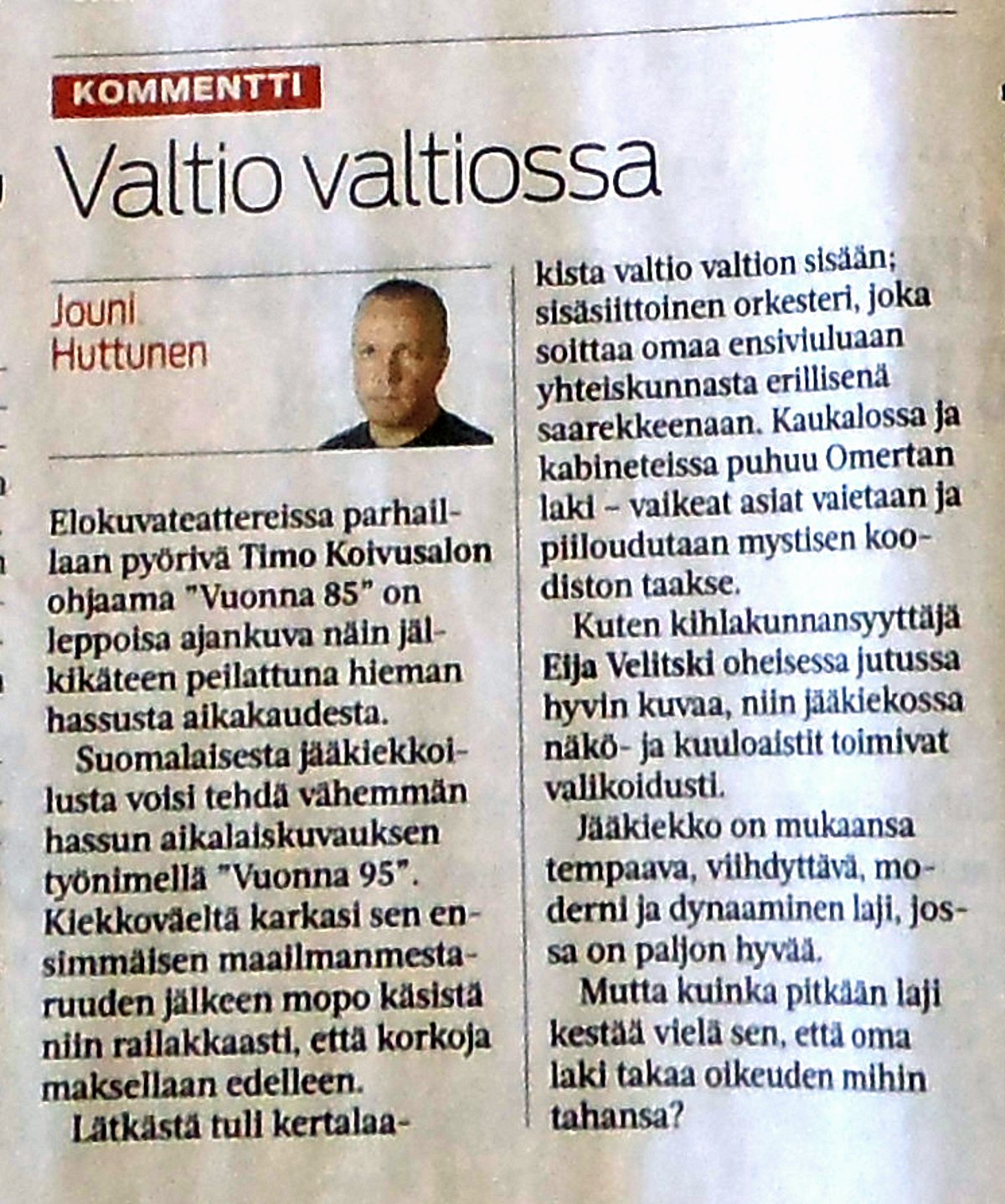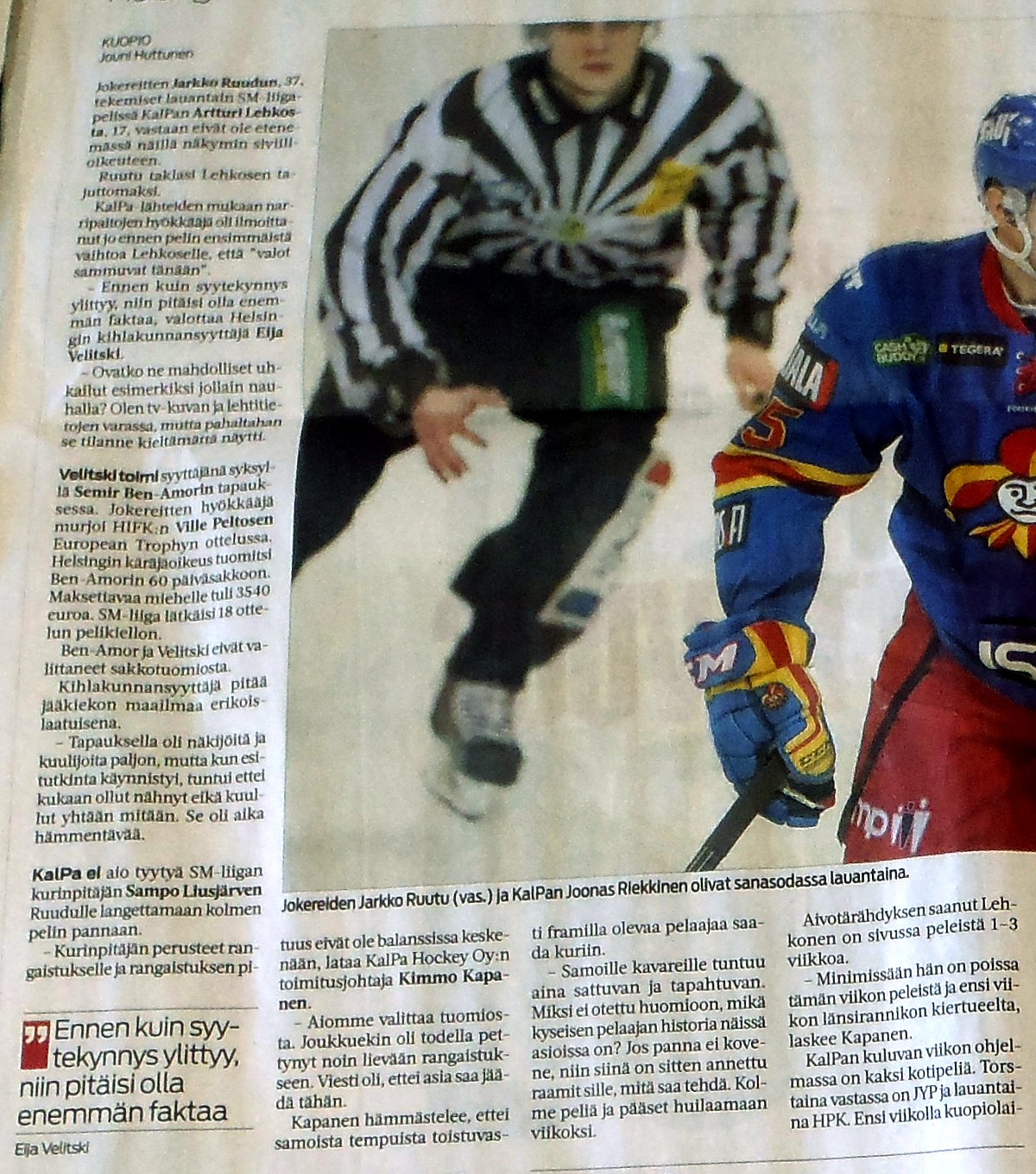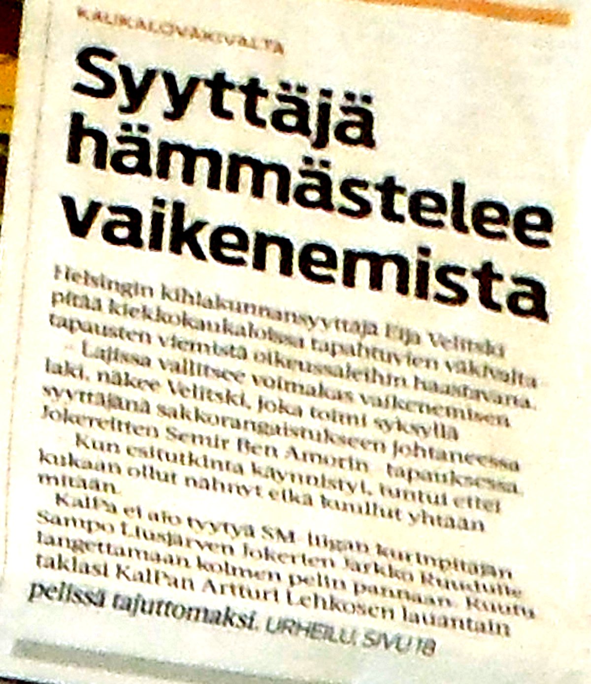 Arkisto 2011 Käskyttikö Harkimo teloituksen? Jääkiekko on vauhdikas peli niin kiekkokaukalossa kuin sen ulkopuolellakin. Se on viihdettä ja bisnestä urheilun nimellä. Siinä on sääntönsä pelaajille, joita tuomarit sitten vahtivat ja määräävät rangaistuksia rikkeistä. Säännöt on tietenkin tehty pelin ja pelaajien suojelemiseksi. Lajin harrastajat pitävät siihen kuuluvana erilaiset nyrkkitappelut ja kärhämät. Ne ovat siis sallittuja, toisin kuin esim. jalkapallossa, nyrkin iskusta ja läppäisystäkin joutuu armotta suihkuun! Tällaiseen
