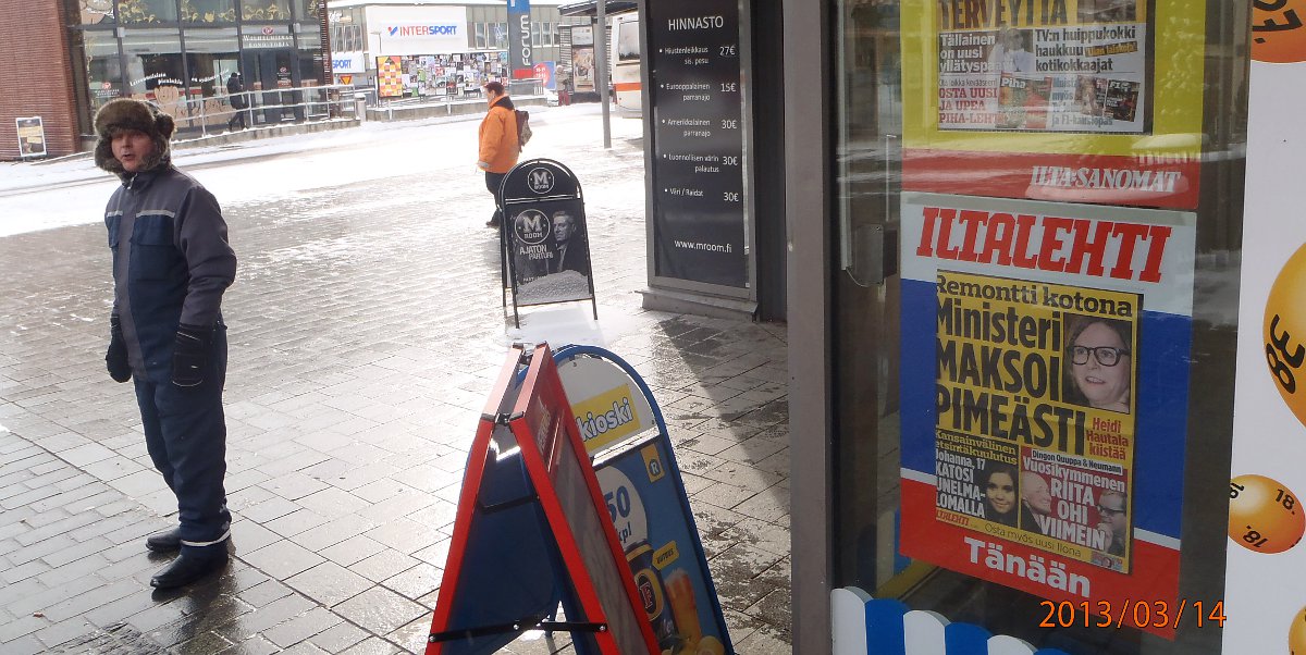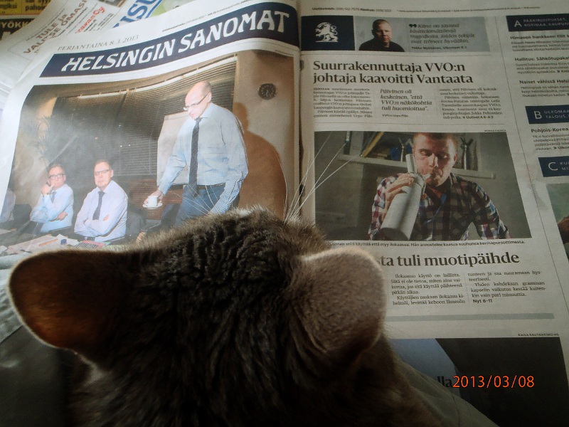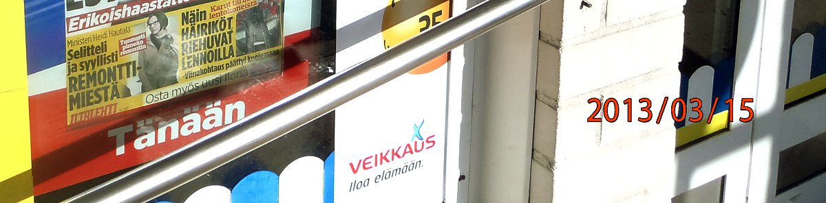 Helsinki. Keskusrautatieasema. - Kansallismaisema 2013. Helsinki. Eduskuntatalo. Video. Muutama minuutti junalla Pasilasta Keskusasemalle. Radan länsipuoli on rakennettu jo melkein kokonaan umpeen niin, että kansallisrakennukset vain vaivoin pilkistävät uudisrakennusten välistä. Eduskuntatalokin juuri juuri näkyy kokonaan pikkuruisen hetken junan hiljentäessä vauhtiaan. Liittyy Nettisanomien 2002 julkaistuun kirjoituksen ja kuvitukseen "Kansallismaisema 2010". Kevätpäiväntasaus. Eino Leino. Osia Aurinkolaulusta. - - Kuvia viikolta 12 - Panu Rajala: ”Odotin kieli pitkällä... - "Häpeilemättömän toiminnan luonne paljastuu näin ikävällä tavalla". Asianajaja Pekka Mononen, Asianajotoimisto Pekka Mononen Ky, Vantaa - Kunnianloukkaus, Nettisanomat,, Pertti Manninen, päätoimittaja - Kuvat. Minnan kuvaus, Minna odottaa, Minna muistettuna. - Minna Canthin patsas. Jyväskylä - Minna Canthin päivä. Tasa-arvon päivä. - Kuva. Kunnantalo ja potkukelkkaa työntävä asukas alle 20 000 asukkaan kunnassa - Ylen teksti-tv: Hautala: Olen pettynyt itseeni - Henriksson: Hautala ei voi jatkaa - Haavisto: Hautalan asema epävarma. Kehitysministeri Heidi Hautala (vihr.) - Oikeusministeri Anna-Maja Henriksson - Vihreiden eduskuntaryhmän puheenjohtaja Pekka Haavisto. - Video. Heidi Hautala-case - Kalle Isokallio - Iltalehden lööppi. Ministeri Heidi Hautala. Tunnusti pimeän remontin. Selitteli ja syyllisti remonttimiestä . Heidi Hautala ei täytä enää lain vaatimuksia ministerille. (Valtioneuvosto 60 §). - Jyrki, Robin ja Minä - A fantastic Robin Concert. Positive, full of energy. A great young man. - Osasuurennos Alexander Stubbin kuvasta. - Uhkailua. - Jyrki Katainen . Kuvat. Pyöräilevät pojat. Lumikissa, Vauhti ja Linnut - Kuva. Lintu jostakin, Keljonlahden savu. Jyväskylä. Kuvat. Jyväskylä. Kaupunginkirkko, Kaupunginteatteri, Muuntaja, Valtiontalo, Tyhjä tontti, Kunnallistalo. - Vantaa. Krp:n tutkinta on laajentunut, epäiltyjä on useita. - Tapio Päivinen, Jukka Peltomäki, Leila Tuominen, VVO, Arkkitehtitoimisto Forma-Futura. - Matti Nykänen kertoo suunnitelmistaan.