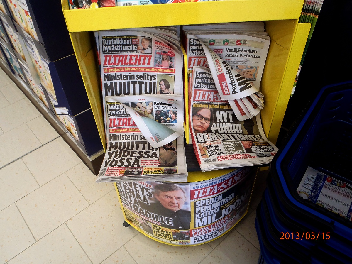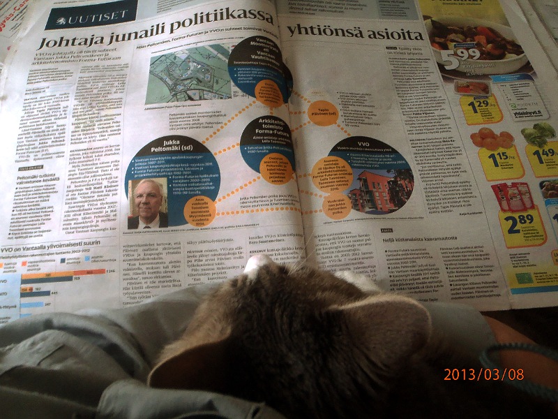 2013 Maaliskuu. Torstaina muutamaa minuuttia ennen puolta yötä: Heidi Hautala ei täytä enää lain vaatimuksia ministerille. (Valtioneuvosto 60 §).Heidi Hautala ei täytä enää lain vaatimuksia ministerille: ”Suomen perustuslaki: Ministerien on oltava rehellisiksi ja taitaviksi tunnettuja Suomen kansalaisia. (Valtioneuvosto 60 §). Ministeri Heidi Hautalan paljastunut pimeän rahan ilman kuittia tapahtunut maksaminen rikkoo ainakin toista perustuslain vaatimusta ministerille. Jos hän on maksanut tietoisesti palkkion pimeästi, hän ei ole rehellinen, Jos hän sitten ei ole tiennyt siitä, että hänen maksutapansa on ollut lakia rikkova, hän on taitamaton! Se, että tämä tapaus on sattunut vuonna 2009 jolloin hän ei vielä ollut ministeri, ei häntä enää vapauta. Nyt hän ainakin on siis epärehellinen tai taitamaton ja parasta olisi, että hän vetäisi itse johtopäätökset asiasta. Tähän on syytä kertoa, joka on jo jäänyt unhoon, että hän oli ehdolla edellisen hallituksen ministeriksi juuri tuohon aikaan. Hän hävisi Vihreiden äänestyksessä, mutta röyhkeys oli jo siinä, että asettui ehdolle, vaikka rikkoi lakia maksaessaan pimeitä palkkioita ilman kuittia, Hallituskumppanit pitävät hänestä kiinni, koska hän on tehnyt palveluksia: Pelastihan hän SDP:n Harri Sailaksen, Raimo Sailaksen veljen, Finnairin Mika Vehviläisen asuntokauppasotkuissa, kun Sailas piiloutui sen taakse, että hän ei tiennyt niistä mitään. Olihan Sailas kuitenkin vastuussa alaistensakin tekosista. Viikkosanomat. Pertti Manninen. Torstai 2013-03-14 23:53 Tags: asuntokauppa, ehdokkuus, epärehellinen, harmaa talous, Harri Sailas, Heidi Hautala, Mika Vehviläinen, ministeri, perustuslali, pimeä palkkio, Raimo Sailas, rehellinen, rikos, Sdp, taitamayon, taitava, vihreät Helmikuussa 2012Harri Sailas, sdp sai vihreän synninpäästön Heidi Hautalalta tässä Mika Vehviläisen asuntokaupassa. Kommentti Hautalasta uuden Suomen keskustelussa.Uusi Suomi: keskustelu: Surullinen prosessi Hautala on puhunut kauniisti Dalai-lamasta ja Tiibetin ongelmista. Riittääkö se tekemään ihmisestä hienon ja rehellisen. Jokainen ihminen voi luisúa väärille raiteille. Moraali on vaikea asia. Muutokset siinä tapahtuvat niin pikku hiljaa, ettei ihminen aina itsekään tajua itsessään tapahtunutta muutosta. LAINAUS LOPPUU Tällä kertaa pelastustehtävään joutui läpimätä poliitikko Hautala. Vrt Alho-Sundqvist- Lipponen. Viikkosanomat. Pertti Manninen. Perjantai 2012-02-18 klo 23:39. Uuden Suomen jutusta joitakin lauseita: ”Valtion omistajaohjauksesta vastaava ministeri Heidi Hautala (vihr.) ilmoitti perjantaina tyytyvänsä Finnairin johdon selvitykseen kohun herättäneistä asuntokaupoista ja Finnairin ja Ilmarisen johdon ”ristikkäisistä kytköksistä”. Kaikkia synninpäästö ei miellyttänyt, sillä kansanedustaja Jukka Kärnä (sd.) kuvaa tapausta Aamulehdessä lähes ”kähminnän maailmanennätykseksi”. Hautala tapasi tänään Finnairin toimitusjohtajan Mika Vehviläisen ja Ilmarisen toimitusjohtaja Harri Sailaksen. Tapaamisen jälkeen Hautala ilmoitti, että asia on loppuun käsitelty. –Ministeri on vakuuttunut siitä, että kaikki on sujunut hyvän hallintotavan ja lakien mukaan, tiedotteessa kerrotaan.”’ LAINAUS LOPPUU Tags: Arja Alho, asuntokauppa, Finnair, Harri Sailas, Heidi Hautala, kähmintä, läpimätä, Mika Vehviläinen, Paavo Lipponen, Sdp, tä, Ulf Sundqvist, vihreät, ylihinta |