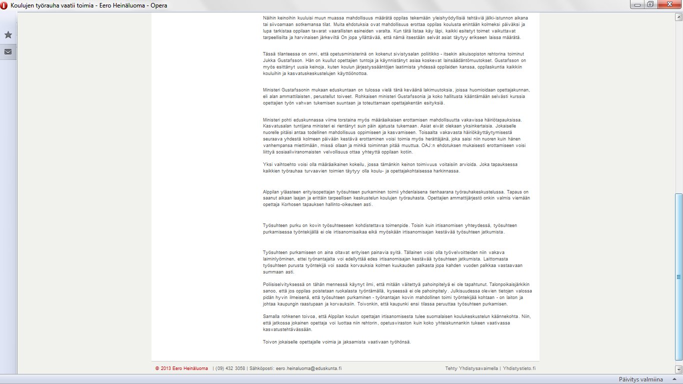 Samalla rohkenen toivoa, että Alppilan koulun opettajan irtisanomisesta tulee suomalaisen koulukeskustelun käännekohta. Niin, että jatkossa jokainen opettaja voi luottaa niin rehtorin, opetusviraston kuin koko yhteiskunnankin tukeen vaativassa kasvatustehtävässään.