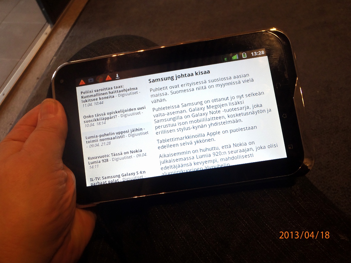 Hauska tapaus sattui kun Helsingin metrossa vastasin viime syksynä puhelimeen ja kun vedin tämän 7-tuumaisen esiin, niin eräs nuori maahanmuuttaja ystävällisesti kysyi, mikä ihmeen puhelin sinulla on. Ylpeänä esittelin tätä ja hymyilimme.