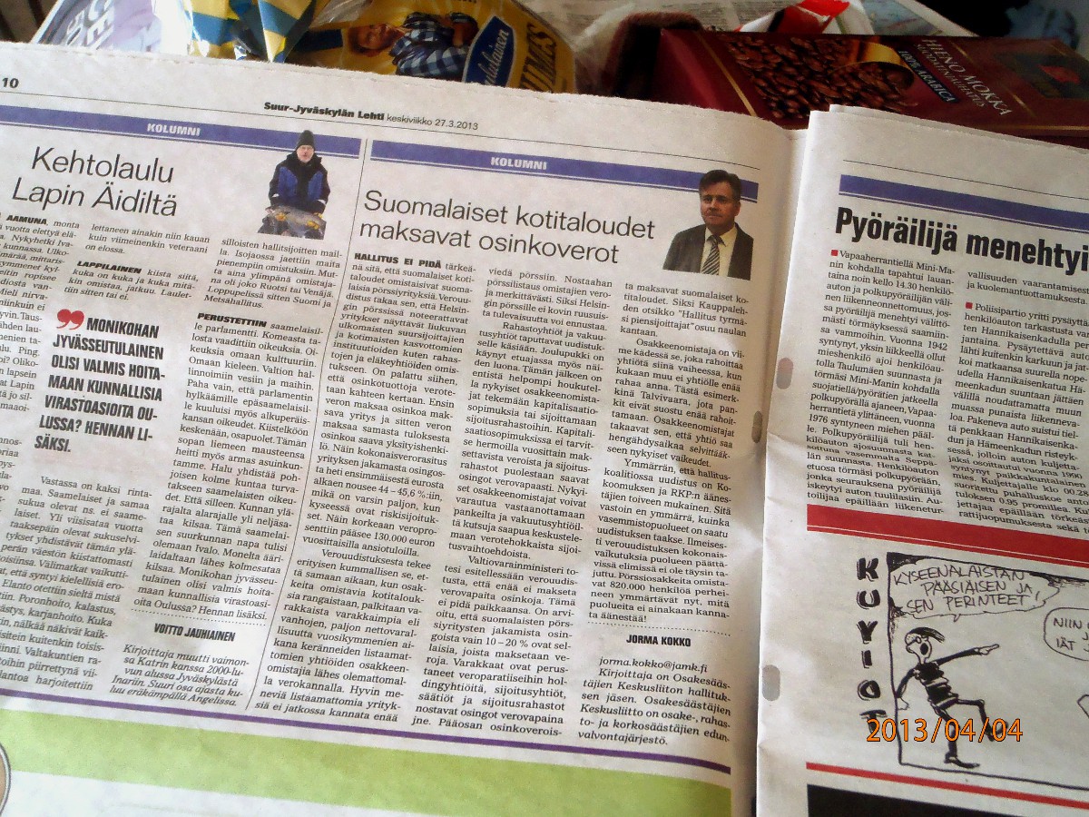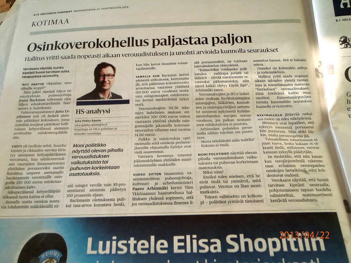 ViikkosanomatOsinkovero. Päättymätön tarina. Osa 3. Suuri puhallus ja sekavat esimerkit.huhtikuu 21, 2013 Suuri puhallus. Viikko sitten sunnuntaina Keskisuomalainen ja varmaan muutkin maakuntalehdet laskivat sen epäoikeudenmukaisuuden, joka hallituksen uudessakin esityksessä on. Lisäksi lehdessä epäiltiin, ettei se ensimmäinen esitys ollutkaan tapaturma vaan suunniteltu juttu, jonka ainakin kokoomus ymmärsi. Kritillisdemokraattien Päivi Räsänen puolusti Iltalehdessä aikaisemmin sitä ensimmäistäkin. Viikolla Helsingin Sanomat löi pöytään asiakirjoja, jotka vääjäämättä osoittivat, että hallituksen ensimmäinen osinkoveropäätös ei ollut virkamiesten esityksen mukainen. Se oli hatusta, kokoomuksen?, vedetty, vaikka jossain excel-taulukossa hallituksen esitys oli mukana ja jonka kaiketi joku virkamies sitten ojensi pääministeri Jyrki Kataiselle ja valtiovarainministeri Jutta Urpilaiselle ja jota kulttuuriministeri Paavo Arhinmäki ei ymmärtänyt omien väitteittensä mukaan. Tänään sunnuntaina sitten HS on lasketuttanut uusien päätösten vaikutuksia ja ei hyvältä näytä. Rälssiluokka senkun kasvaa ja voimistuu ja saa kirstuunsa enemmän etuja aikaisempaan, nykytasoon verrattuna. Uudessa Suomessa sitten Osmo Soininvaara osoittaa nämä uudetkin laskelmat virheellisuksi. Hän kertoo, että laskelmissa on se ajatusvirhe, että eihän listaamattomista yhtiöistä kannata kaikkea tuloa ottaa osinkoina, vaan kannattaa ottaa 38 000 euroa palkkana, kun tuollaisen verotus on keveä. Hän pääsee siihen tulokseen, että jo 100 000 euroa tienaava temppuyhtiö tuottaa nykyiseen verrattuna 4 000 euroa enemmän. KAIKEN KAIKKIAAN JO TÄMÄ SOTKU ON JO SITÄ LUOKKAA, ETTÄ VEROPROSENTTIKIKKAILU TULISI LOPETTAA JA POISTAA KAIKKI RAJAT JA VEROTTAA SAMALLA PROSENTILLA! Pienet osinkotulot voitaisiin vapauttta kokonaan verosta ja pörssin alasajo pitäisi myös lopettaa toisin kuin hallitus nyt päätöksillään tekee. Viikkosanomat. Pertti Manninen. Sunnuntai 2013-04-21 20:49. (Painovirheet korjattu ja avainsanat ja linkit lisätty maanantaina 2012-04 22 07:03) Tags: alasajo, epåoikeudenmukaisuus, hallitus, Helsingin Sanomat, HS, iltalehti, Osinkovero. Päättymätön tarina? Heikki Niskakangas kumoaa Sampsa Katajan ja Matti Vanhasen väitteen siitä, että osinkojen maksu osakkeenomistajille synnyttää työpaikkoja. Yle A-studio Talk 4.4.2013 2013 Huhtikuu. Osinkovero. Päättymätön tarina? Osinkoveropäätöksen synty ja oikeudenmukaisuus. Paavo Arhinmäki ja Jutta Urpilainen kertovat tai sitten eivät. Mukana myös Jyrki Katainen ja Jan Vapaavuori. 2013 Huhtikuu. Osinkovero. Päättymätön tarina? Osa 2. |