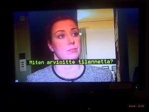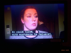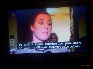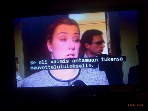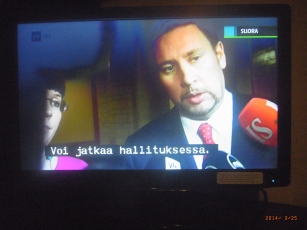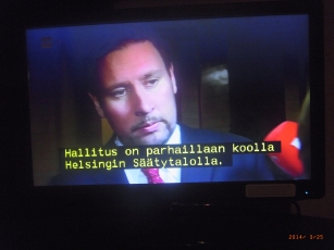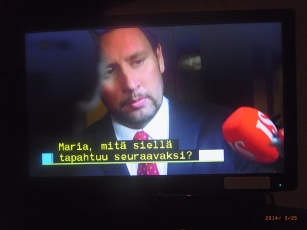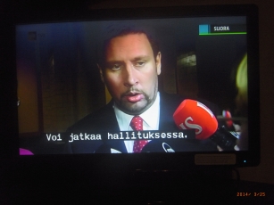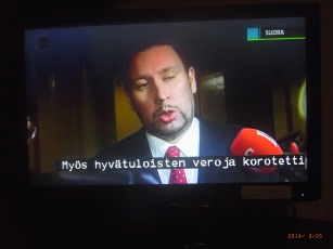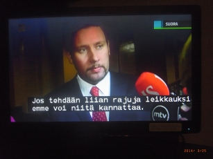Hallituksen suuressa SOTE-tiedotustilaisuudessa olivat edustettuina kaikki eduskuntapuolueet VASEN-ryhmää lukuunottamatta. Valtiovarainministeriön säästöbudjetin johdosta pöytiä ei riittänyt kaikille. Vain Sdp:n Jutta Urpilainen, Kokoomuksen Jyrki Katainen, Perussuomalaisten Timo Soini ja Keskustan Juha Sipilä pääsivät pöydän ääreen. Kuvassa tuoleilla, joita onneksi oli riittänyt, etualalta loittonevasti: Kristillisdemokraattien Päivi Räsänen (kuuntelee), RKP:n Carl Haglund (katselee tummassa solmiossaan), Vihreitten Ville Niinistö (kirjoittaa arvokkaan näköisesti muistiinpanoja) ja Vasemmistoliiton Paavo Arhinmäki (vilkuilee vasemmalle kirjavissa sukissaan ja valkoisessa kalsarinlahkeessaan).