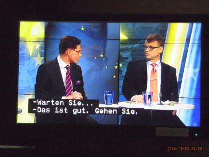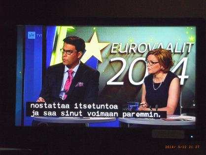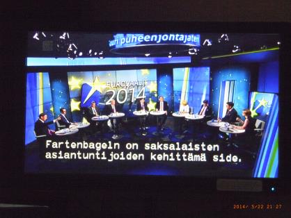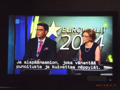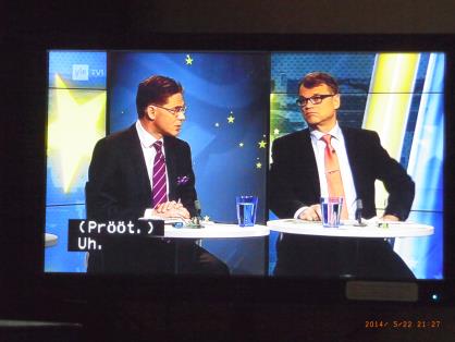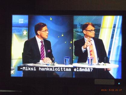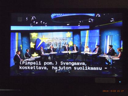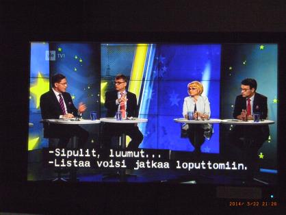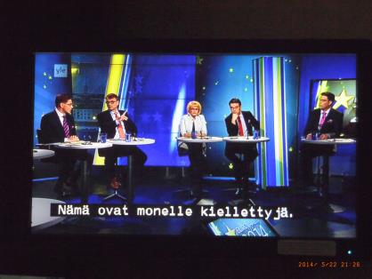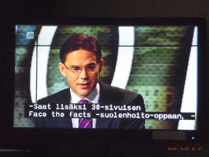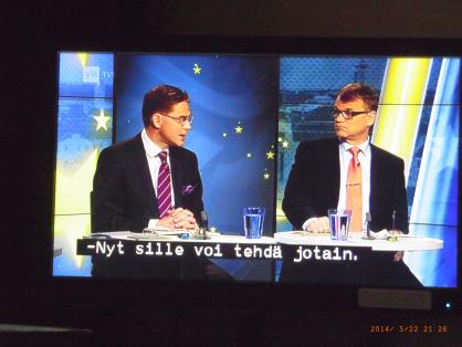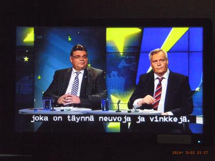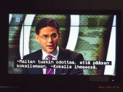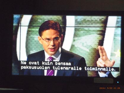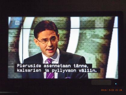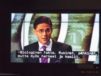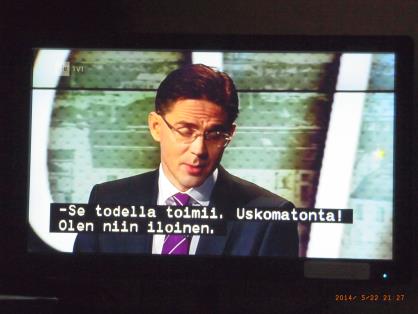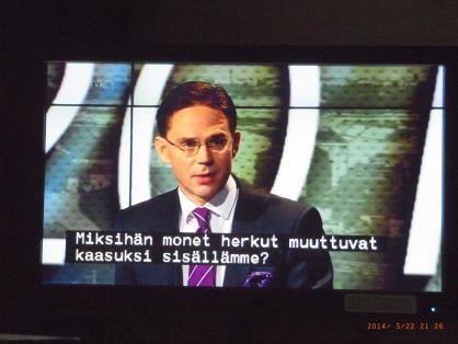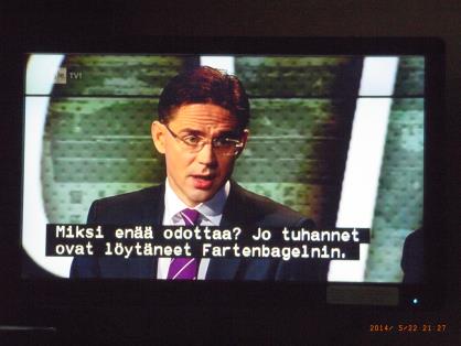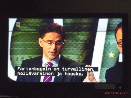Tänään keskiviikkona 2014-06-04 Helsingin Sanomat kertoo ja uskoo edelleen, että pääministeri ei tiennyt saamastaan väärästä tiedosta tässä vaalitentissä: "... perussuomalaisten johtaja ja ulkoasiainvaliokunnan puheenjohtaja Timo Soini toisti Kataisen virheen Ylen eurovaalitentissä. Soini sanoi Hornetin käyneen tunnistamassa venäläiskoneet. Vieressä istui puolustusministeri Carl Haglund, hiljaa. Haglund ei halunnut suorassa lähetyksessä korjata Soinin vääriä tietoja, kertoi Iltalehti tiistaina." Kuvat ovat TV1:n lähetyksestä ja tekstit toisen kanavan toisen ohjelman tekstityksestä. Iltalehti tiistaina 2014-06-03: Kaikki puoluepomot väärässä: "Eurovaalien alla Timo Soini (ps) luuli vaalitentissä, että Hornetit ehtivät ilmatilaloukkauksiin mukaan." ... "Vieressä istunut puolustusministeri Carl Haglund (r) ei Soinin tietoja korjannut eivät myöskään sisäministeri Päivi Räsänen (kd), ympäristöministeri Ville Niinistö vihr) tai pääministeri Jyrki Katainen (kok)." Katso myös! Pääministeri Jyrki Katainen kertoo 1. Kuvasarja |