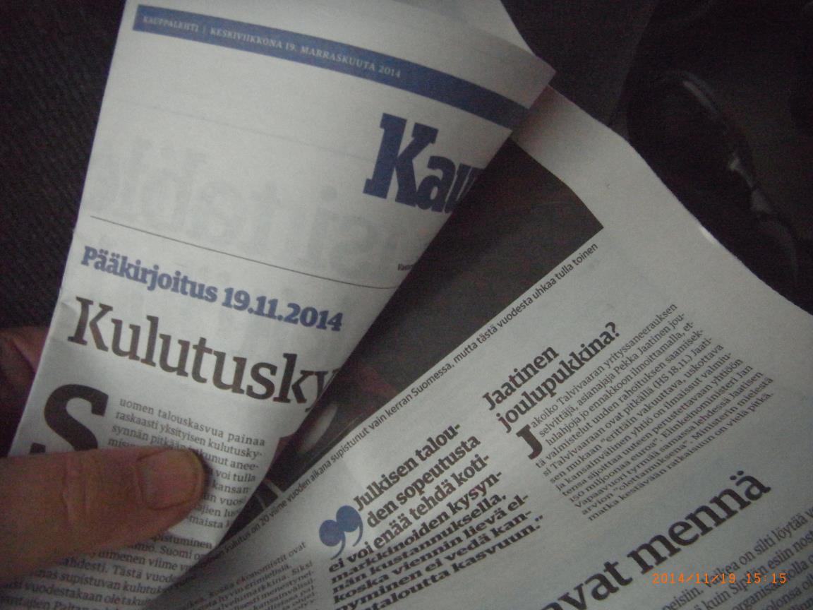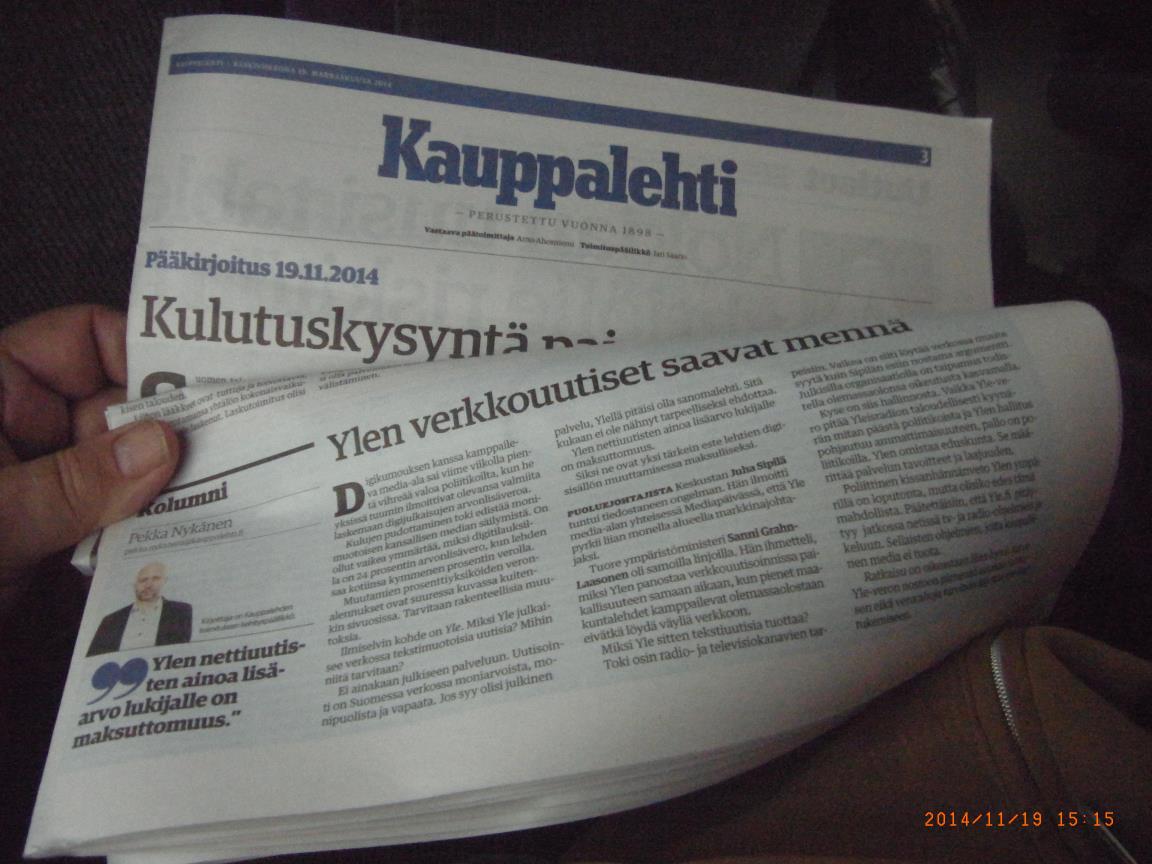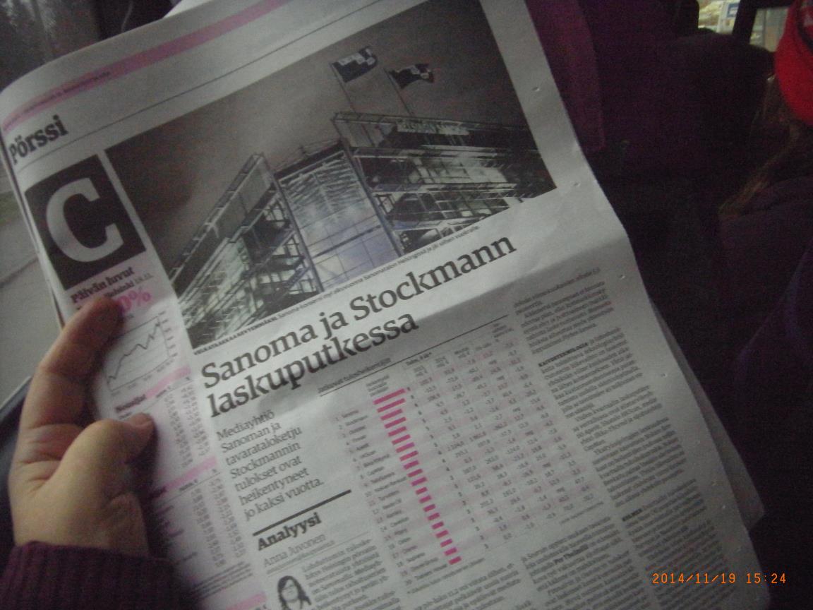 Linja-automatkalla koululaisia ja lehteä tarkkaillen keskiviikkona 19.11.2014 iltapäivällä 14:08 - 14:24. Siivoton pysäkki - Pyörätytöt - Järvimaisema - KL: Ylen verkkouutiset saavat mennä - Jaatinen joulupukkina - Nokian tabletti on yhtiölle riskitön hanke - Rahaa kassaan voisulaa juoden - Ilpo Kokkila: SRV on maksanut poikkeuksellisen paljon veroja - Pienryhmien diktatuuri on ottanut vallan - Mopotyttö - Koulukuljetukset - Sanoma ja Stockmann laskuputkessa. Keski-Suomi. Laukaa. Keskusta ja Vihtavuori. Keskiviikkona 19.11.2014. Kuvien kello elää vielä talviaikaa! Raw-kuvat: Pertti Manninen. Isonna! |