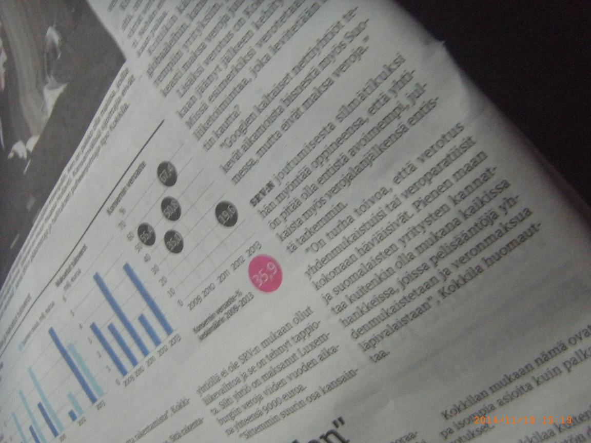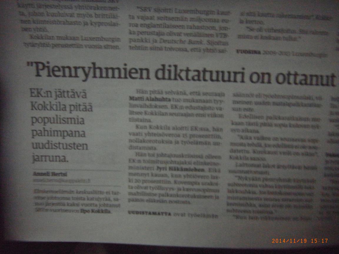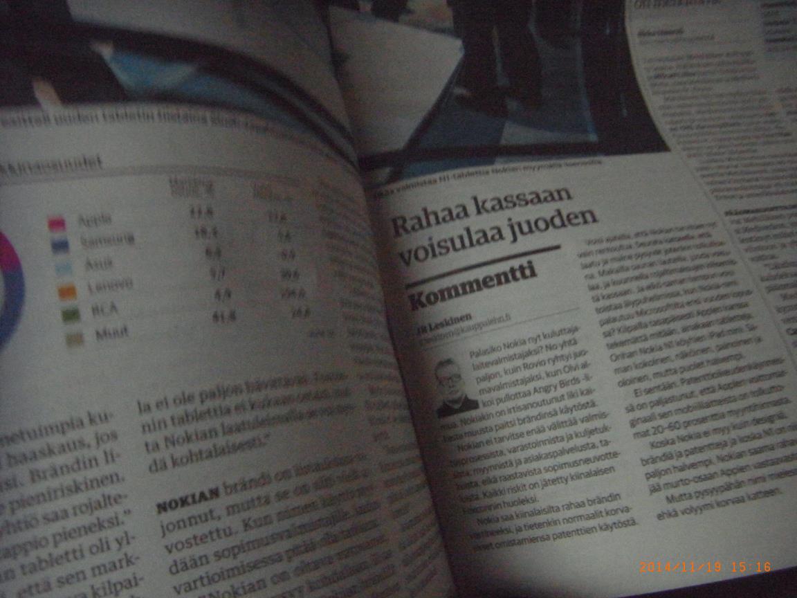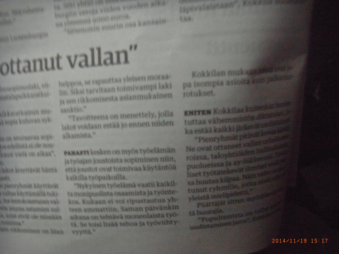 Linja-automatkalla koululaisia ja lehteä tarkkaillen keskiviikkona 19.11.2014 iltapäivällä 14:08 - 14:24. Siivoton pysäkki - Pyörätytöt - Järvimaisema - KL: Ylen verkkouutiset saavat mennä - Jaatinen joulupukkina - Nokian tabletti on yhtiölle riskitön hanke - Rahaa kassaan voisulaa juoden - Ilpo Kokkila: SRV on maksanut poikkeuksellisen paljon veroja - Pienryhmien diktatuuri on ottanut vallan - Mopotyttö - Koulukuljetukset - Sanoma ja Stockmann laskuputkessa. Keski-Suomi. Laukaa. Keskusta ja Vihtavuori. Keskiviikkona 19.11.2014. Kuvien kello elää vielä talviaikaa! Raw-kuvat: Pertti Manninen. Isonna! |