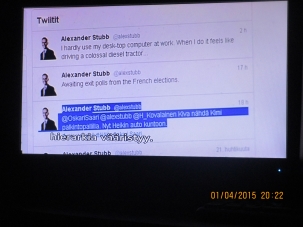 Kuvat: Pertti Manninen sunnuntaina 01.03.2015 17:21 - 17:22 Ylen lähetyksestä ja maanantaina 02.03.2015 08:00 - 11:13 ja perillä Helsingissä 12:59 ja tiistaina 03.03.2015 17:09 - 18:04 paluumatkalle valmistautuen ja matkan alussa Helsingin Mannerheimintiellä yläilmoista Onnibussin etupenkiltä. ISONNA! |