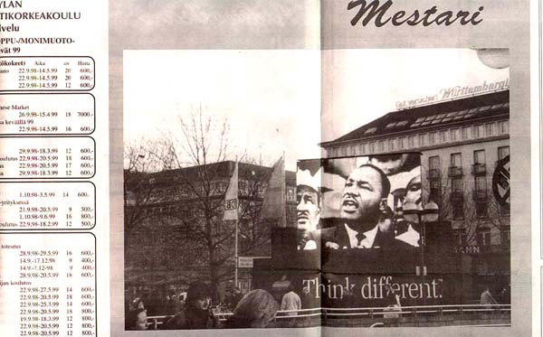 "I have a Dream". Aina kun esiin putkahtaa taistelija paremman maailman puolesta, hätkähdän. Astuessani ulos Hannoverin rautatieasemalta keväällä 1998 Martin Luther King oli vastassa IBM:n "Think different"-mainoksessa. Vaistomaisesti kohotin kamerani ja tallensin hetken. Julkaisin kuvan lähes aukeaman suuruisena mustavalkokuvana Jyväkäs-lehdessä, jonka päätoimittajana olin hetken, Annoin kuvalle nimen "Mestari" kunnioittaakseni arvostamaani ihmisoikeustaistelijaa. Vieressä pilkahtaa Jyväskylän ammattikorkeakoulun kurssimainos. Hannoverissa olin Cebit-messuilla ystävällisten ihmisten seurassa ja matkalta jäi hyvä maku suuhun. Kevät oli siellä jo pitkällä ja joinakin päivinä tarkeni istua ulkoterassilla. Tuulahdus Euroopasta, jossa en ollut moneen vuoteen käynyt, vaan jäänyt vangiksi tänne Pohjolan perukoille. Täällä oli tietenkin erilaista lämpöä. jota sain kyllä osakseni, tosin myös jäätävää pakkasta. Vuotta myöhemmin olin kypsä aloittamaan viikoittaisen nettilehden, joka sai nimekseen nettisanomat.com. "Kaikki