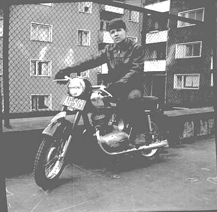 Pihan ensimmäinen moottoripyörä! Leon isoveli istuu ylväänä tsekkiläisen Jawan satulassa, verkkoaidan vierellä, asfalttiin piirrettyjen parpiruutujen valtiaana. Muistikuva
