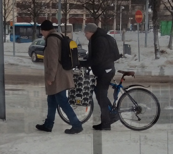 Suomalainen sitkeys. Pyöräänsä taluttaen ja kävelysauva mukanaan mies selviää arjen kauppareissuista kipeän jalan sen pahemmin vaivaamatta. Kuva |