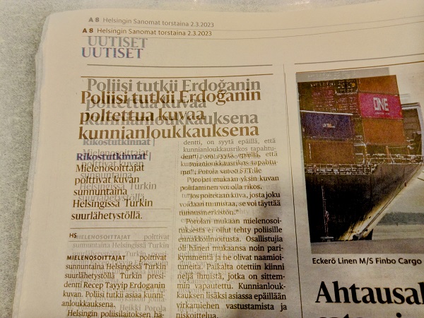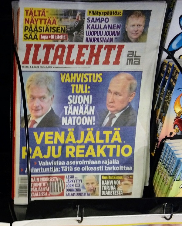 Lauantaina 22.4.2023. Hallitustunnustelut. Petteri Orpo tapaa Li Anderssonin Pikku-Kakkosen kuvin ja Ylen uutisten tekstein. Kuvasarja Tiistaina 18.4.2023. Kevään ensimmäiset. Sitruunaperhonen. - Joutsenpari. - Vesille venosen mieli, miksei omistajankin! - Avovettä. - Krookukset. - Oravien kisailu. - Kärpänen. Kuvat Keskiviikkona 12.4.2023. Arkistosivu: Etusivu 20 vuotta sitten torstaina 10.4.2003. Lue! Sunnuntaina 9.4.2023. Arkistokirjoitus. Kiirastorstaina 20. huhtikuuta 2000. Vanhassakirkossa ruttoon kuolleiden hautuumaan vieressä kuunneltiin maanantaina karmeita tarinoita. Lue! Lauantaina 8.4.2023. Rauhankyyhky. Sepelkyyhky istahti hetkeksi langalle kertomaan kevään saapumisesta. Kuva Perjantaina 7.4.2023. Pitkäperjantaina. Sopuisaa eloa. Käpytikka, kottarainen ja sepelkyyhky napostelevat vielä tarjoilua. Kuva Torstaina 6.4.2023. Kiirastorstaina. Lehtitelineeltä kiirastorstaina 6.4.2023 12:15. Kuvat Tiistaina 4.4.2023. Ilta-Sanomat: Historiallinen päivä. Tänään sotilasliittoon. Näin Nato muuttaa Suomea. Haavisto vei dokumentit Brysseliin. Iltalehti: Vahvistus tuli. Suomi tänään Natoon! Venäjältä raju reaktio. Vahvistaa aseavoimiaan rajalla. Asiantuntija: Tätä se oikeasti tarkoittaa. Kuvat |
