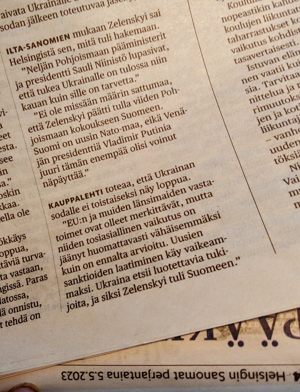 Pääkirjoitus: Ukrainan verinen tie Natoon. Venäjän julma ja verinen hyökkäys naapurimaahansa Ukrainaan jatkuu ja jatkuu. Nyt on menossa jo 168. päivä. Media käyttää tästä sodasta nimitystä "Ukrainan sota". Pikemminkin pitäisi käyttää nimitystä "Venäjän sota". Mitään rauhanneuvotteluja ei vielä käydä. Nato-maat ja Natoon