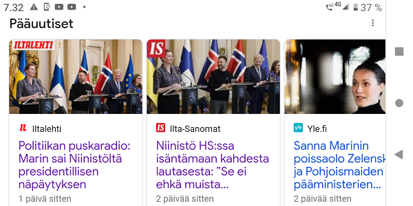 Lauantaina 22.4.2023. Hallitustunnustelut. Petteri Orpo tapaa Li Anderssonin Pikku-Kakkosen kuvin ja Ylen uutisten tekstein. Kuvasarja Tiistaina 18.4.2023. Kevään ensimmäiset. Sitruunaperhonen. - Joutsenpari. - Vesille venosen mieli, miksei omistajankin! - Avovettä. - Krookukset. - Oravien kisailu. - Kärpänen. Kuvat Keskiviikkona 12.4.2023. Arkistosivu: Etusivu 20 vuotta sitten torstaina 10.4.2003. Lue! Sunnuntaina 9.4.2023. Arkistokirjoitus. Kiirastorstaina 20. huhtikuuta 2000. Vanhassakirkossa ruttoon kuolleiden hautuumaan vieressä kuunneltiin maanantaina karmeita tarinoita. Lue! Lauantaina 8.4.2023. Rauhankyyhky. Sepelkyyhky istahti hetkeksi langalle kertomaan kevään saapumisesta. Kuva Perjantaina 7.4.2023. Pitkäperjantaina. Sopuisaa eloa. Käpytikka, kottarainen ja sepelkyyhky napostelevat vielä tarjoilua. Kuva Torstaina 6.4.2023. Kiirastorstaina. Lehtitelineeltä kiirastorstaina 6.4.2023 12:15. Kuvat Tiistaina 4.4.2023. Ilta-Sanomat: Historiallinen päivä. Tänään sotilasliittoon. Näin Nato muuttaa Suomea. Haavisto vei dokumentit Brysseliin. Iltalehti: Vahvistus tuli. Suomi tänään Natoon! Venäjältä raju reaktio. Vahvistaa aseavoimiaan rajalla. Asiantuntija: Tätä se oikeasti tarkoittaa. Kuvat |