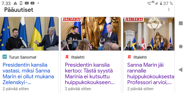 2023 helmikuu. Perjantai 3.2.2023. Pääministeri Marin otti johtajan roolin:"Suomi ja Ruotsi jatkavat käsi kädessä Natoon." Lue! Perjantai 3.2.2023. Taipui ja osin taittuikin. Kuva Tiistaina 7.2.2023. Iltalehti: Presidentti Sauli Niinistö on joutunut vaihtamaan nimensäkin ... Lue! Perjantaina 10.2.2023. Hupsaus: Nadonlukua tammikuun lopulla 2023. Lue! Lauantaina 11.2.2023. 20 vuotta sitten Lue! - 15 vuotta sitten Lue! - 10 vuotta sitten Lue! - 5 vuotta sitten Lue! Lauantaina 11.2.2023. Vuosi sitten. Arkisto 27.2.2022. Lue! Lauantaina 11.2.2023. 20 vuotta sitten. Torstaina 13.2.2003. Lue! Sunnuntaina 12.2.2023. "Puhun rauhasta ymmärtäen sen, että tällä hetkellä ei ole minkäänlaisia edellytyksiä rauhaan." Presidentti Sauli Niinistö. Lue! Sunnuntaina 12.2.2023. Ukrainaan ei lähtenyt Suomesta vuosi sitten "pehmeää pakettia". Lue! Sunnuntaina 19.2.2023. Marin: Venäjä olisi pitänyt eristää jo aiemmin - Niinistö: Suomen reaktio näkyi teoista. Lue! Sunnuntaina 19.2.2023. Arkisto 2005. Leif Salmén. Voiton päivä? Kolumni. Lue! Tiistaina 21.2.2023. Tähän on tultu. Putin: Venäjä jäädyttää ydinasesopimuksen tai lopettaa noudattamisen. Lue! Tiistaina 28.2.2023. Kalevalan päivän liputusta 2013 ja 2023. |