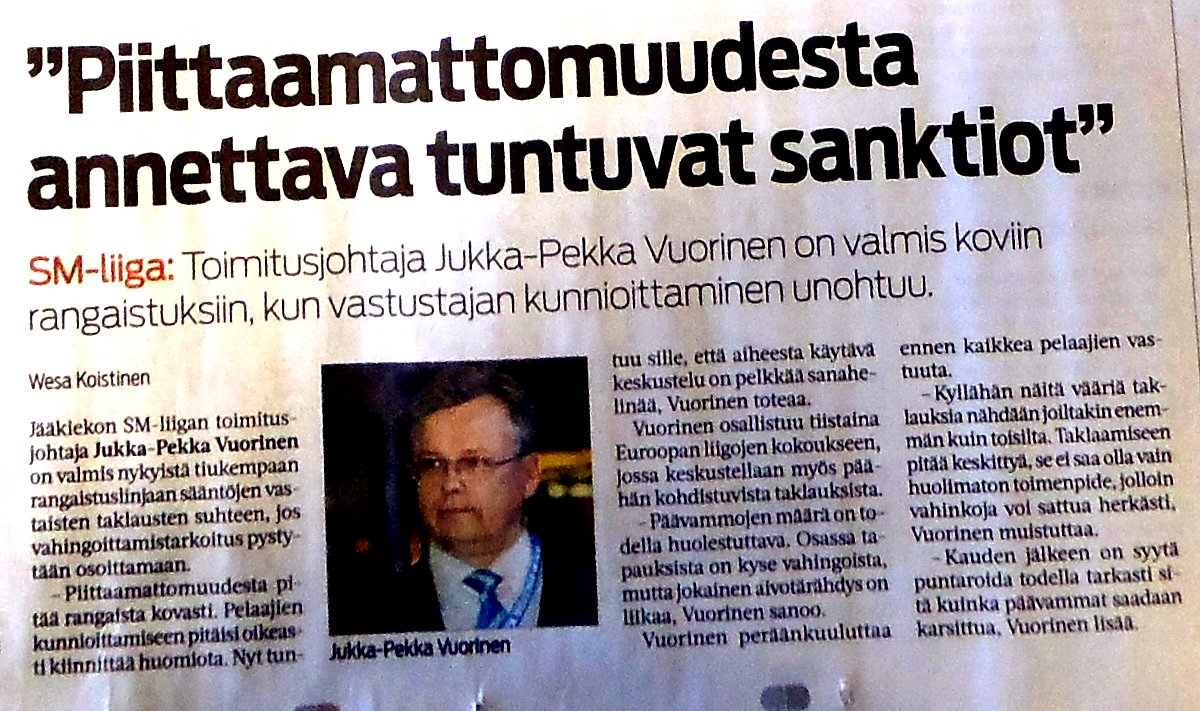 Arkisto 2011 Käskyttikö Harkimo teloituksen? Jääkiekko on vauhdikas peli niin kiekkokaukalossa kuin sen ulkopuolellakin. Se on viihdettä ja bisnestä urheilun nimellä. Siinä on sääntönsä pelaajille, joita tuomarit sitten vahtivat ja määräävät rangaistuksia rikkeistä. Säännöt on tietenkin tehty pelin ja pelaajien suojelemiseksi. Lajin harrastajat pitävät siihen kuuluvana erilaiset nyrkkitappelut ja kärhämät. Ne ovat siis sallittuja, toisin kuin esim. jalkapallossa, nyrkin iskusta ja läppäisystäkin joutuu armotta suihkuun! Tällaiseen