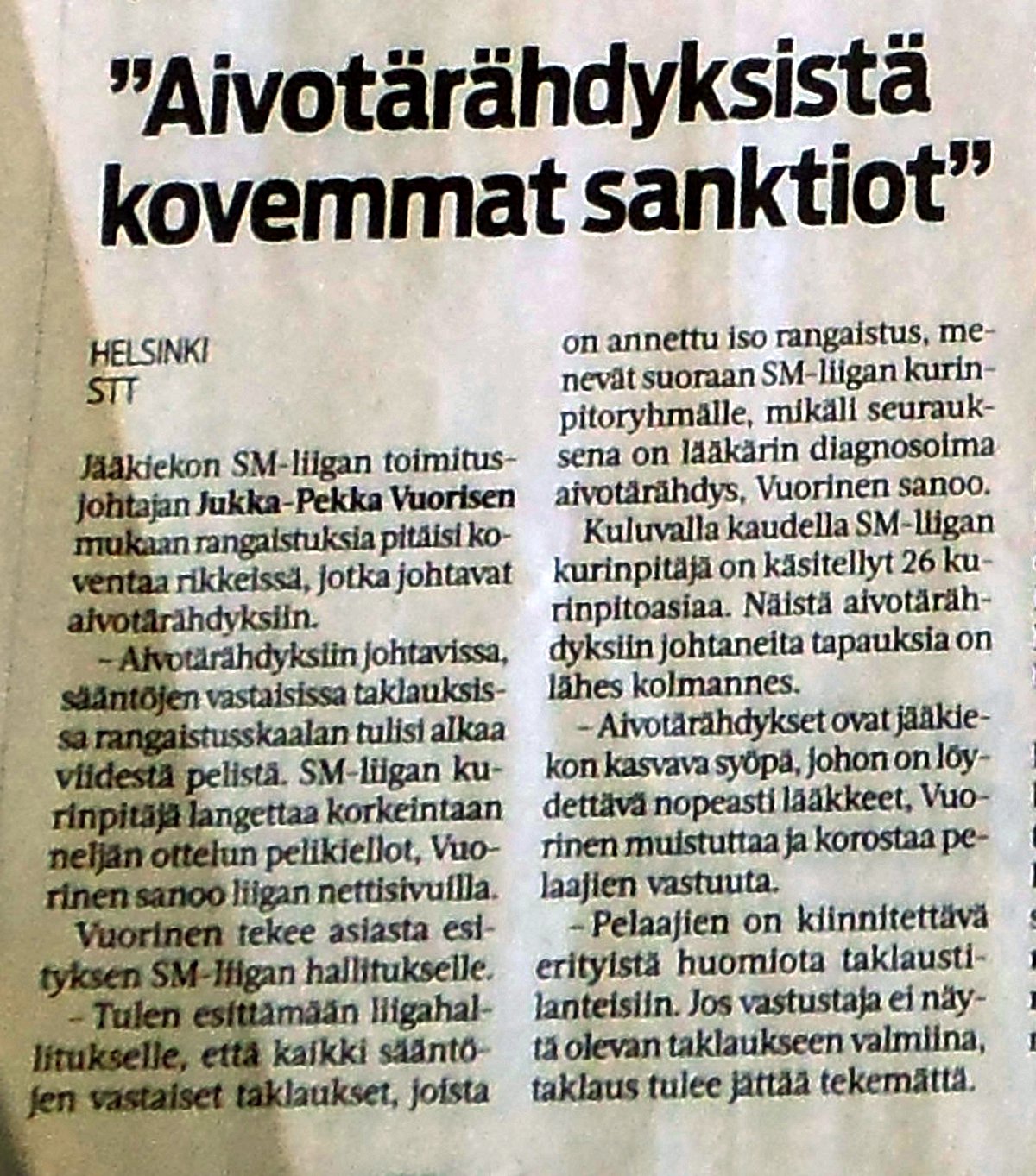jotka eivät vertakaan kavahda. Harry Harkimon taustaan hyvin sopii tupakkamannekiinina toimiminen aikoinaan, ja olutmannekiinina toimiminen nykyään. Ahneus oli viime syksynä jopa niin suuri, että lauantain iltapäivällä aikaisemmin olleet ottelut siirrettiin ”myöhäisiltaan” perheiden ulottumattomiin, jotta olutta saataisiin myytyä enemmän. Oikeastaan tämä olikin hyväksi, koska ei kai siinä kovin ylevää ole, että lapsia viedään tappeluita katsomaan. Hintakin on aivan kauhea koko (köyhälle) perheelle. Mikael Granlundin teloitus. Luotan asiantuntijaan, joka tietenkin asetti itsensä likoon aika rohkeasti. UrhoTV:n kommentaattorina toiminut Juhani Tamminen piti Jokerien kapteenin Ossi Väänäsen tekemää taklausta törkeänä Mikael Granlundin päähän kohdistuneena iskuna, josta olisi hänen mielestään pitänyt lähettää Väänänen suihkuun. Ohjelman lopussa Väänänen puolustautui ja piti luonnollisena, että hänen piti mennä kovaa tilanteeseen. Granlundin loukkaantumista hän ei omien sanojensa mukaan huomannut. Aina kova työntö maalin edessä voi johtaa maalirautoihin törmäämiseen. Tässä sattui nyt niin, että Granlund sai siis kaksoisiskun, ensin Väänäsen ja sitten kaatuessaan maalin yläputken. Granlund oli pitkään poissa kuvioista aikaisemman aivotärähdyksensä takia ja voi olla, että tässä tuli nyt pelaajauran loppu. Seuraava isku voi olla jo kohtalokas jo hengenkin säilymisen kannalta. Käskytys? Tämä on tietenkin kysymysmerkillä, mutta jääkiekkoa paremmin tuntevat voinevat aistia, että Väänänen teki sen mitä häneltä odotettiin: Granlundin eliminoimisen. Ellei sitten sanallisena, niin alitajullisena käskyttäjänä toimi Jokerien valmentaja Erkka Westerlund, jonka käskyttäjänä, jollei sanallisena niin ainakin alitajuisena Jokerien omistajana esiintyvä Harry Harkimo. Harry ”Hjallis”