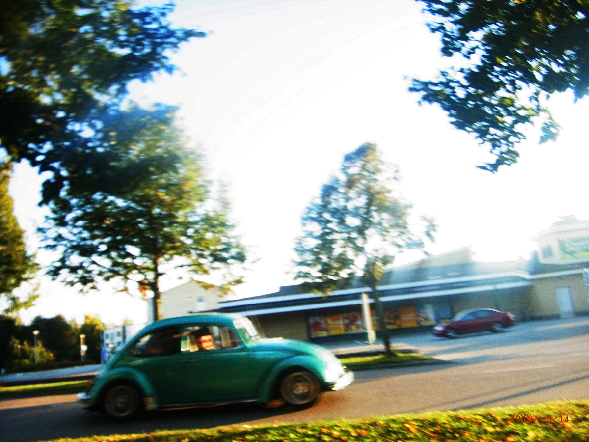 Kuvassa vanha, alkuperäisin kilvin varustettu kuplavolkkari kiitää rauhallisesti Laukaan pääkatua, joka on välillä aivan autio.Kaupat, muut kuin Siwa, ovat sulkeneet ovensa, niin K-Kaupan vieressä oleva Alkokin. R-kioskilla ihmiset tekevät hankintojaan ostaen lehtiä ja purtavaa, toiset syytävät kolikoitaan tai tilejään pelikoneissa. |