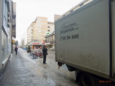 "Jakopalvelu" jäisellä kadulla keskipäivällä klo 12:00 torstaina 2013-12-12 Jyväskylässä Väinönkadulla toistaiseksi vain vapaaehtoisen seurantajärjestelmän palvelemana. Kuva: Pertti Manninen. isonna! - www.jakopalvelu.com |
